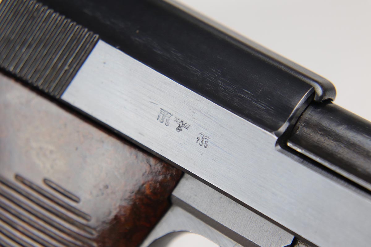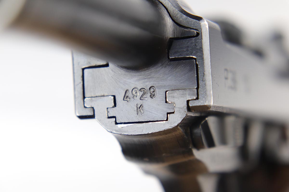 5/17/18 – This is a near-mint Mauser P.38 from 1943.  All original and matching with 98+% original blue, with only minor muzzle wear.  Excellent reddish brown grips and correct Mauser magazine.  Excellent bore and proper mechanics, including de-cocker.