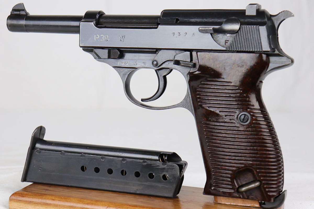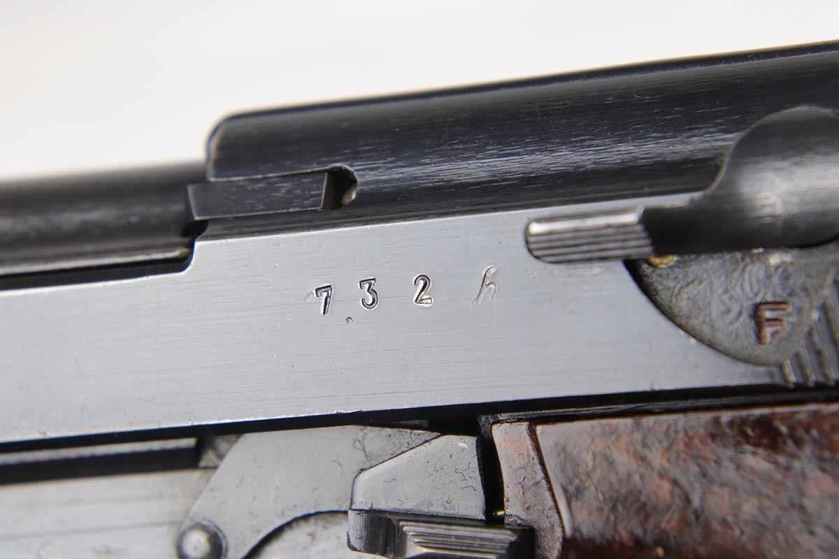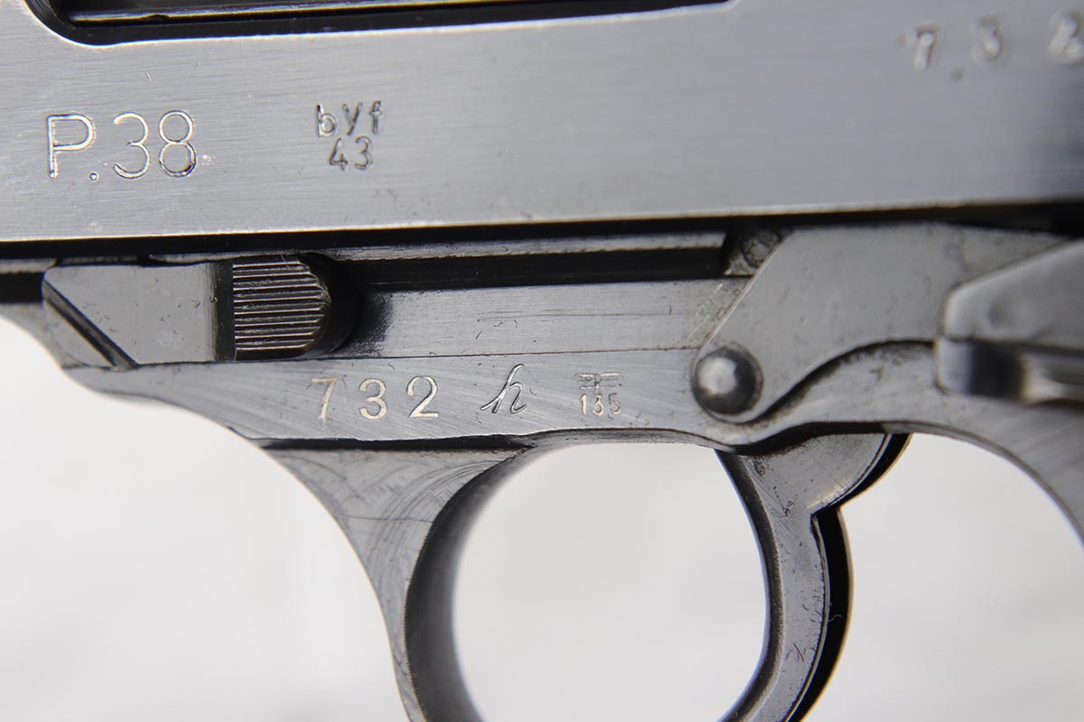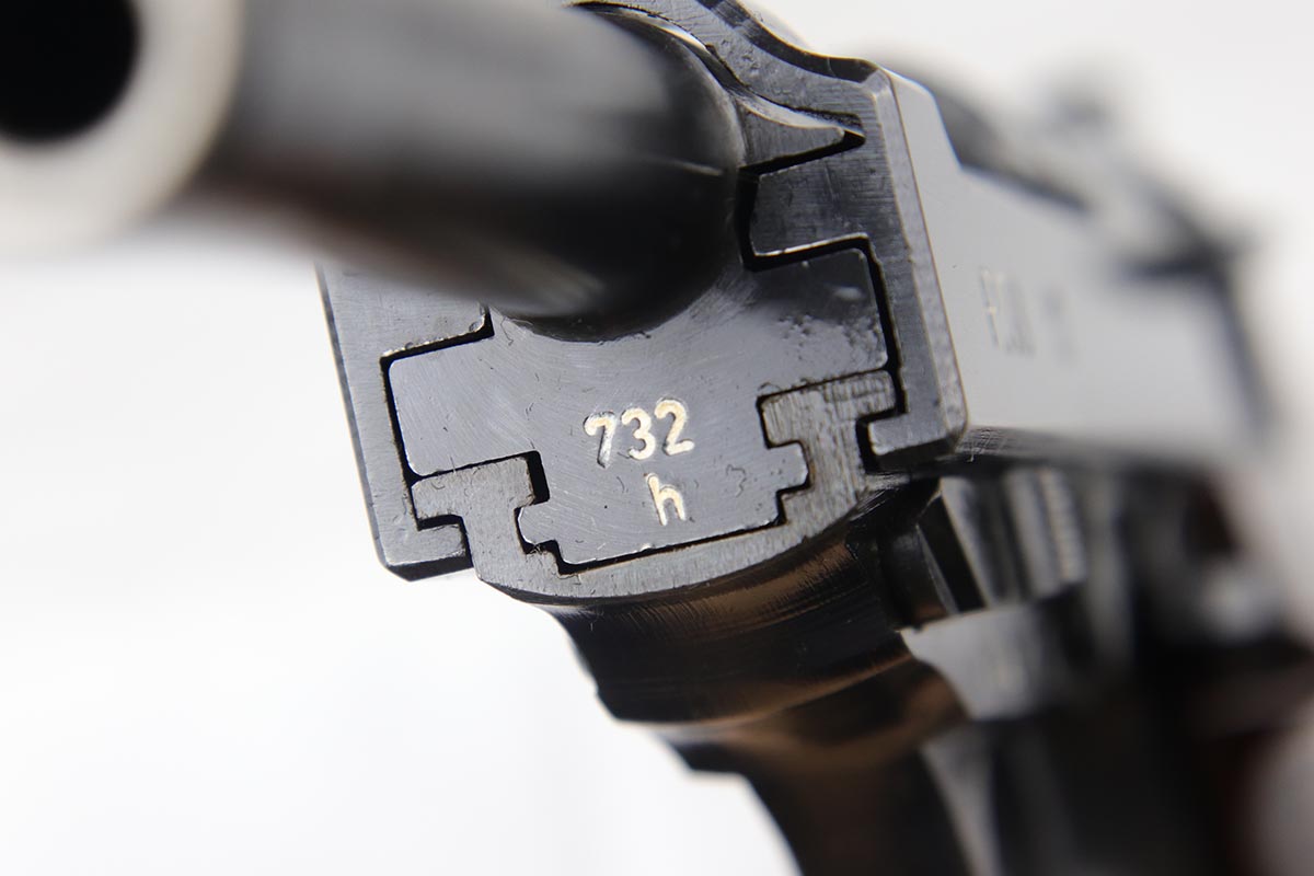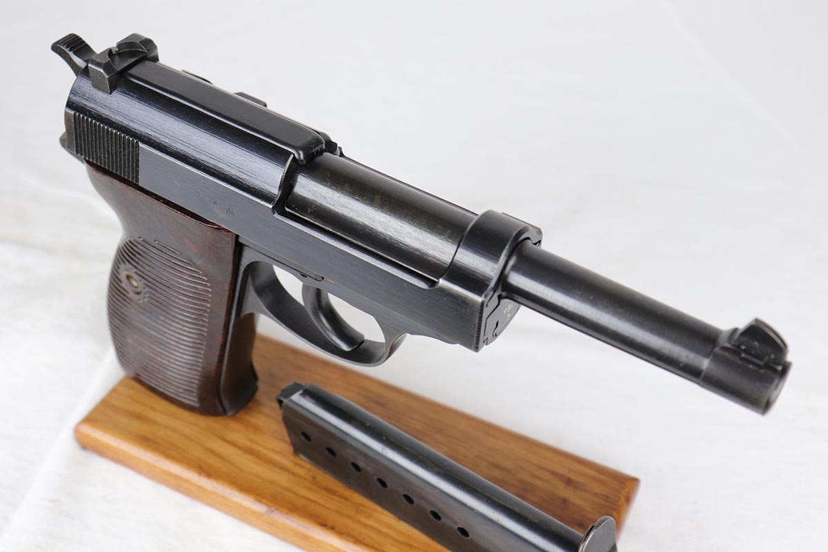 10/18/18 – This is a minty example of an original and matching Nazi Mauser P.38 from 1943. The bluing rates at 98-99% with minor muzzle wear and a little bit of finish loss on the front edges of the slide. Terrific reddish grips and a nice, shiny bore. Proper functionality, including de-cocker. Mauser magazine is slightly tight in the gun.