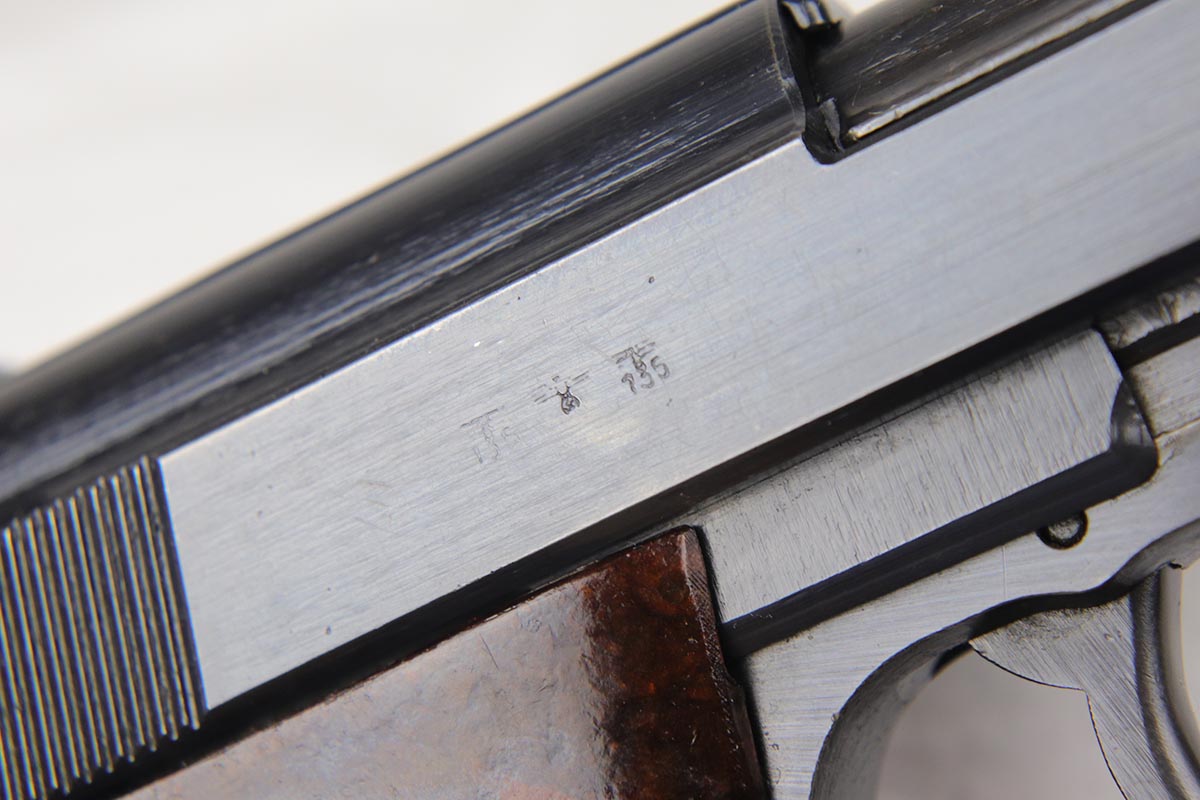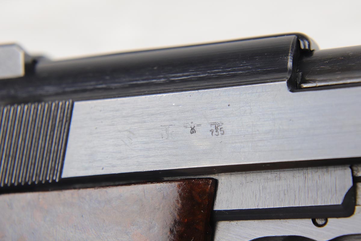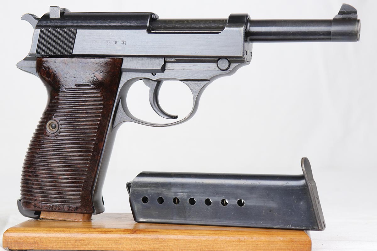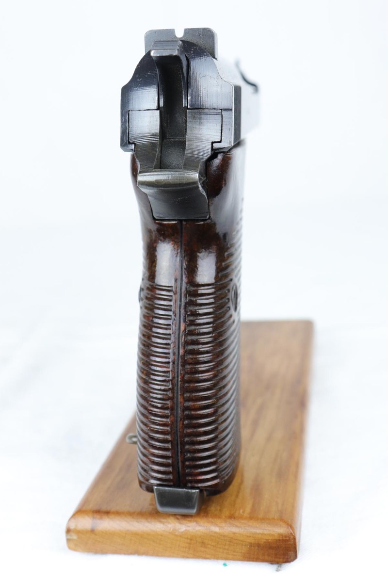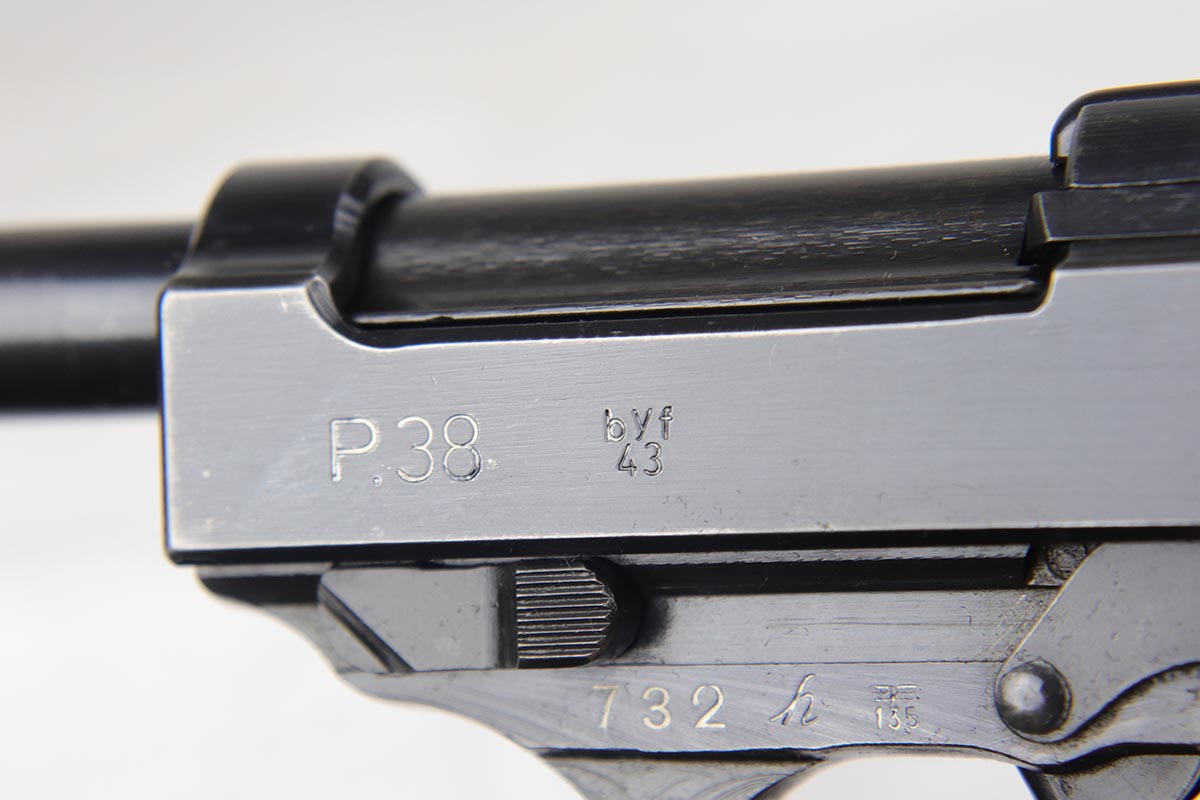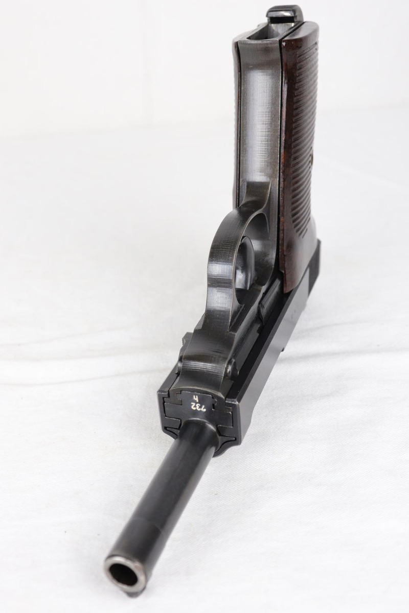 10/18/18 – This is a minty example of an original and matching Nazi Mauser P.38 from 1943. The bluing rates at 98-99% with minor muzzle wear and a little bit of finish loss on the front edges of the slide. Terrific reddish grips and a nice, shiny bore. Proper functionality, including de-cocker. Mauser magazine is slightly tight in the gun.