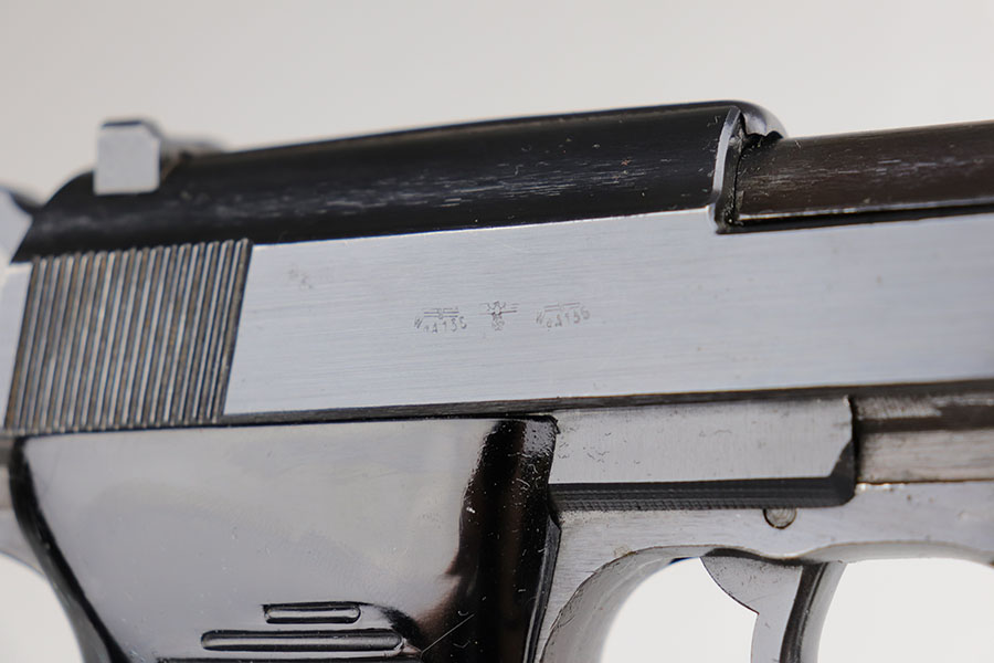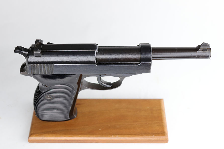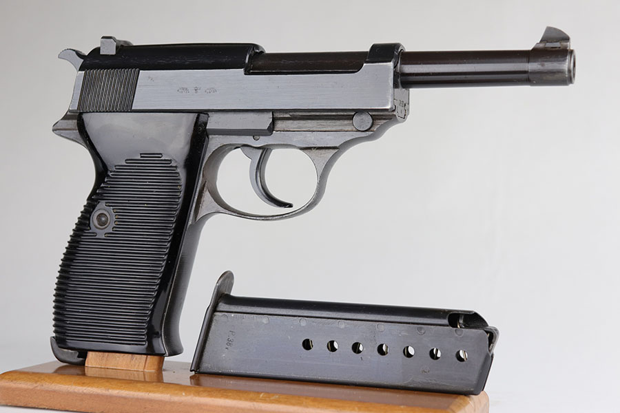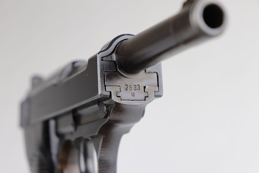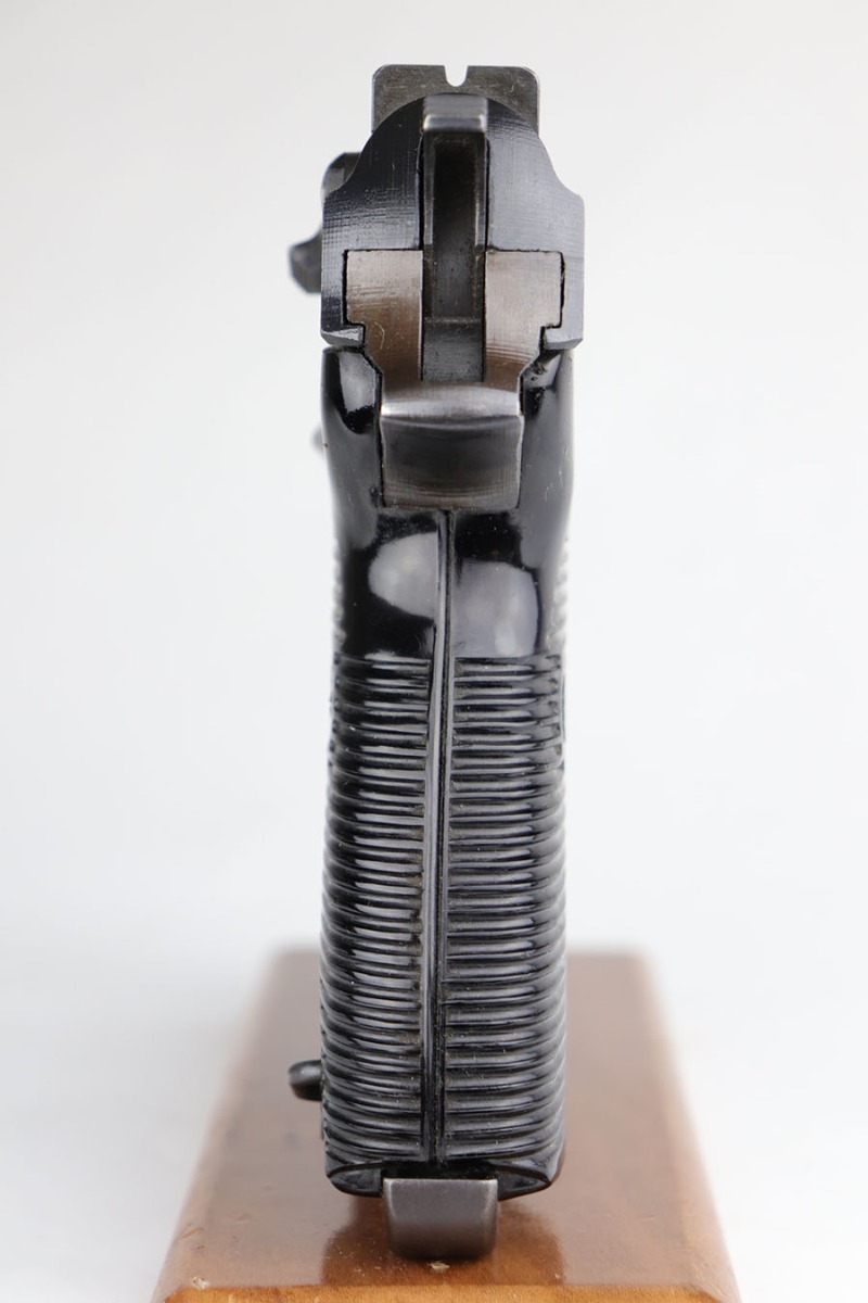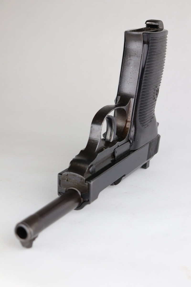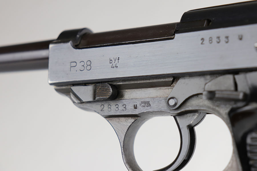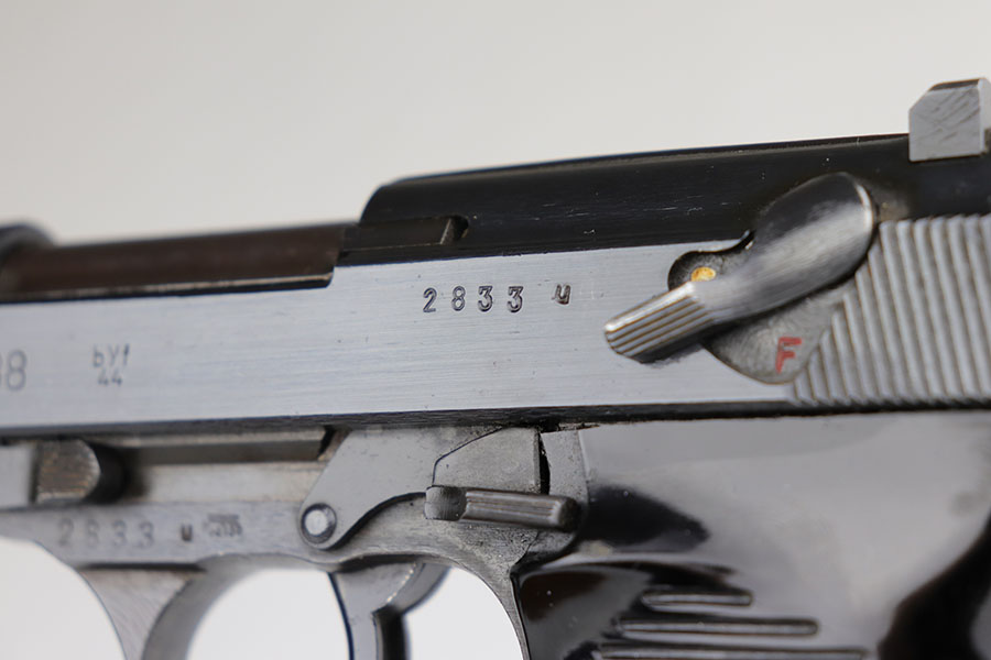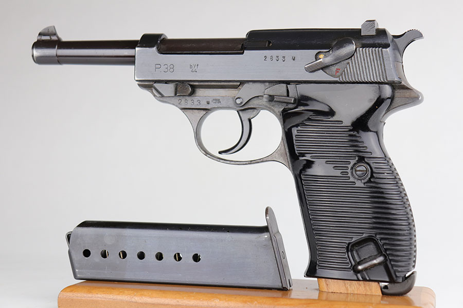 6/12/20 – This is a near-mint Mauser P.38 from June of 1944. It has 98-99% of the original military blue with just a bit of high edge wear on the muzzle and slide. Minty bore and excellent black grips. Proper mechanics, including de-cocker. Original Mauser magazine.