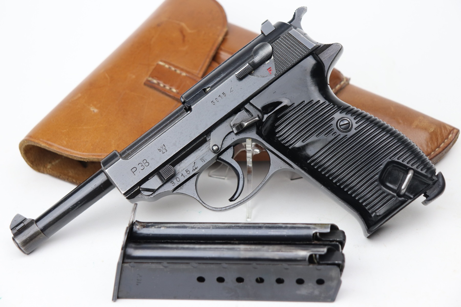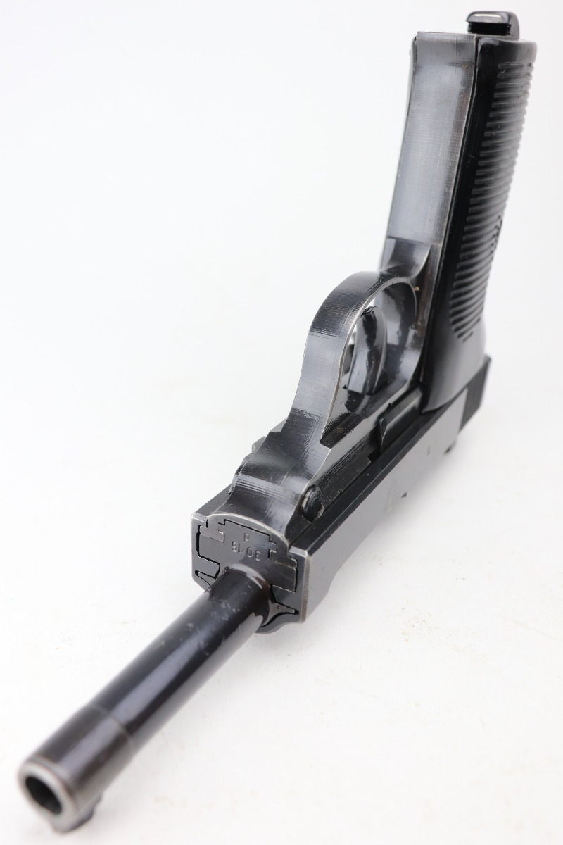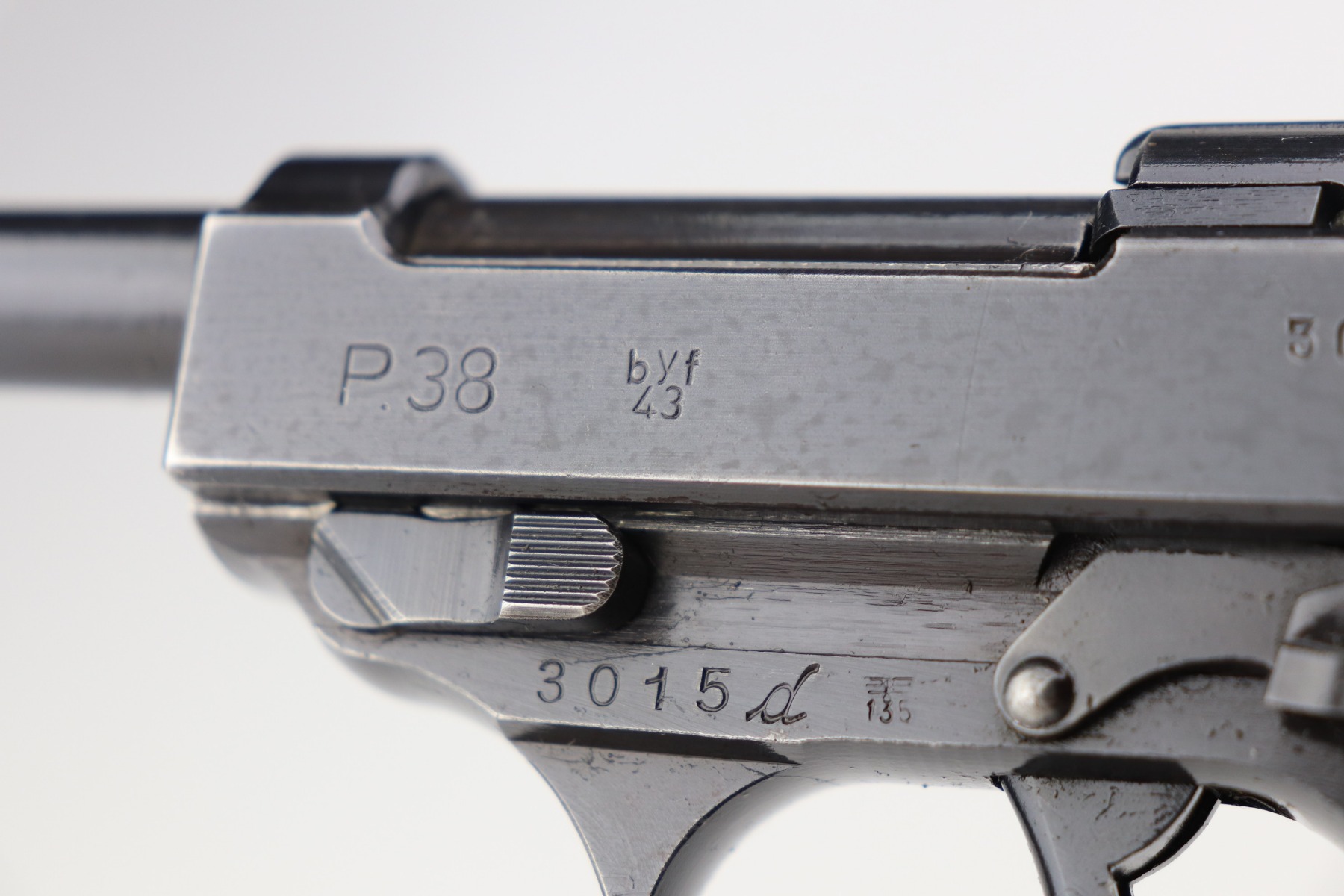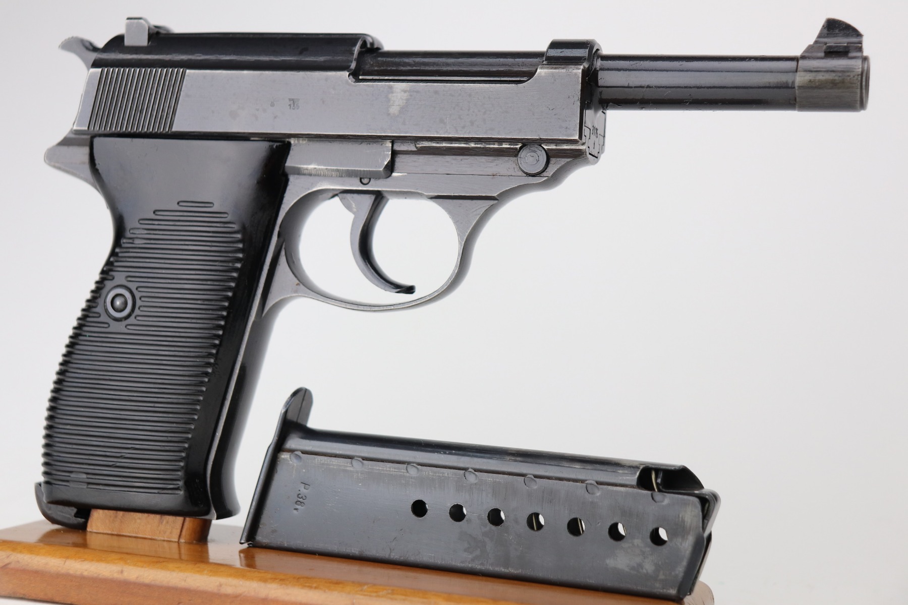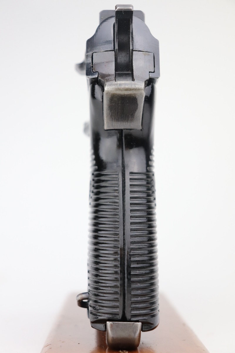 3/4/21 – This is a minty example of a Mauser P.38 rig issued to the Nazi military in 1943. This one is all matching and has the proper “Eagle 135” military proofs. The rig comes with two period-correct magazines and a generic un-marked holster. The holster looks to be period-correct but can’t say for sure. The gun has retained about 98% of its original dust-blue finish. There is just very minor thinning on the front strap and a hint of wear around the muzzle. While there isn’t much actual finish loss, tiny dots of oxidation can be seen throughout. Excellent grips. Excellent bore – shiny with strong rifling and minor freckling here and there. De-cocker is functional.