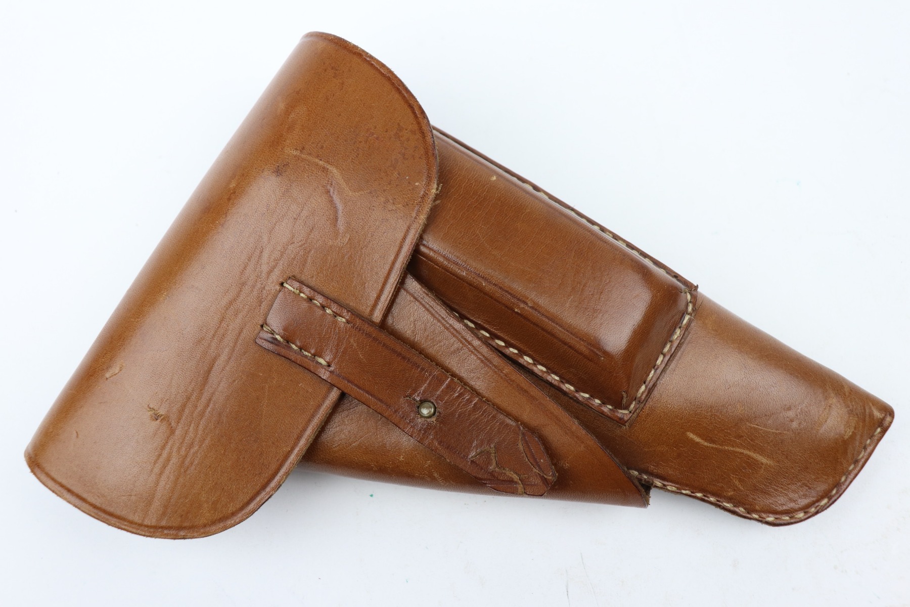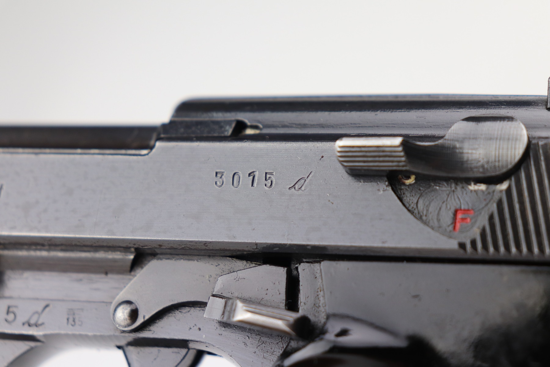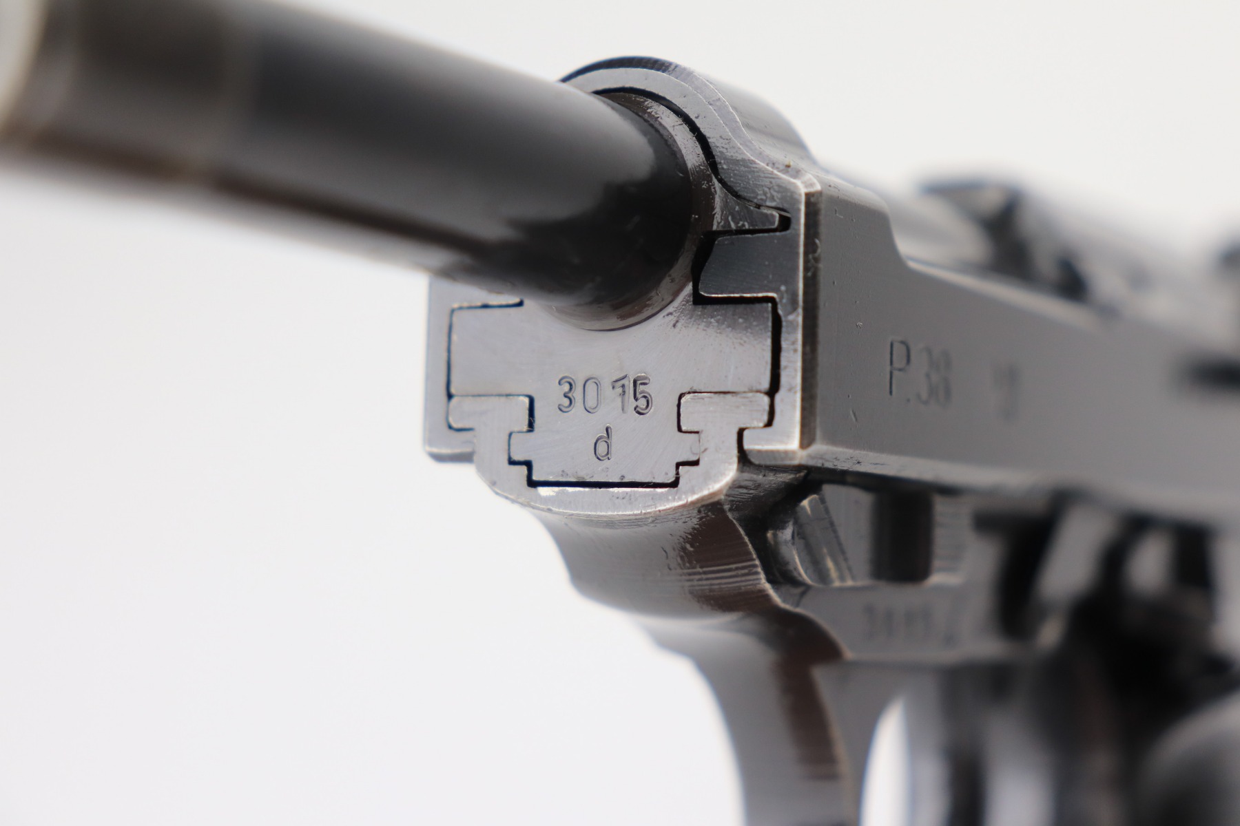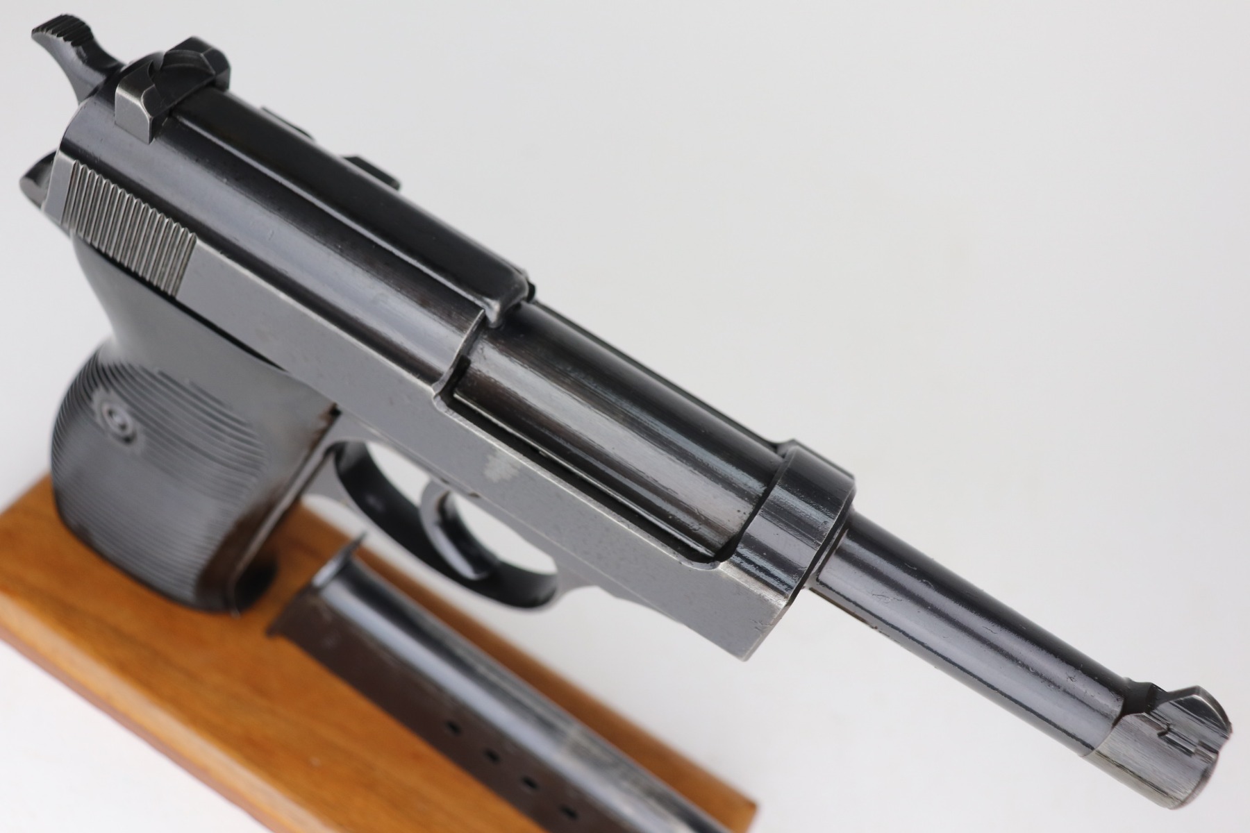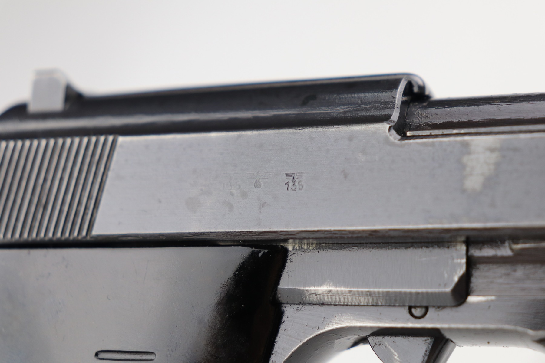 3/4/21 – This is a minty example of a Mauser P.38 rig issued to the Nazi military in 1943. This one is all matching and has the proper “Eagle 135” military proofs. The rig comes with two period-correct magazines and a generic un-marked holster. The holster looks to be period-correct but can’t say for sure. The gun has retained about 98% of its original dust-blue finish. There is just very minor thinning on the front strap and a hint of wear around the muzzle. While there isn’t much actual finish loss, tiny dots of oxidation can be seen throughout. Excellent grips. Excellent bore – shiny with strong rifling and minor freckling here and there. De-cocker is functional.