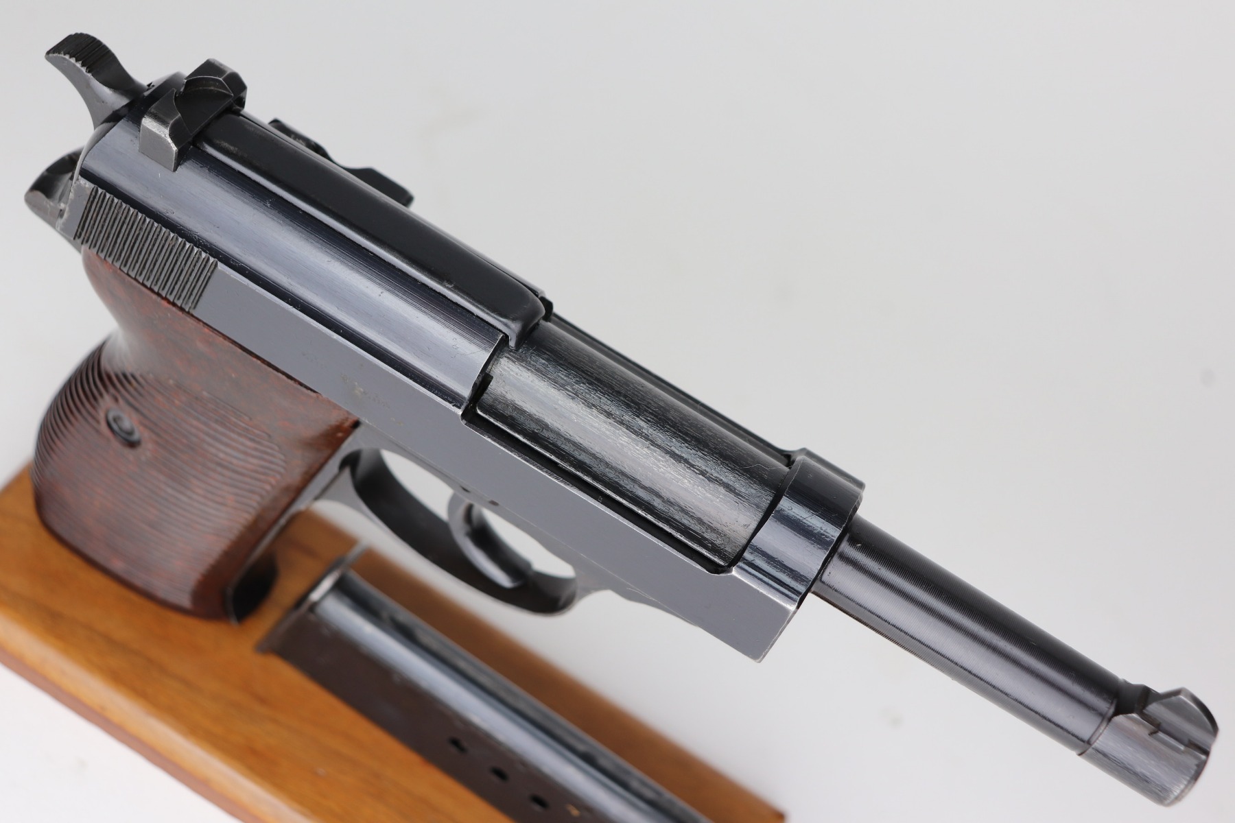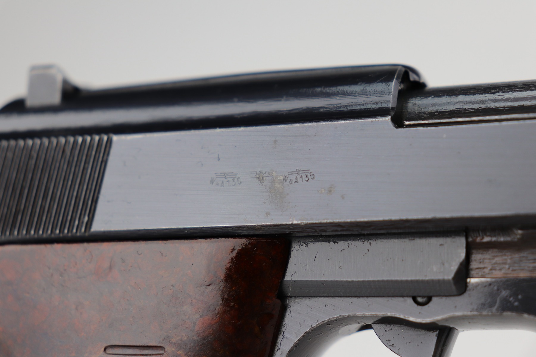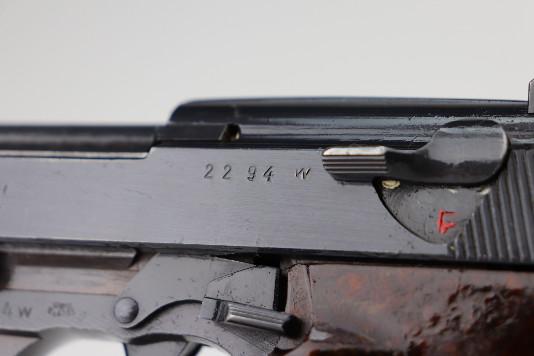 3/17/21 – This is a minty example of a Mauser P.38 rig issued to the Nazi military in 1944. It is all matching and has the proper “Waffen 135” military proofs. The rig comes with an excellent 1943-dated hard shell holster and two period-correct magazines. It has retained about 98% of its original finish. There is just a hint of wear around the muzzle, high edges of the slide, and on the top of the barrel through the ejection port. Very small area of minor oxidation on the right side of the slide. Comes with excellent grips. Excellent bore – shiny with strong rifling. De-cocker is functional.