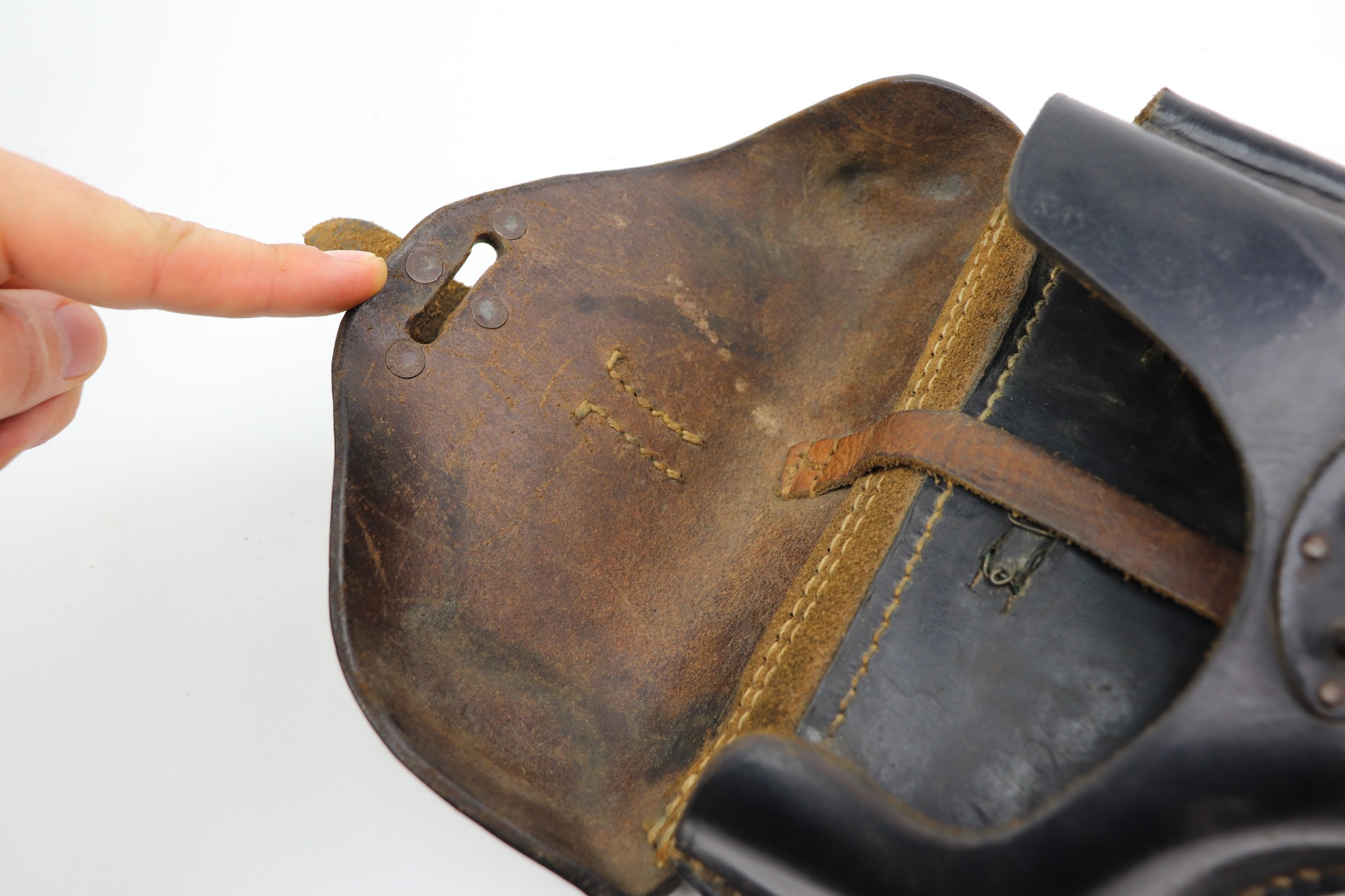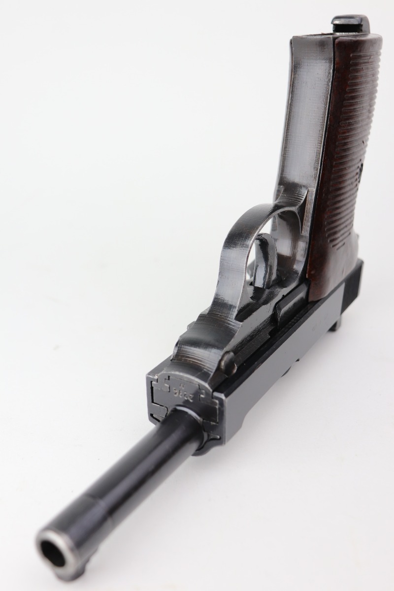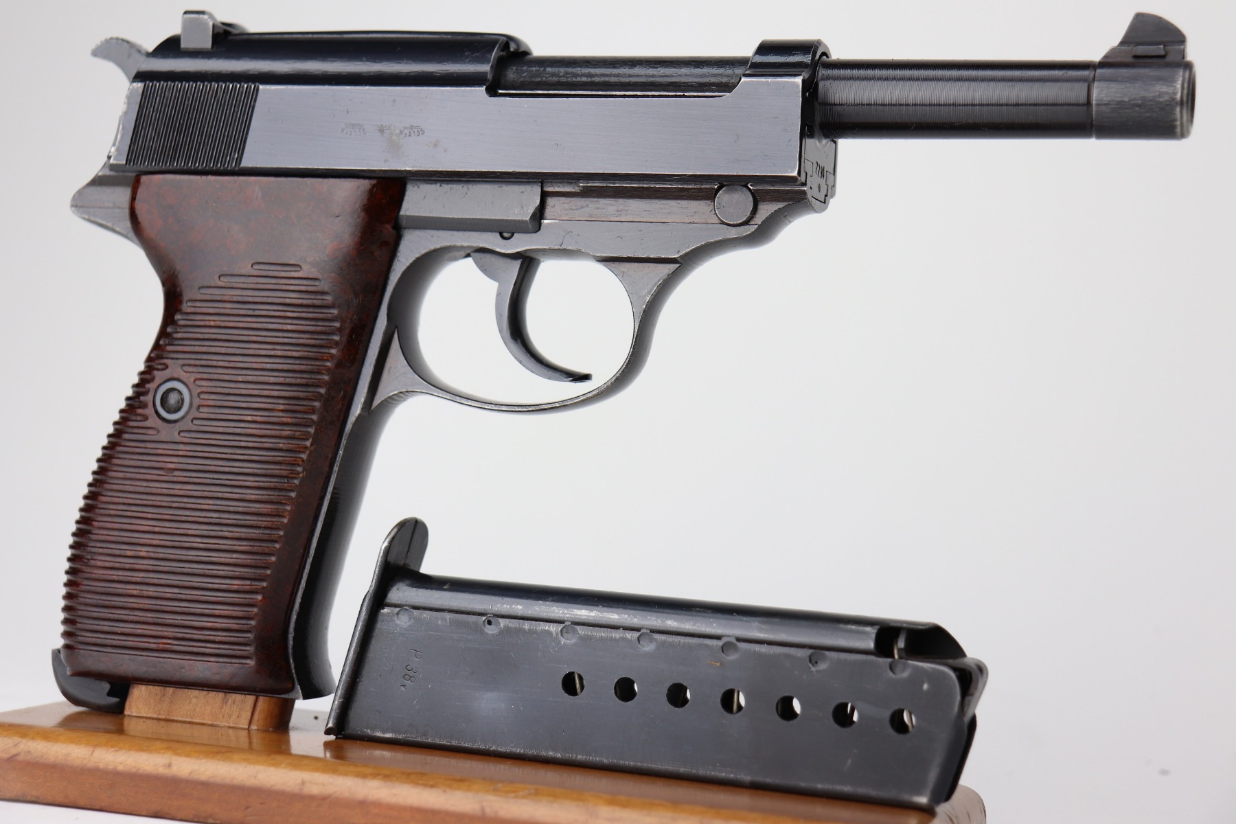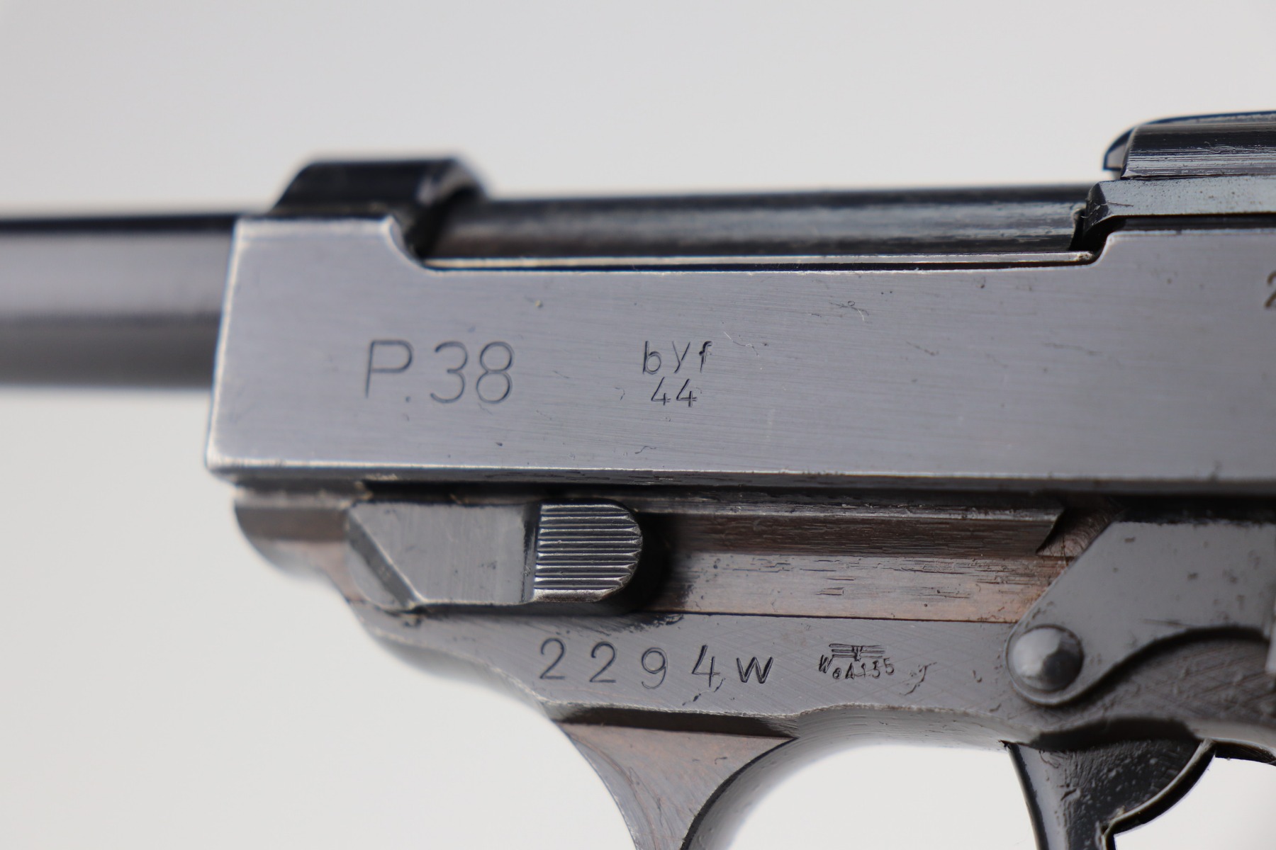 3/17/21 – This is a minty example of a Mauser P.38 rig issued to the Nazi military in 1944. It is all matching and has the proper “Waffen 135” military proofs. The rig comes with an excellent 1943-dated hard shell holster and two period-correct magazines. It has retained about 98% of its original finish. There is just a hint of wear around the muzzle, high edges of the slide, and on the top of the barrel through the ejection port. Very small area of minor oxidation on the right side of the slide. Comes with excellent grips. Excellent bore – shiny with strong rifling. De-cocker is functional.