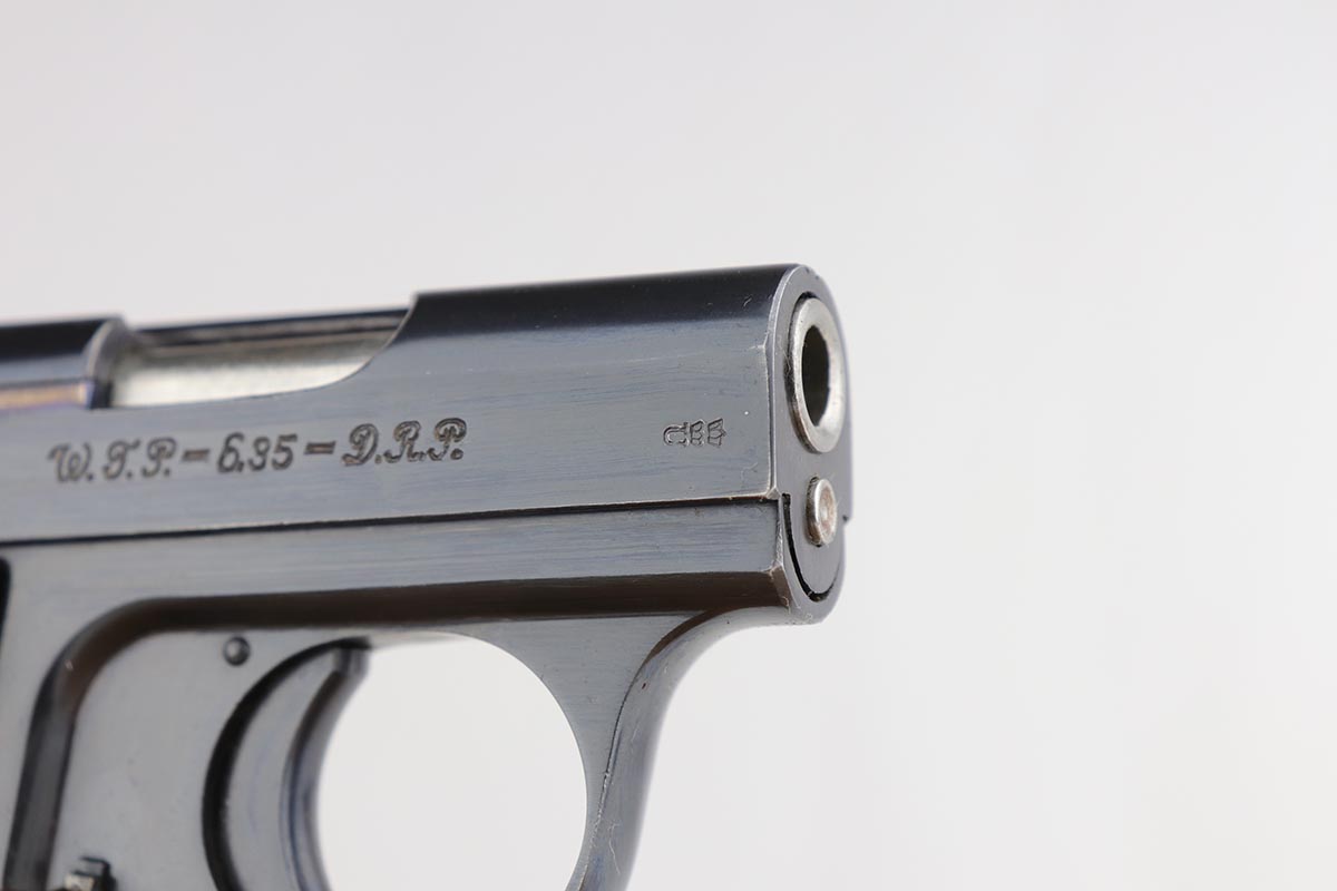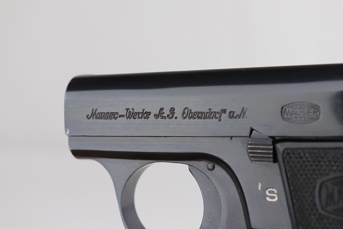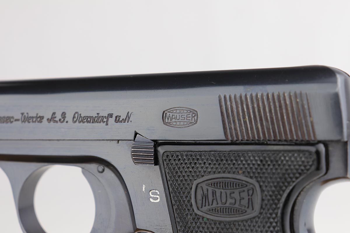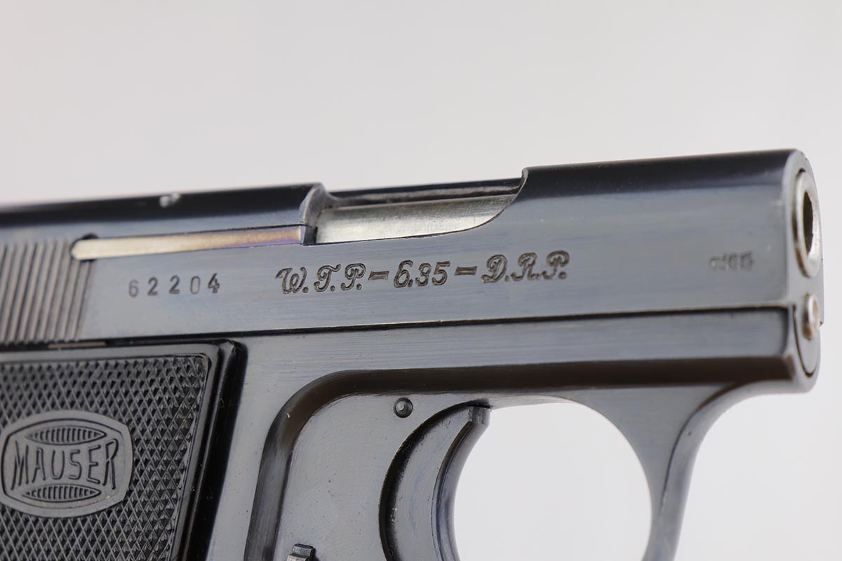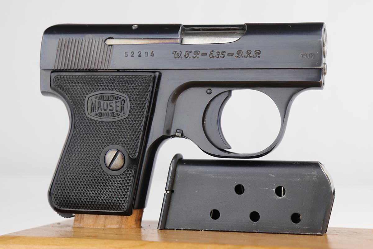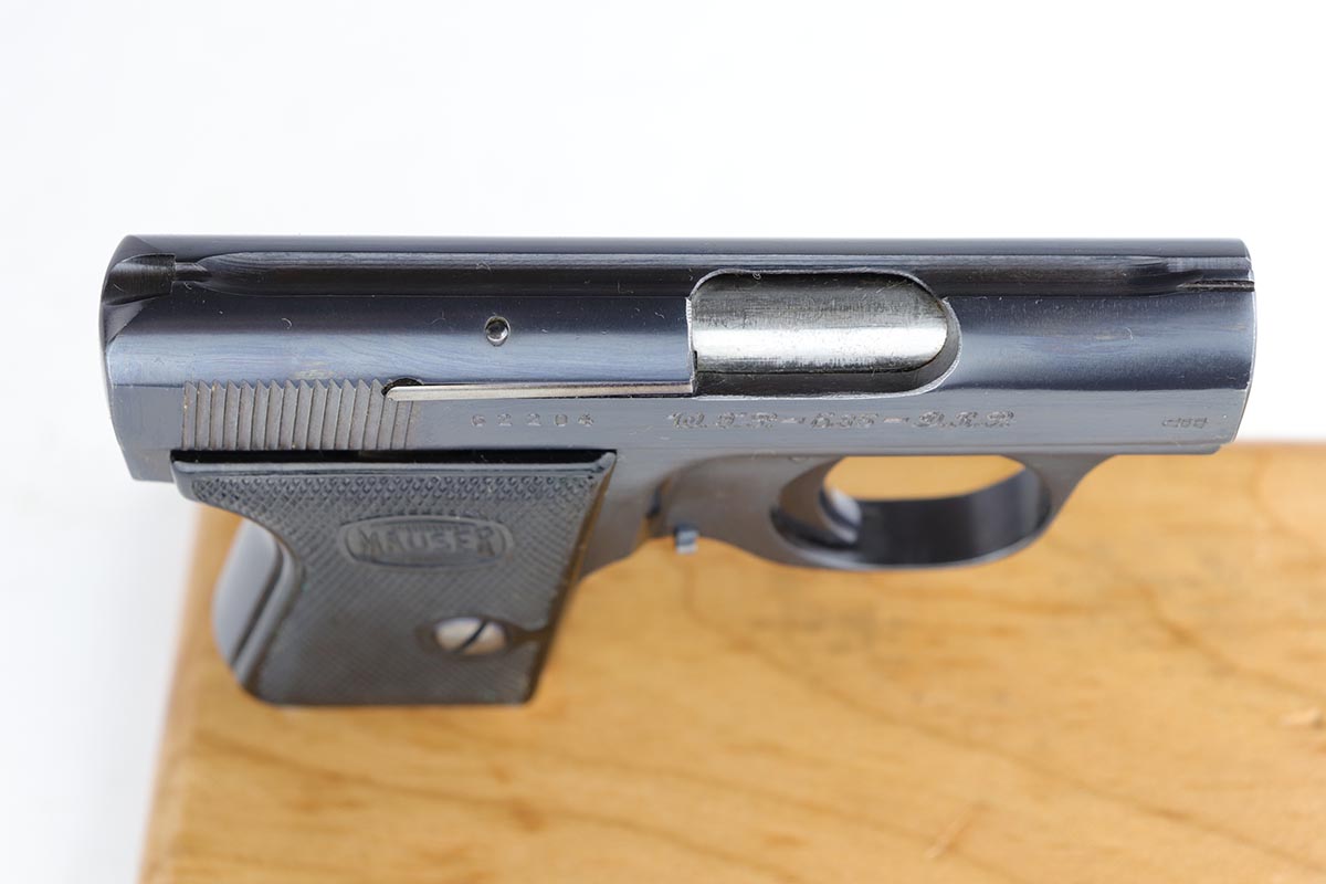 7/31/19 – This is an incredible example of a wartime Mauser WTP II in 6.35mm. It retains 99% blue with minor muzzle wear and a spot of finish loss on the trigger guard. Terrific bore and grips. Correct magazine.