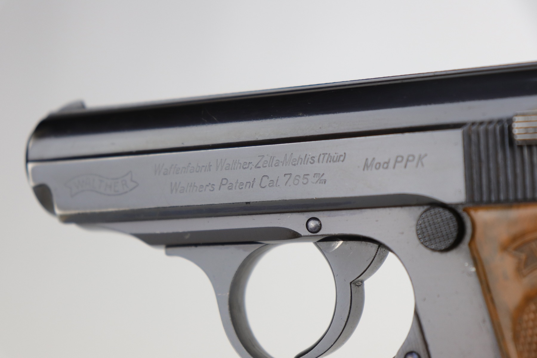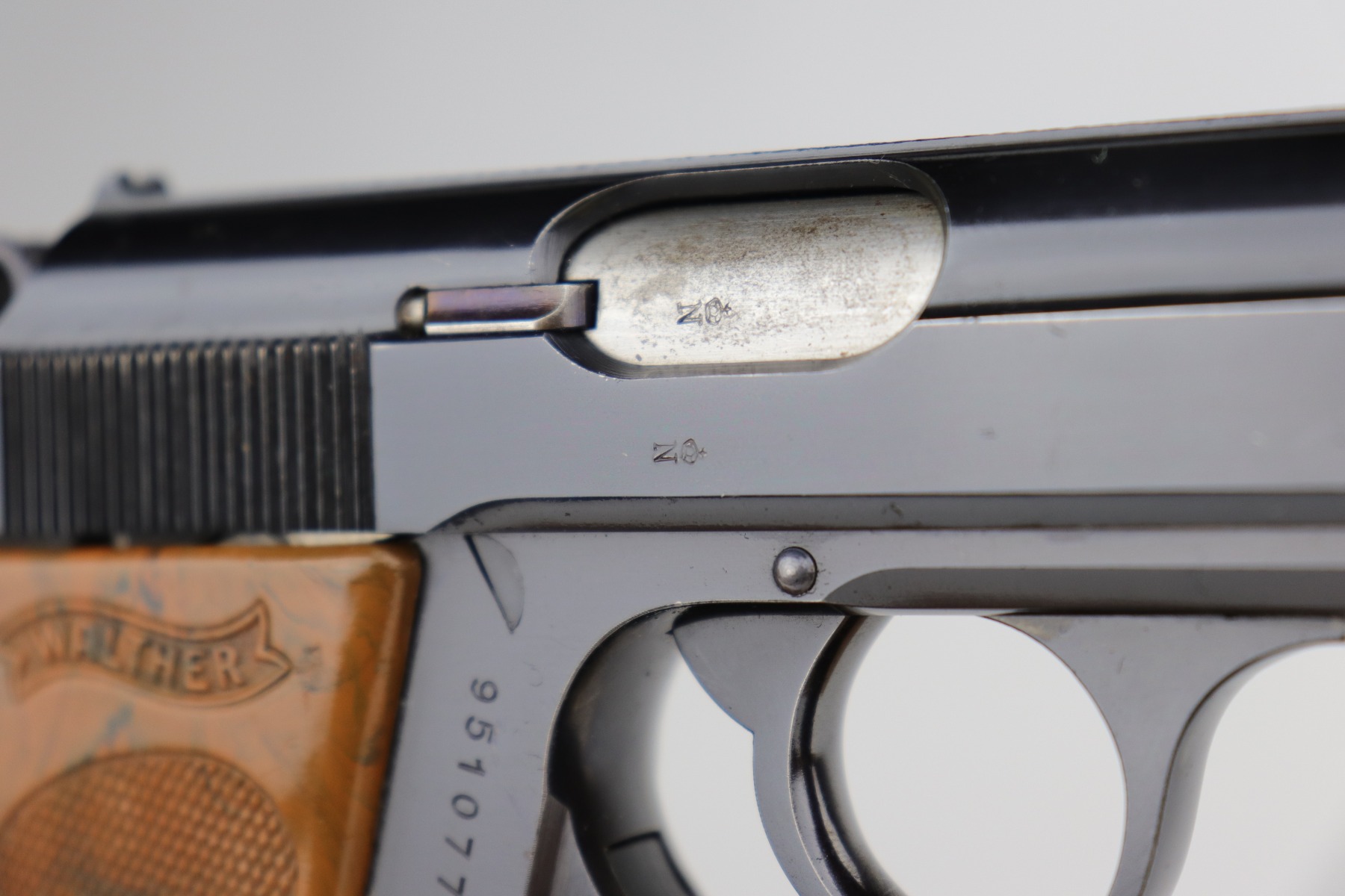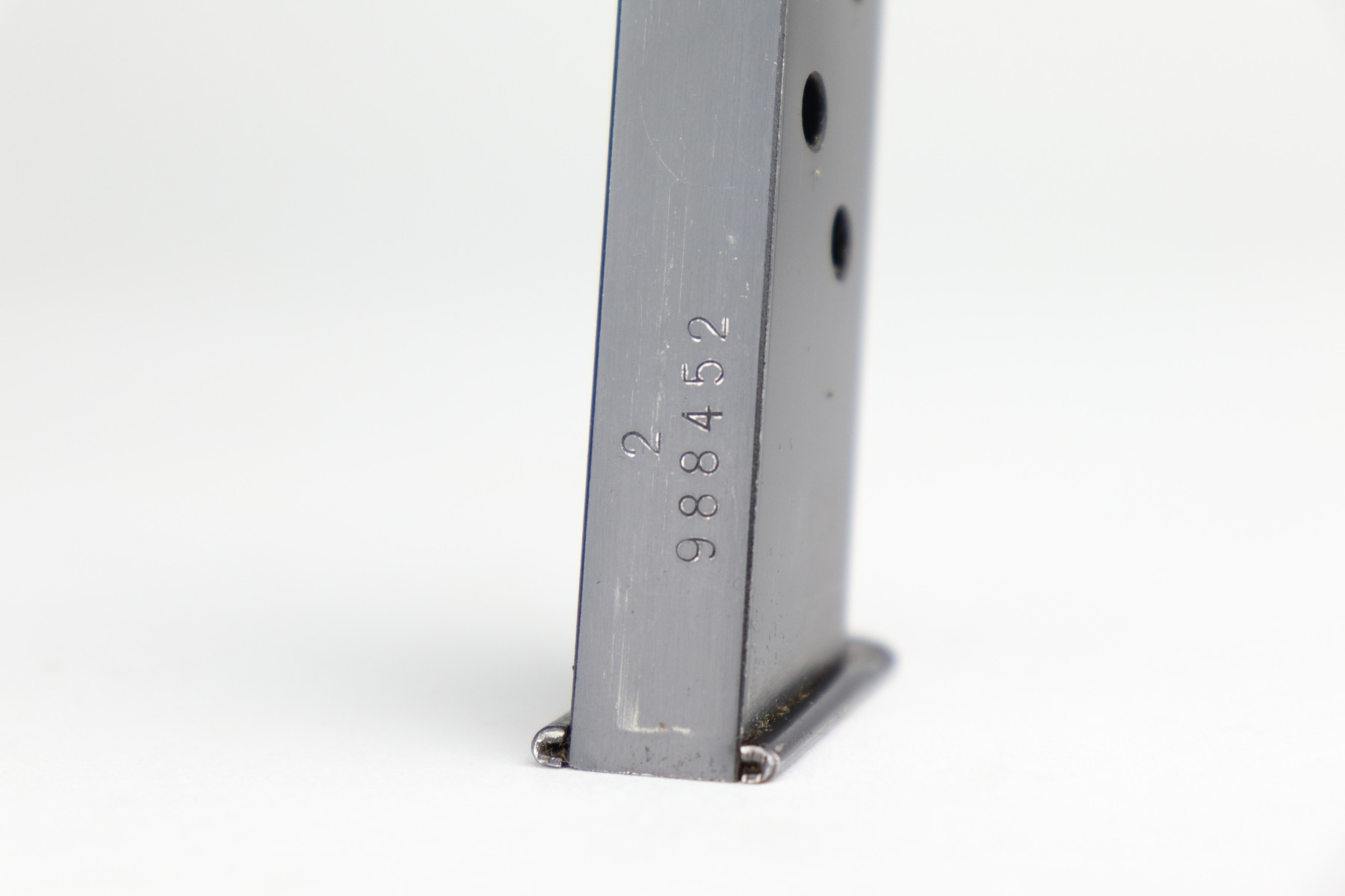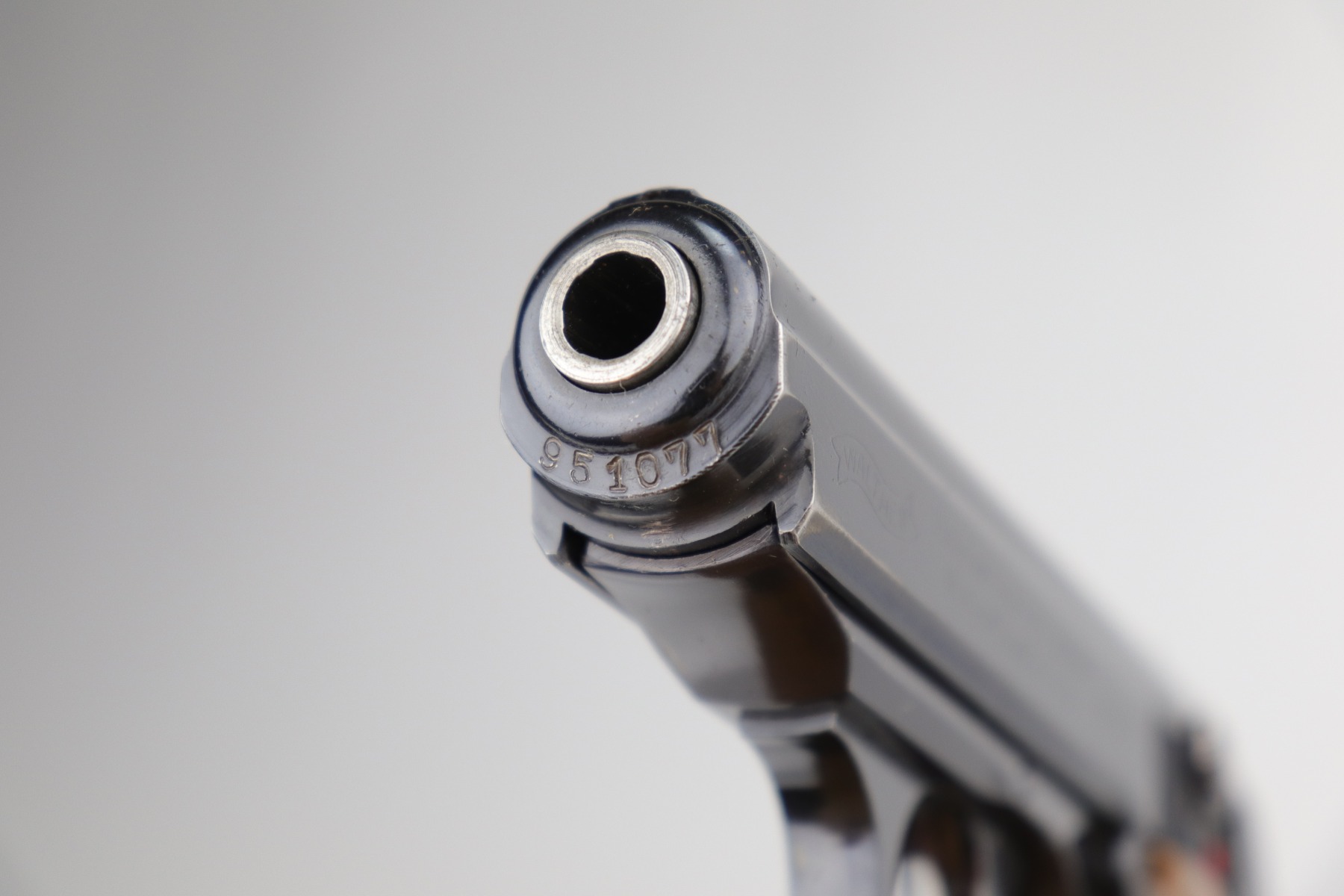 10/6/20 – This is a Minty example of a Walther PPK issued to the Nazi SS in about 1937. This is of the muzzle-numbered variation and is in the correct serial range. This gun is all matching and has retained about 98% of its original bluing. There is very minor muzzle wear, a spot of wear on the front strap, and a few very light handling marks here and there, especially on the front strap. It has a minty Walther grip and comes with an excellent numbered but mismatched magazine. The number on the magazine is in the correct range for a muzzle-numbered SS PPK. The bore is near-mint. Just a beautiful example.