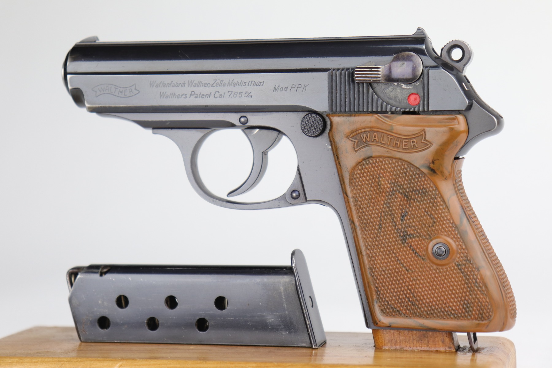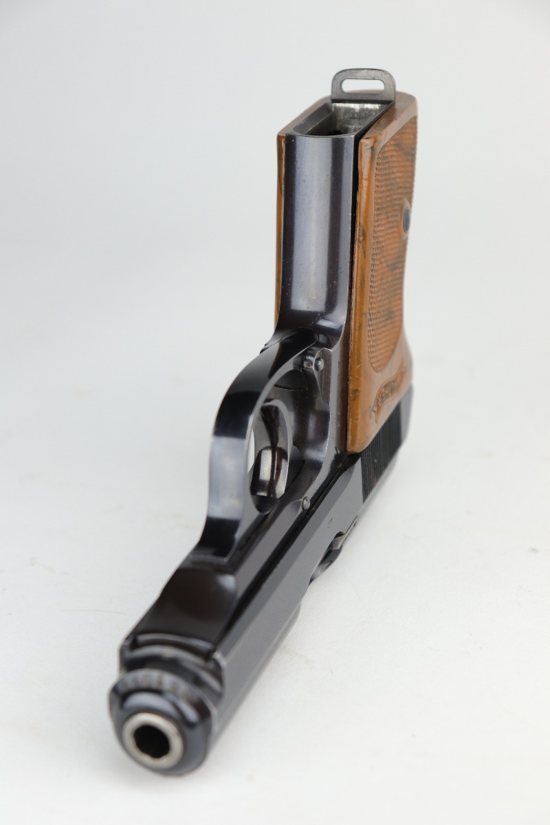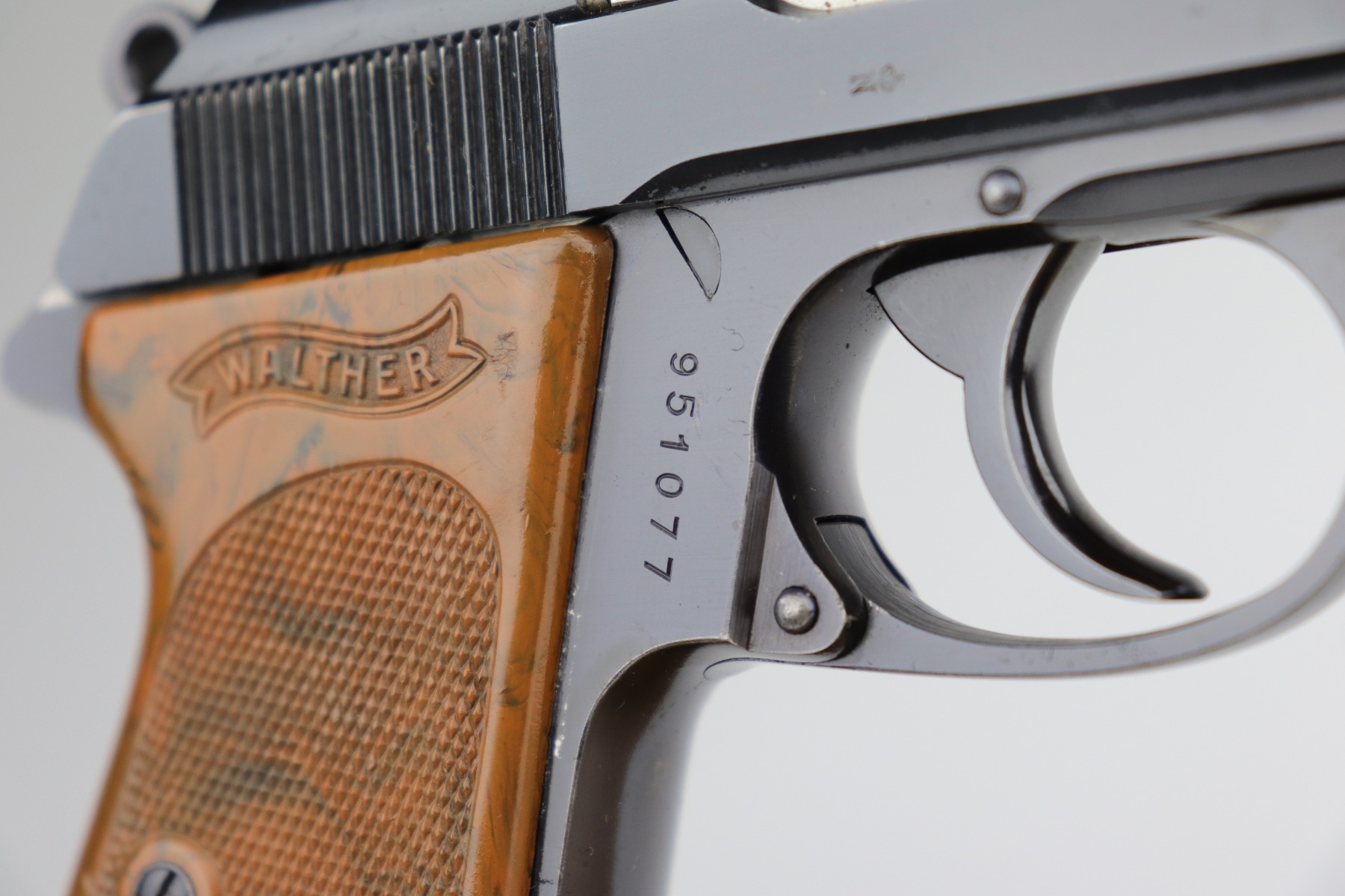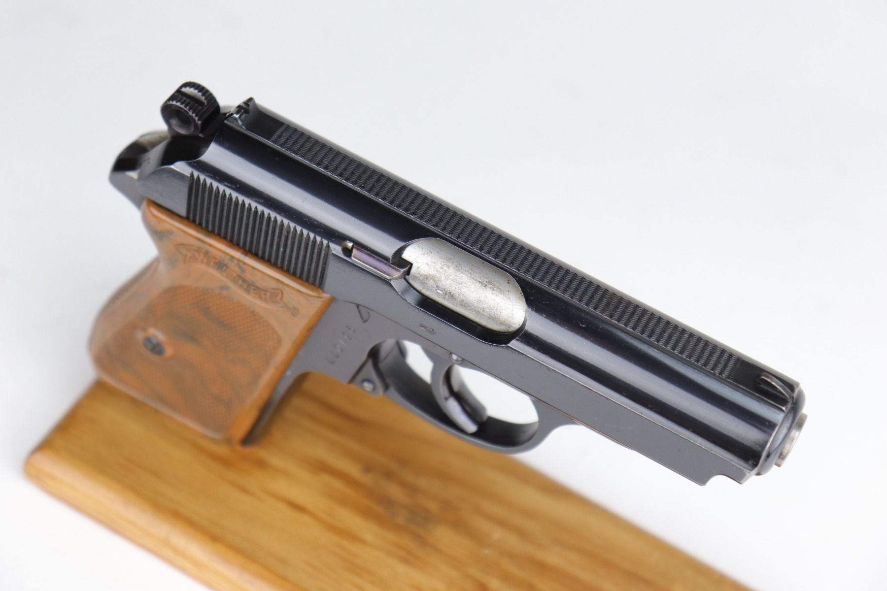 10/6/20 – This is a Minty example of a Walther PPK issued to the Nazi SS in about 1937. This is of the muzzle-numbered variation and is in the correct serial range. This gun is all matching and has retained about 98% of its original bluing. There is very minor muzzle wear, a spot of wear on the front strap, and a few very light handling marks here and there, especially on the front strap. It has a minty Walther grip and comes with an excellent numbered but mismatched magazine. The number on the magazine is in the correct range for a muzzle-numbered SS PPK. The bore is near-mint. Just a beautiful example.