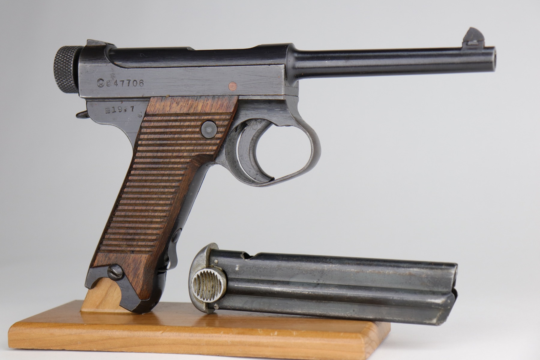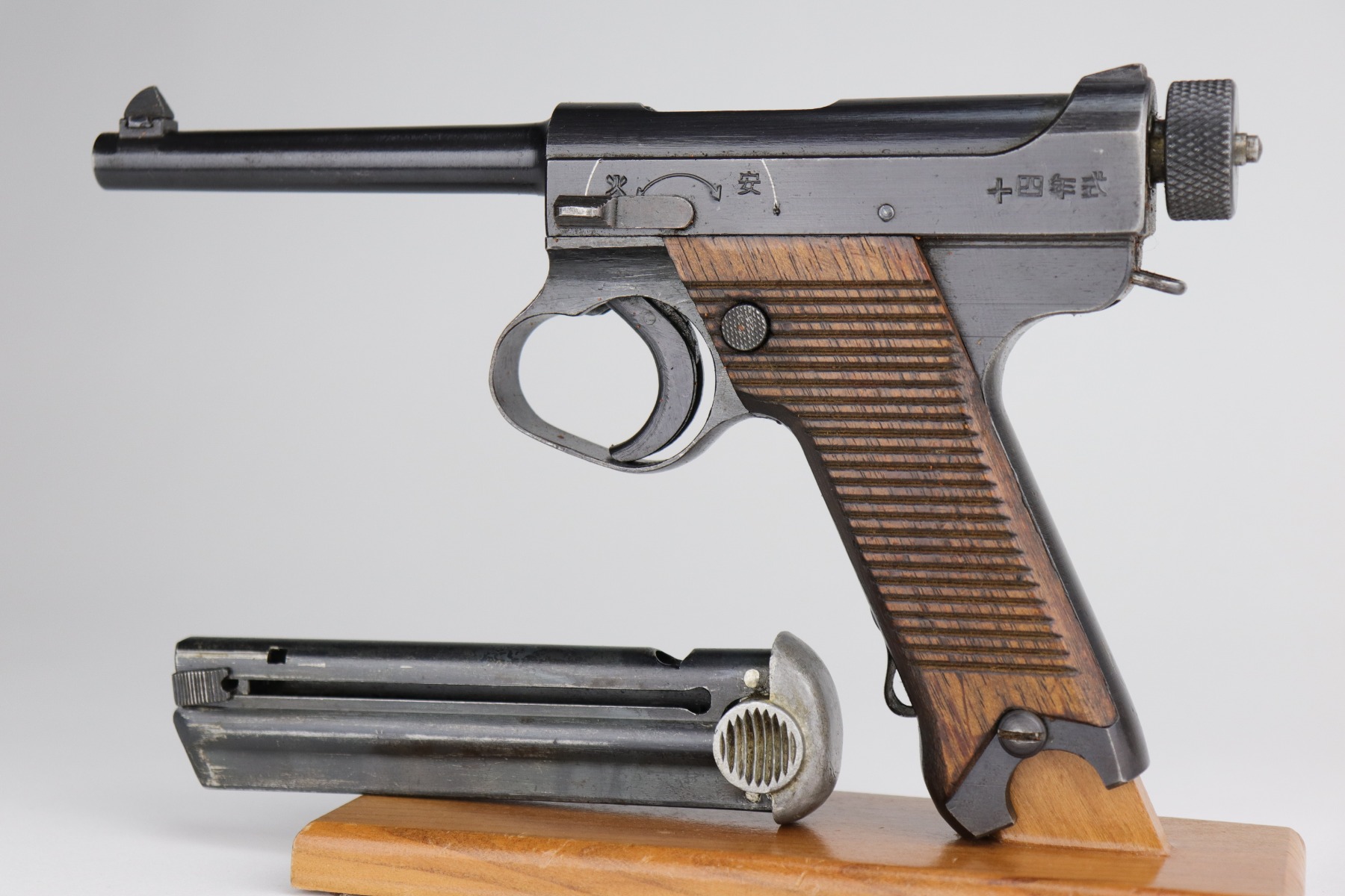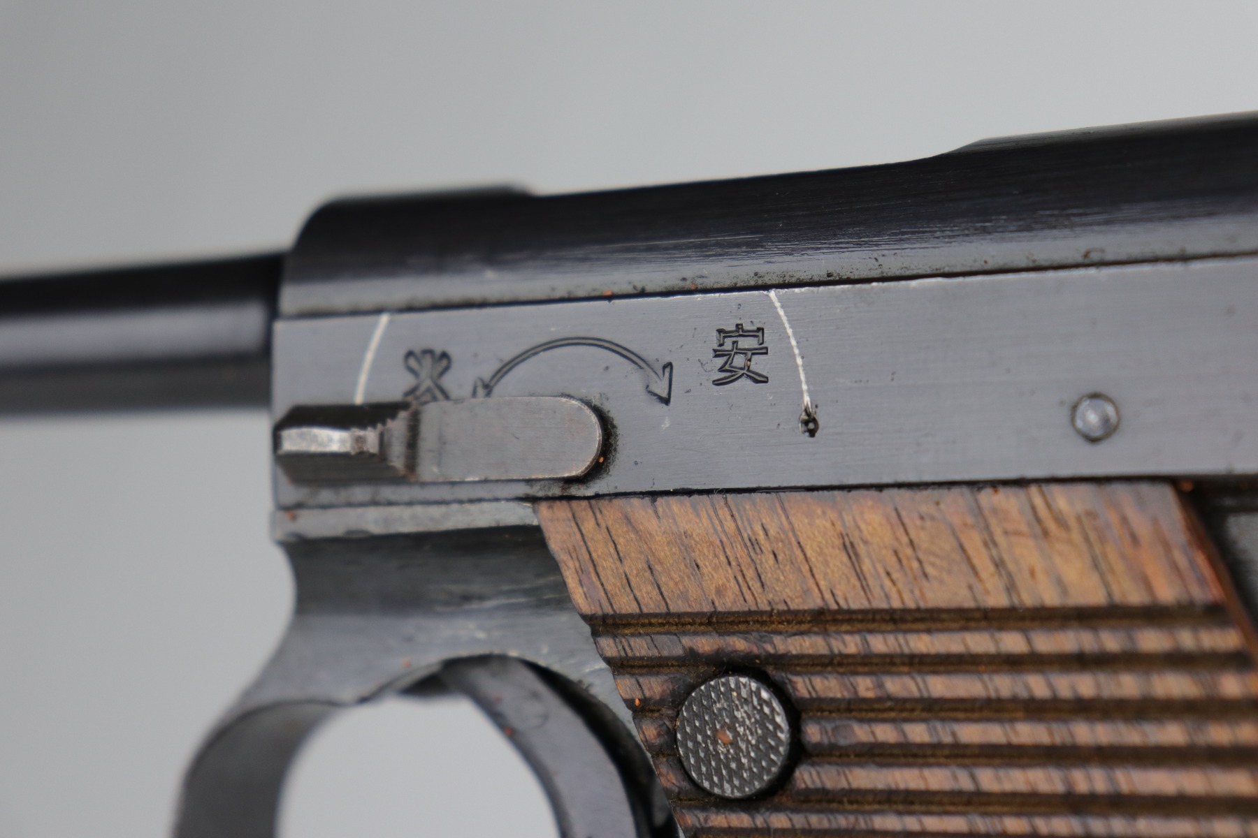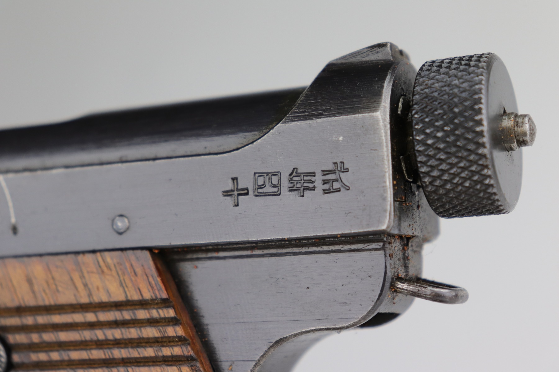 10/15/20 – This is a minty example of a Nambu Type 14, issued to the Japanese military in July of 1944. It is all matching, including the grips. This one has retained more than 98% of its original bluing. There is a hint of wear toward the back of the slide and underside of the trigger guard. There are a few very small areas of minor oxidation. The grips are excellent. Comes with a period-correct mismatched magazine. The bore is excellent – shiny with strong rifling.