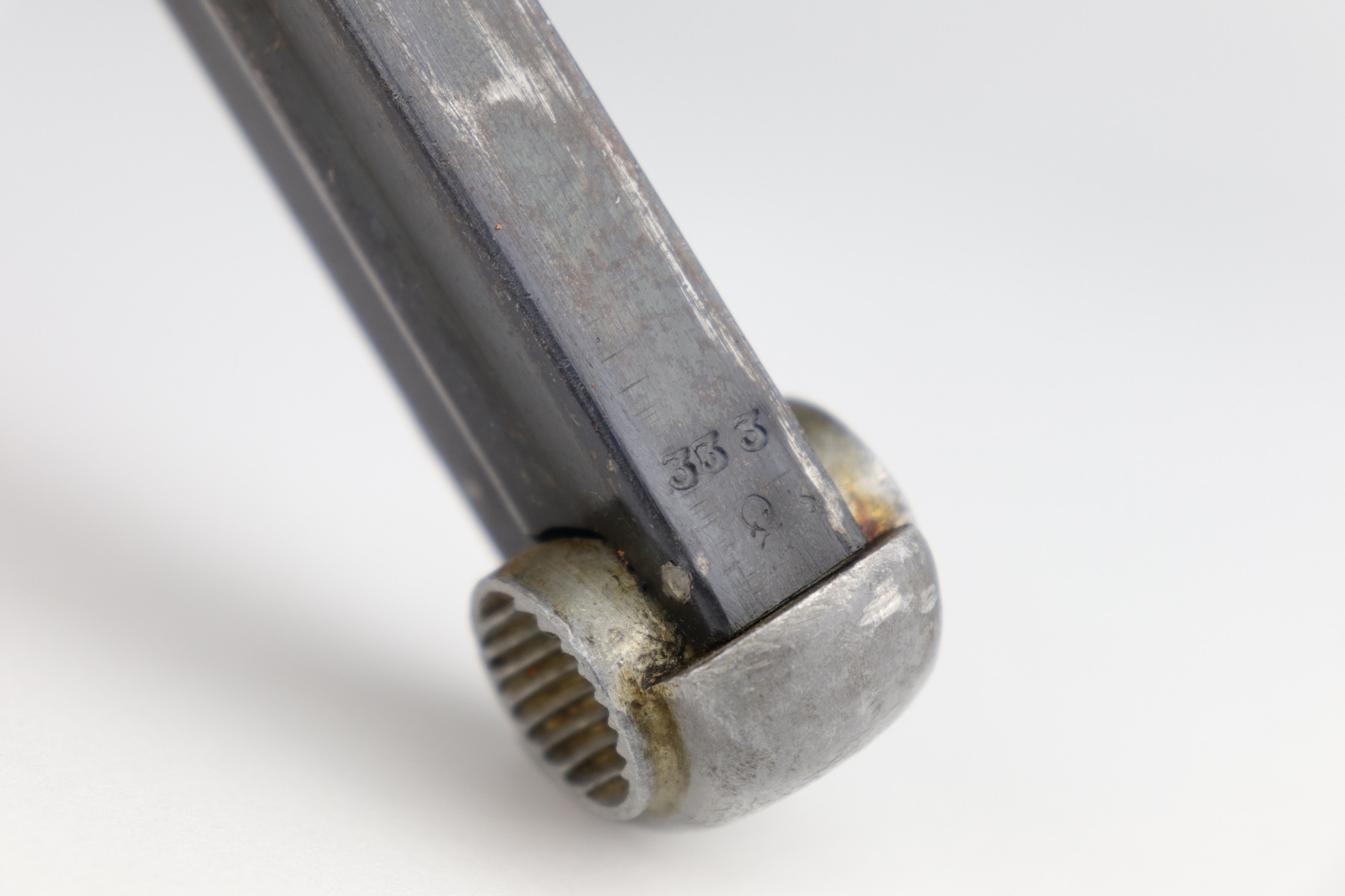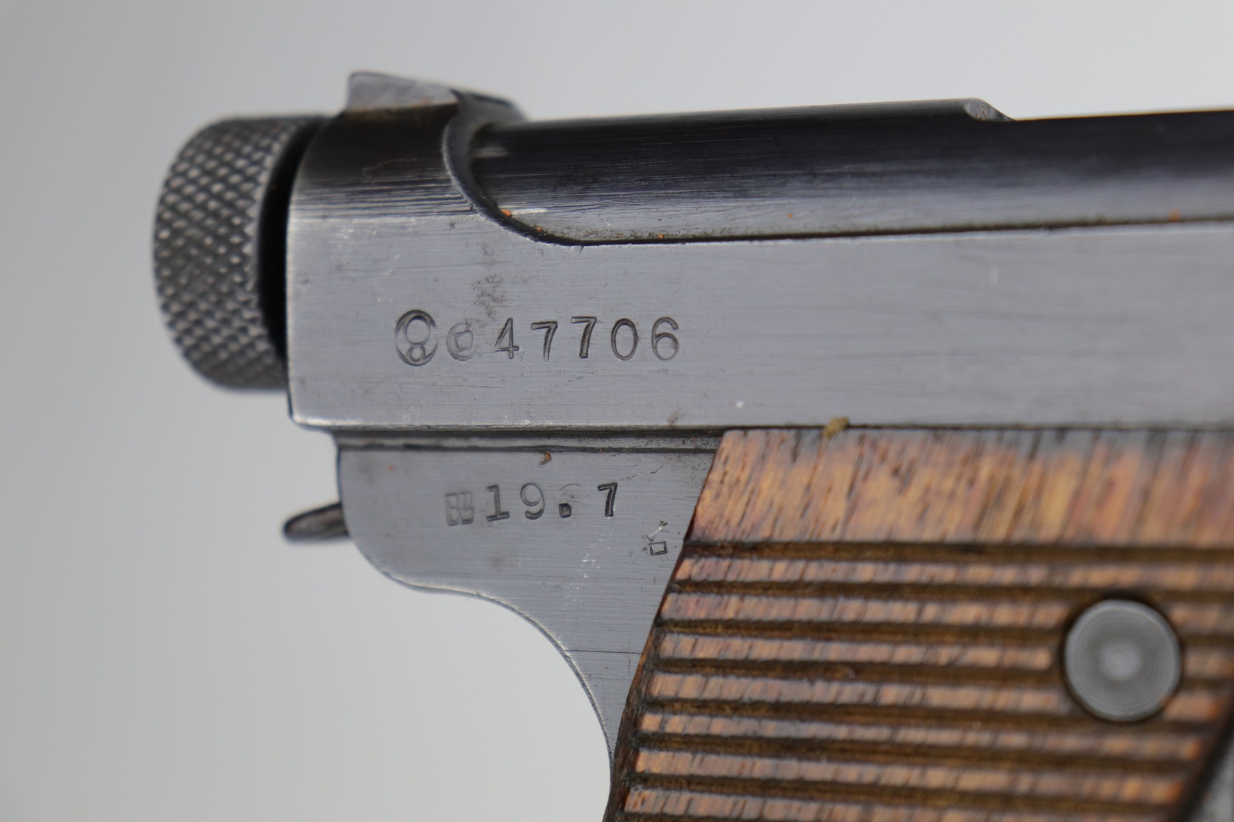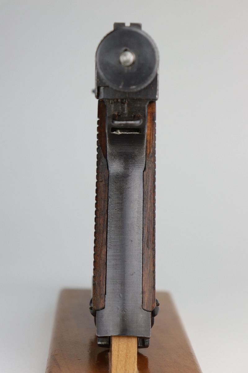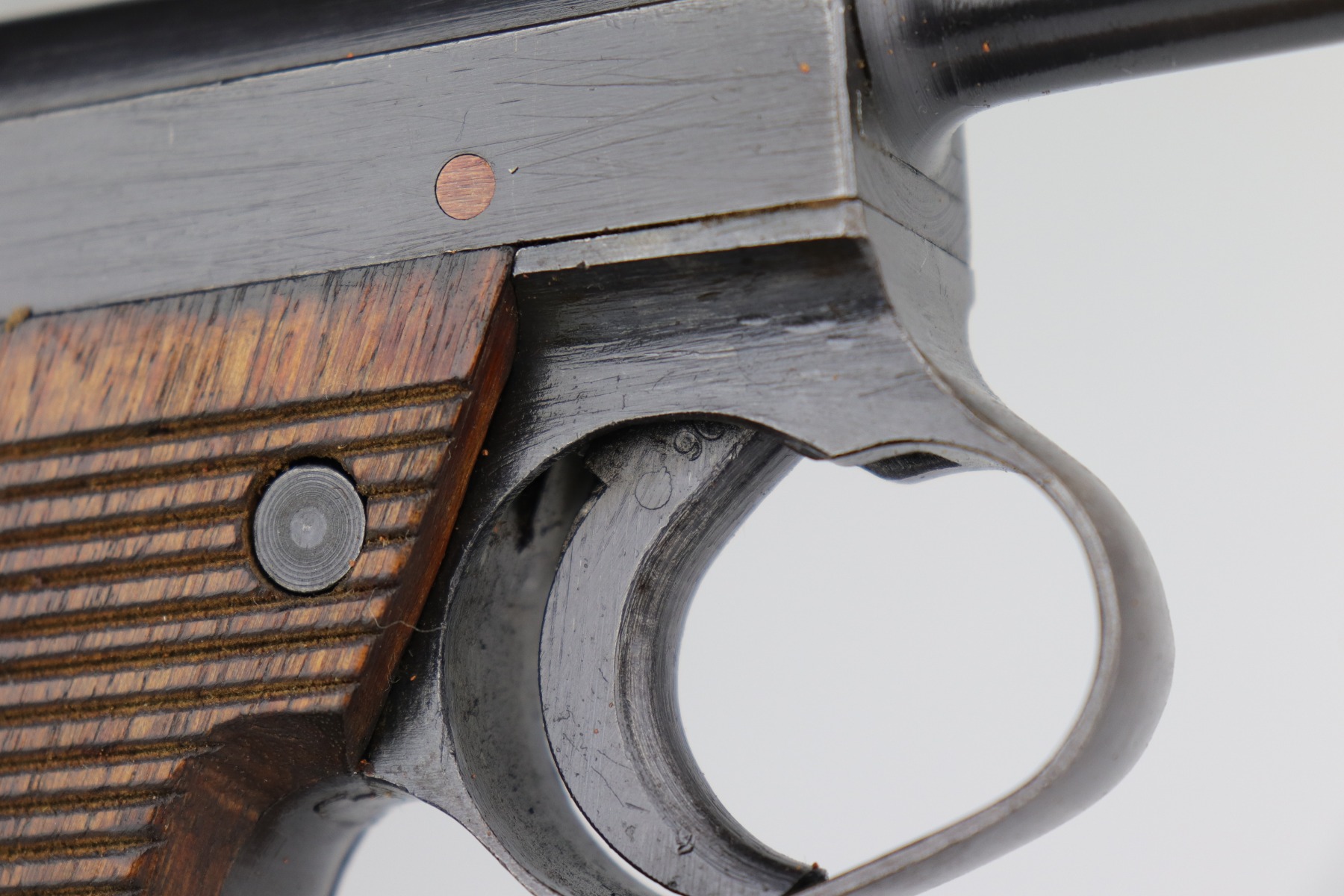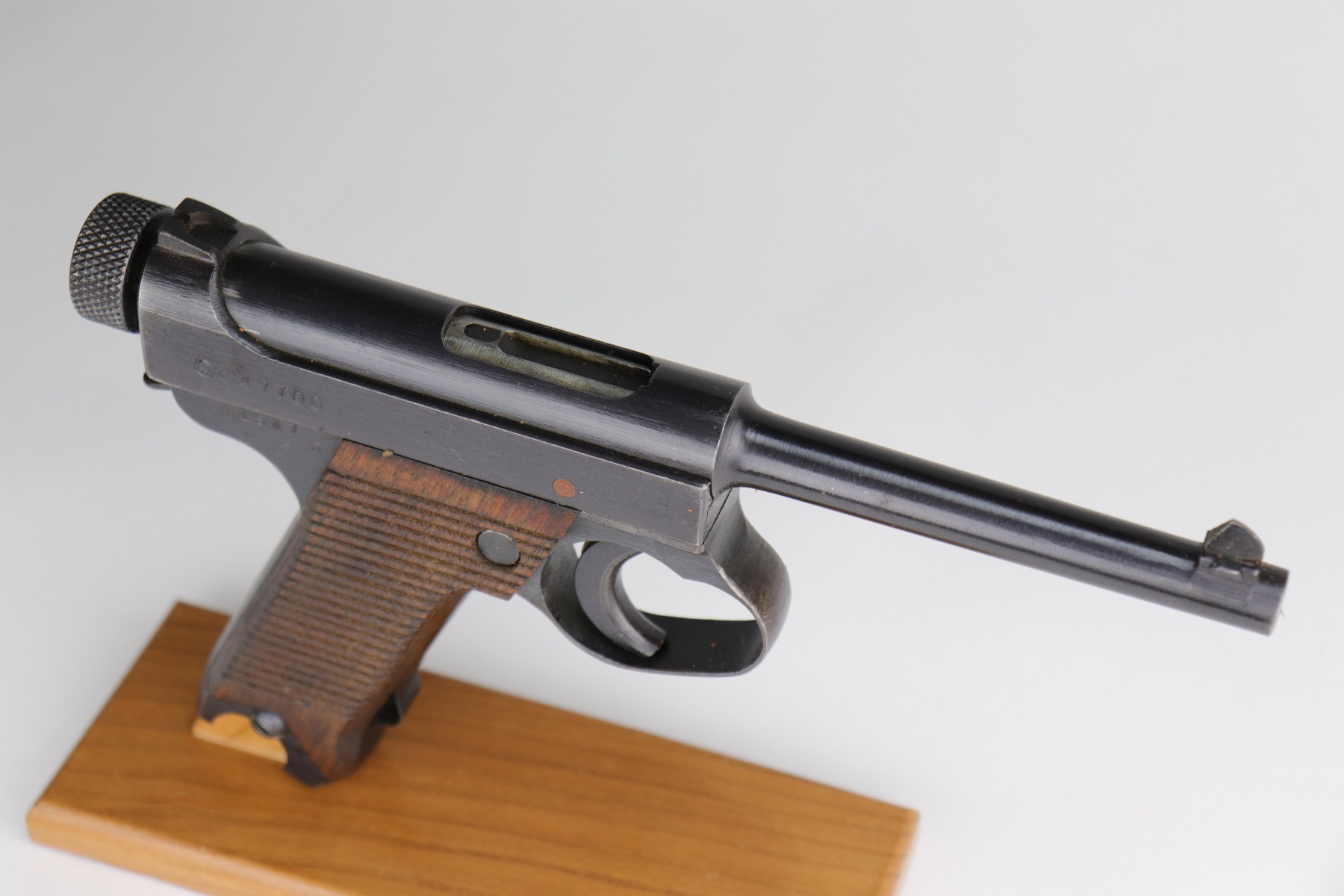 10/15/20 – This is a minty example of a Nambu Type 14, issued to the Japanese military in July of 1944. It is all matching, including the grips. This one has retained more than 98% of its original bluing. There is a hint of wear toward the back of the slide and underside of the trigger guard. There are a few very small areas of minor oxidation. The grips are excellent. Comes with a period-correct mismatched magazine. The bore is excellent – shiny with strong rifling.