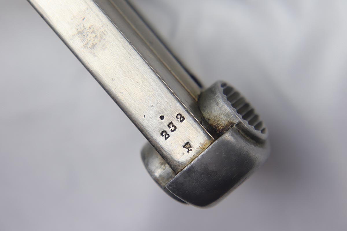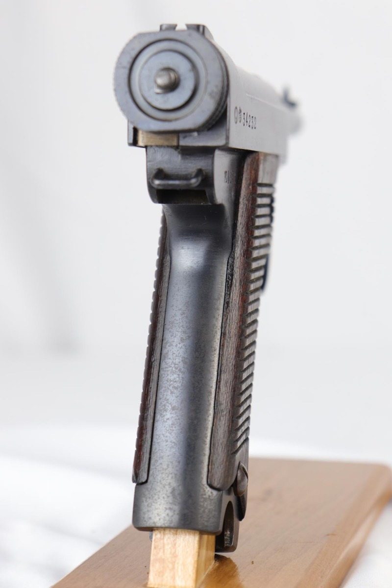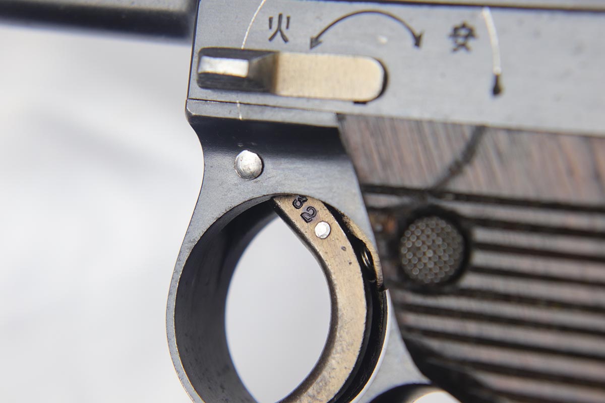 9/20/18 – This is a near-mint Nambu Type 14 with original matching grips and magazine. Made in July of 1937, this pistol retains 98-99% original blue with minor oxidation and finish loss on the straps and trigger guard. The excellent grips are hand numbered to the pistol and the pistol has a minty bore. Even the small parts still show excellent straw. All matching numbered parts.