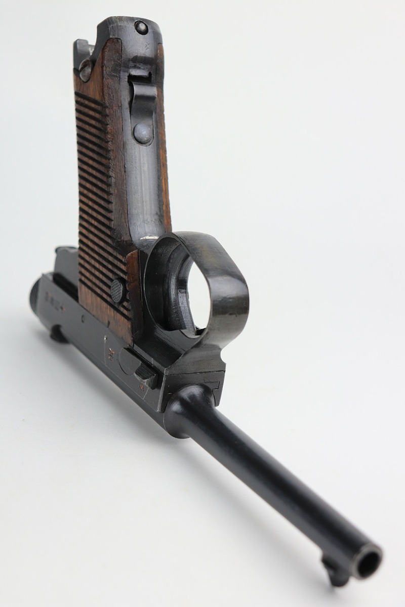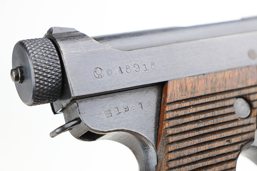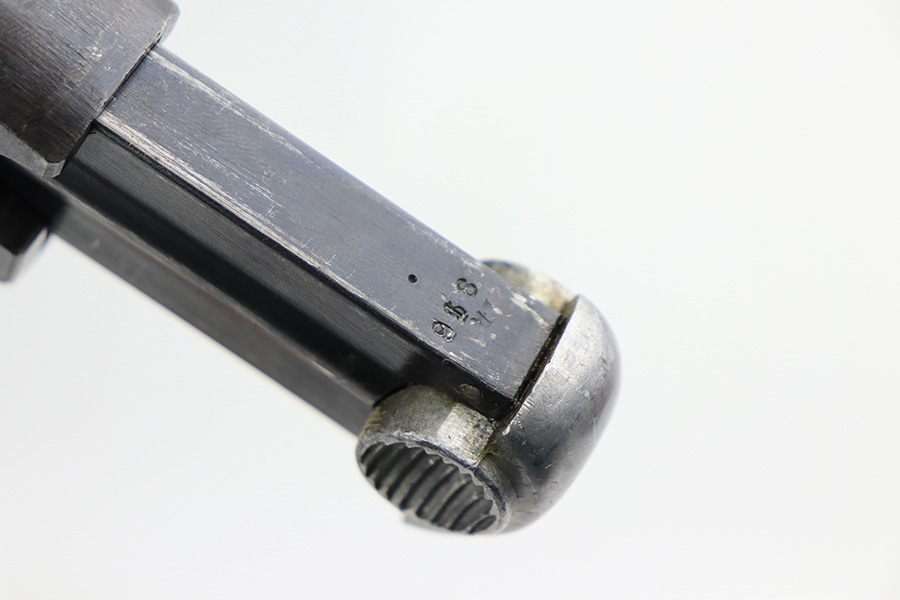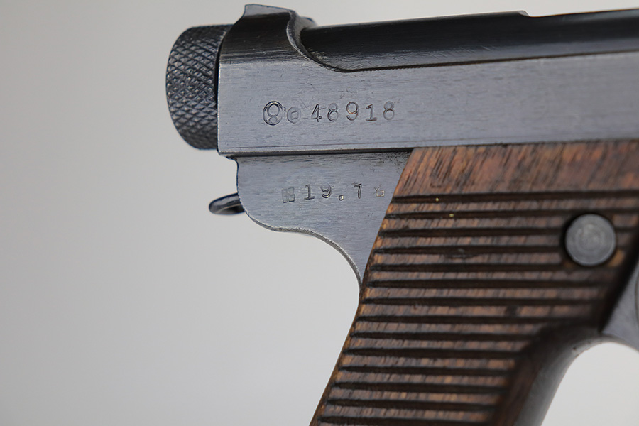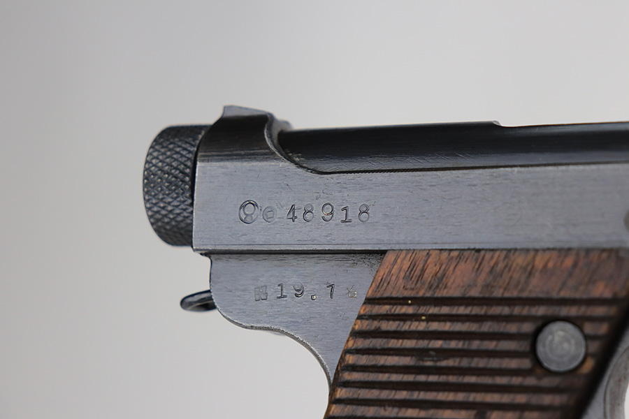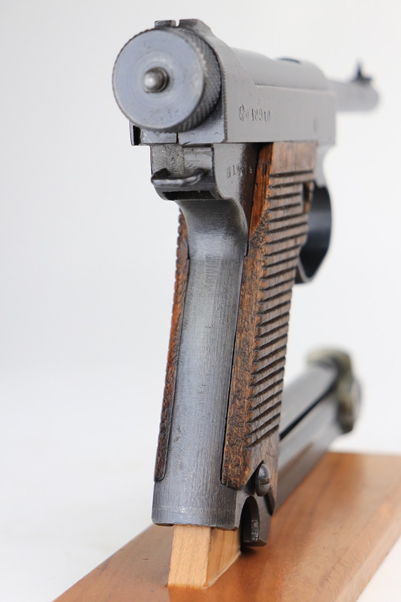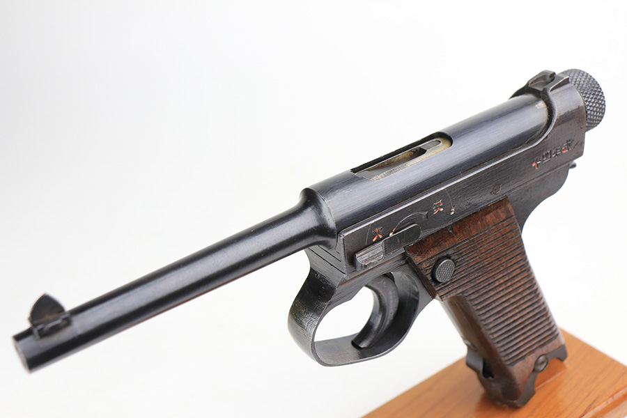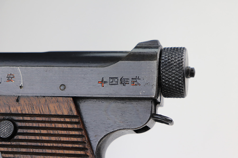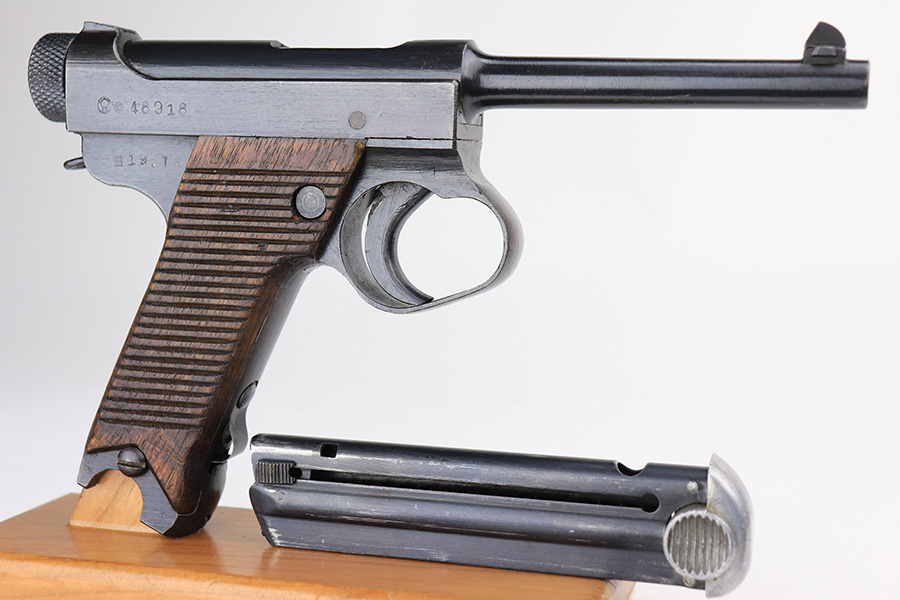 2/22/22 – This is a beautiful, near-mint example of a Nambu Type 14 issued to the Japanese military in July of 1944. The gun is all matching and comes with one matching-numbered magazine, though the magazine was force-matched as the arsenal proof does not match. It has retained about 98% of its original finish. There is just very minor wear on some of the high edges and the faintest hints of thinning on the grip straps. Some of the markings on the left side of the gun are partially filled-in with red paint. Comes with very nice matching-numbered wood grips. The bore is stone-mint.