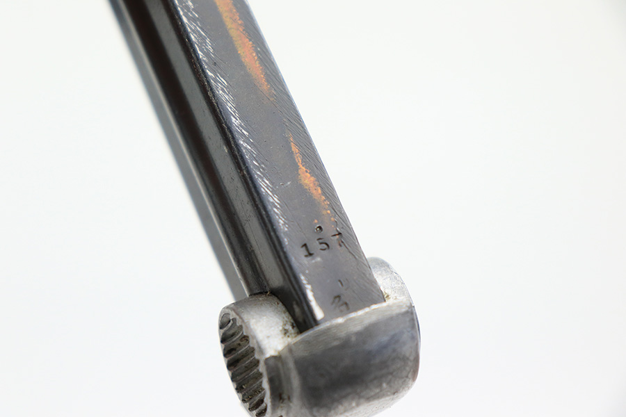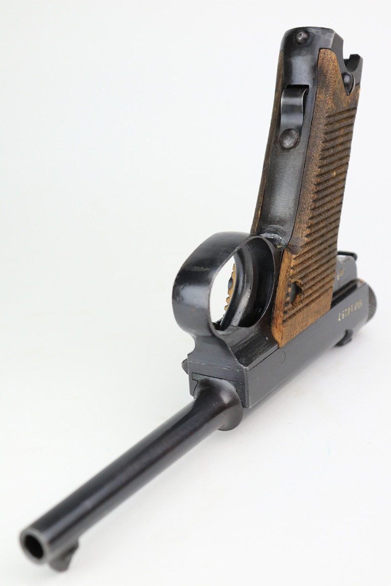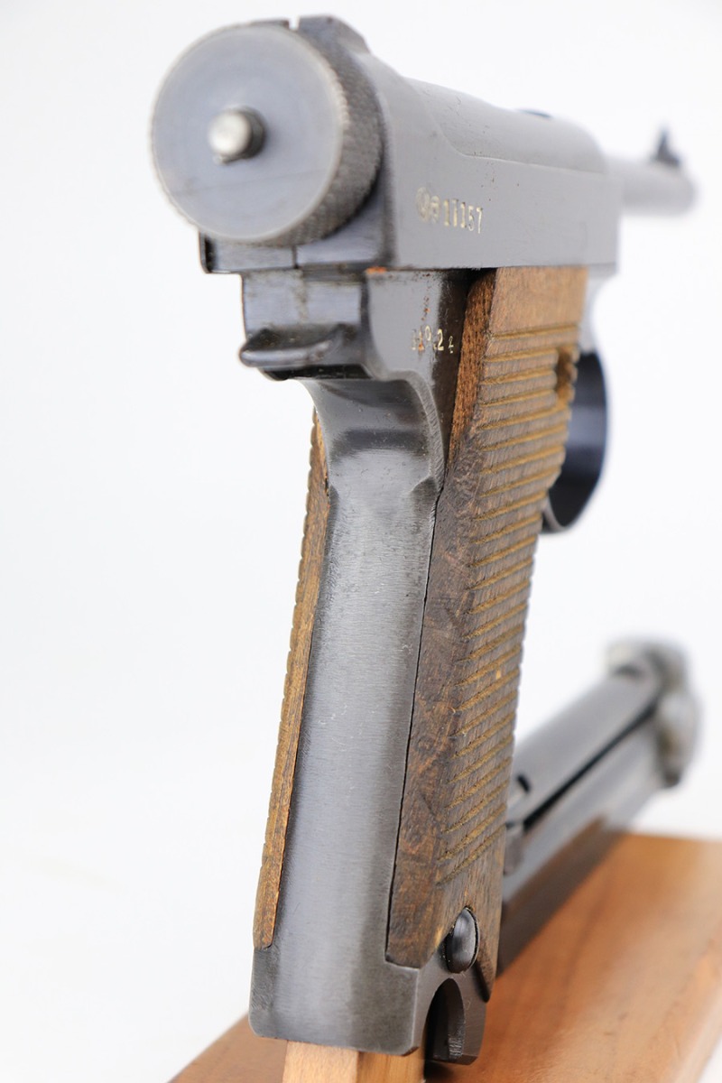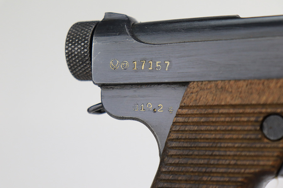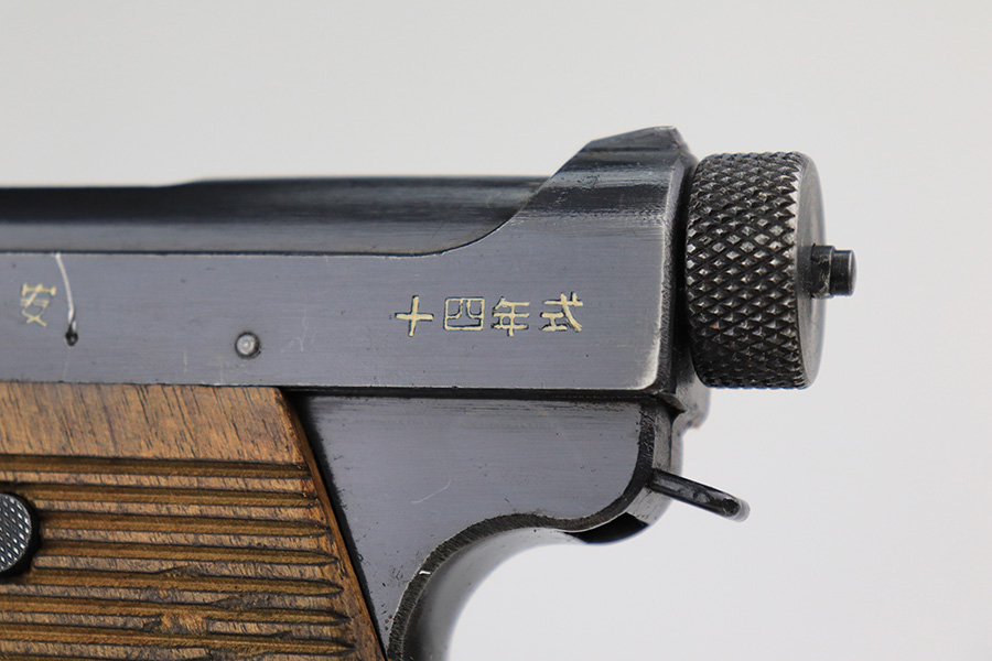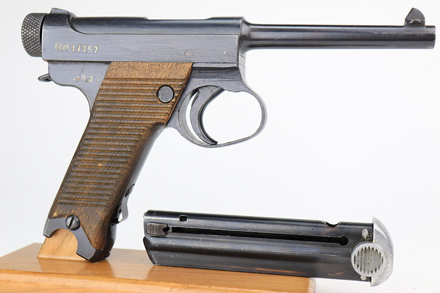 5/19/22 – This is a near-mint example of a Nambu Type 14 issued to the Japanese military in February of 1944. The gun is all matching and comes with one original matching-numbered magazine. The gun has retained about 98% of its original bluing with just very minor thinning on both grip straps – the profile views are gorgeous. Comes with nice matching-numbered wood grips – some small dings on the left side. Stone-mint bore.