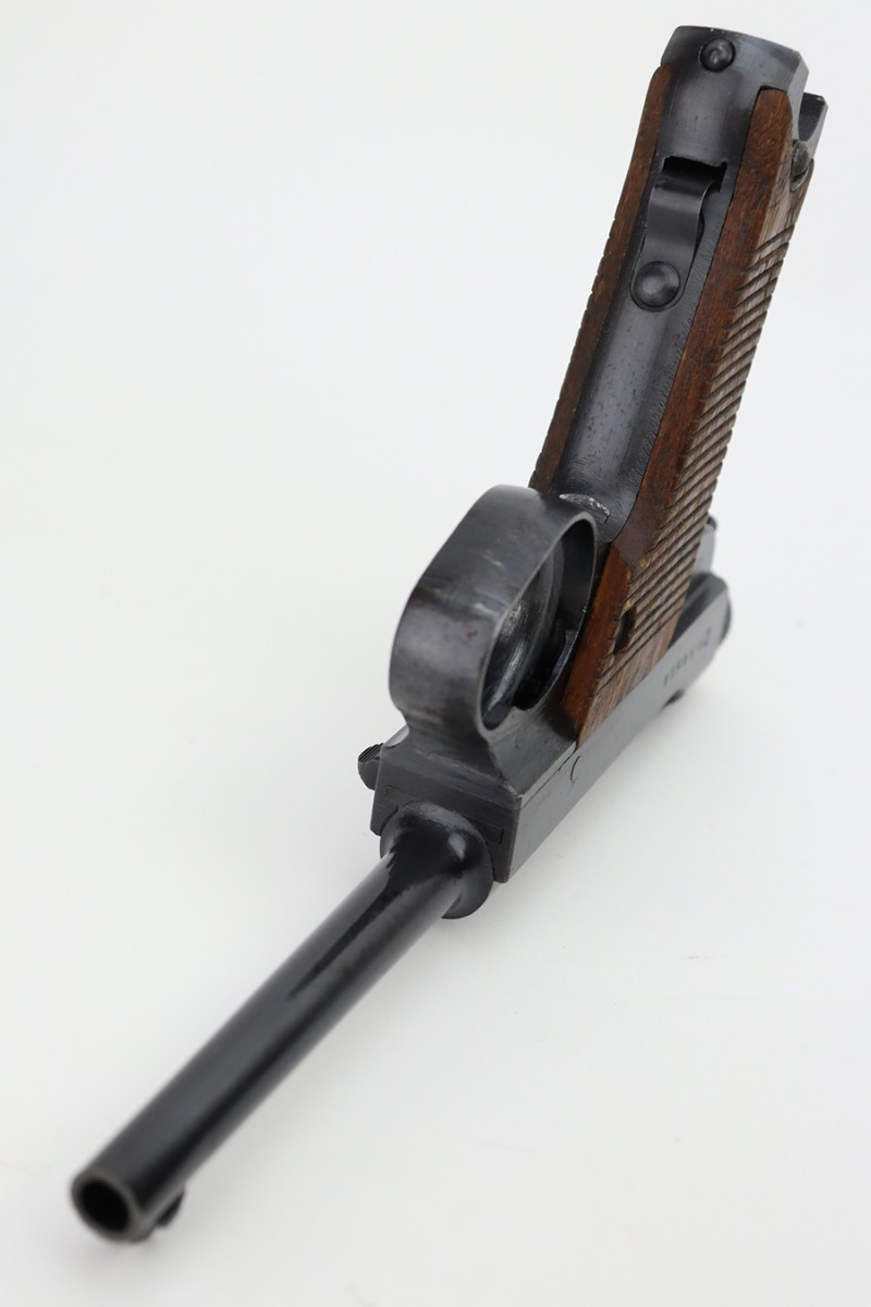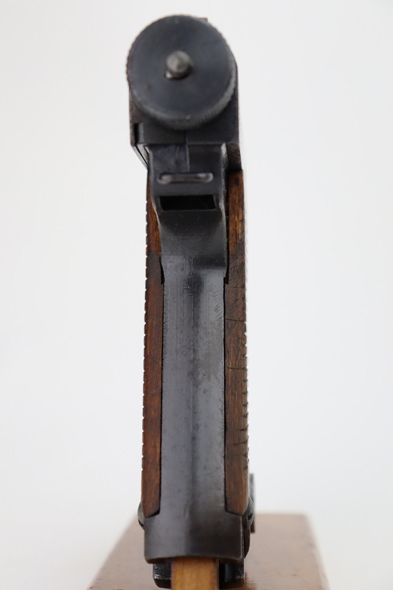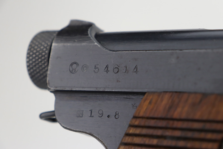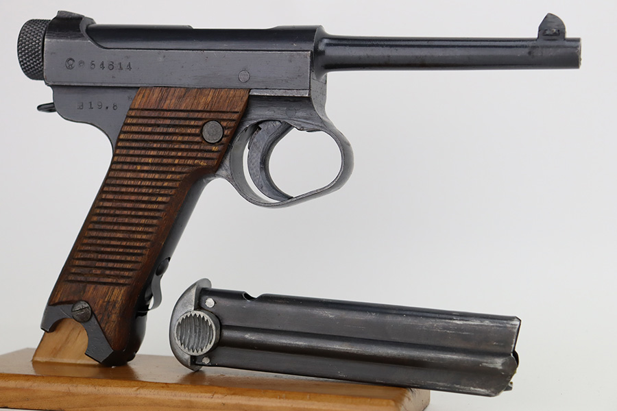 12/20/2023 – This is a mint example of a Type 14 Nambu issued to the Imperial Japanese Army in August of 1944. All matching throughout with matching grips and one original matching magazine. The handgun retained nearly all its original bluing with a hint of high edge wear and mint bore.