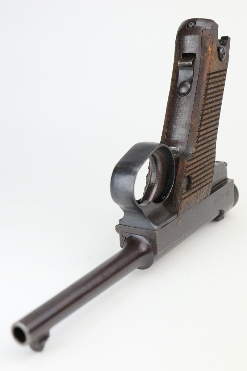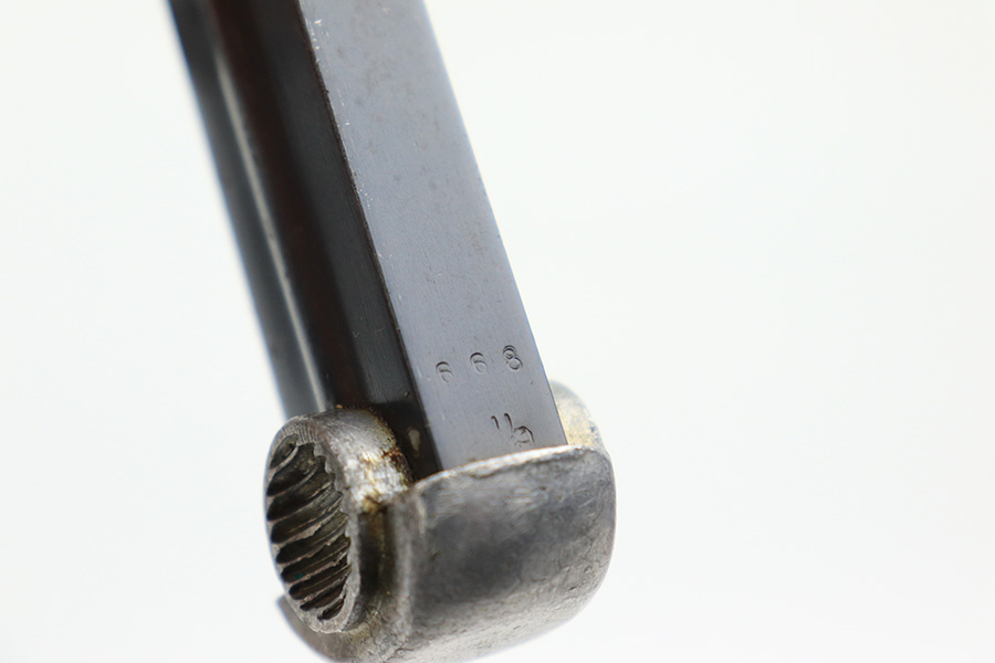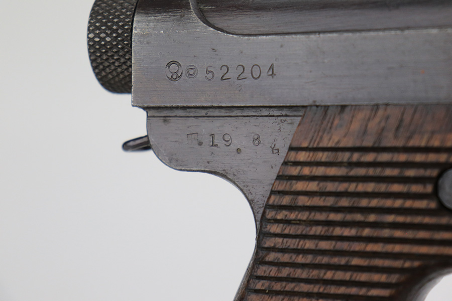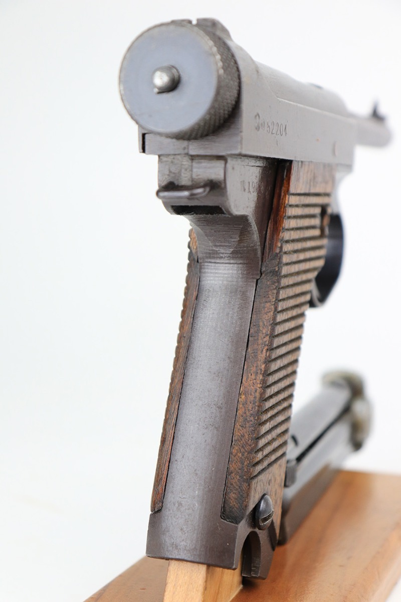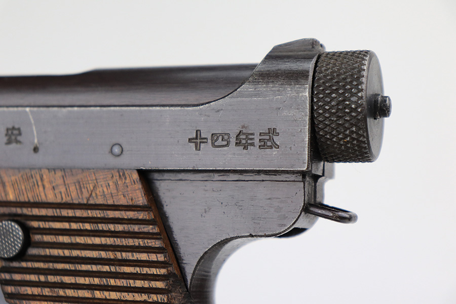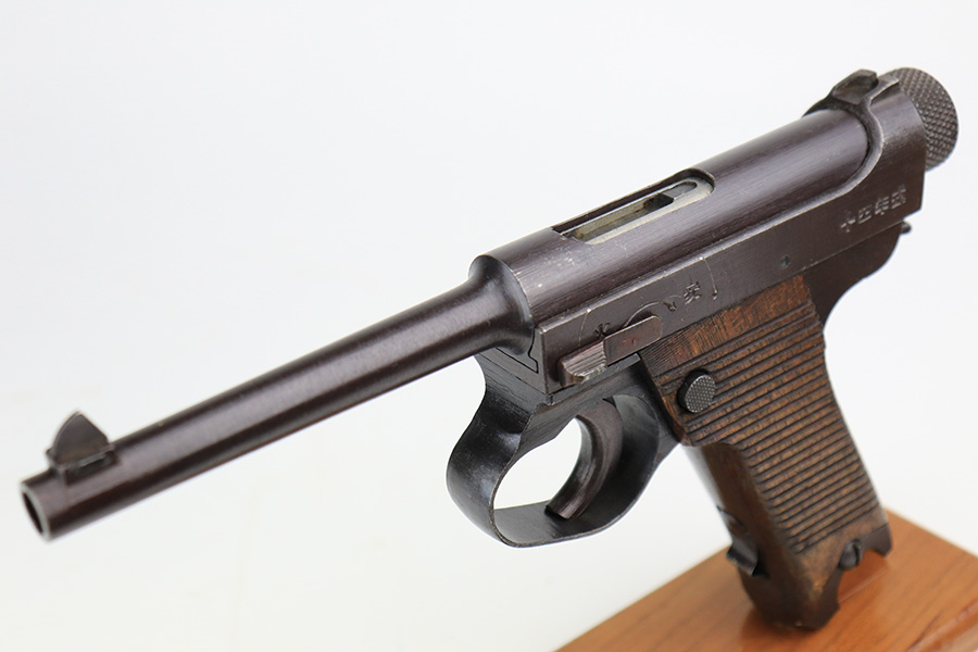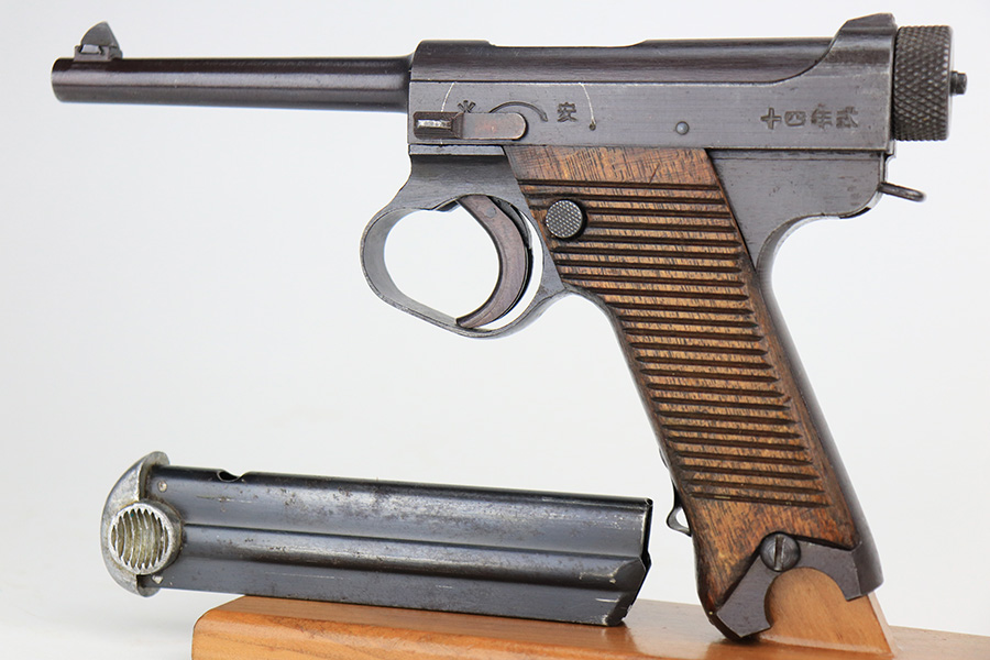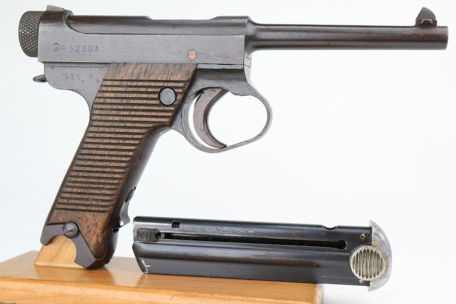 6/10/22 – This is a near-mint example of a Nambu Type 14 issued to the Japanese military in August of 1944. It is all matching and has a beautiful plumb-colored finish. It has retained nearly all of this finish with just hints of wear on some of the high edges and a tiny spot of wear on the underside of the trigger guard. It comes with excellent matching-numbered wood grips and a period-correct but mismatched magazine. Stone-mint bore.