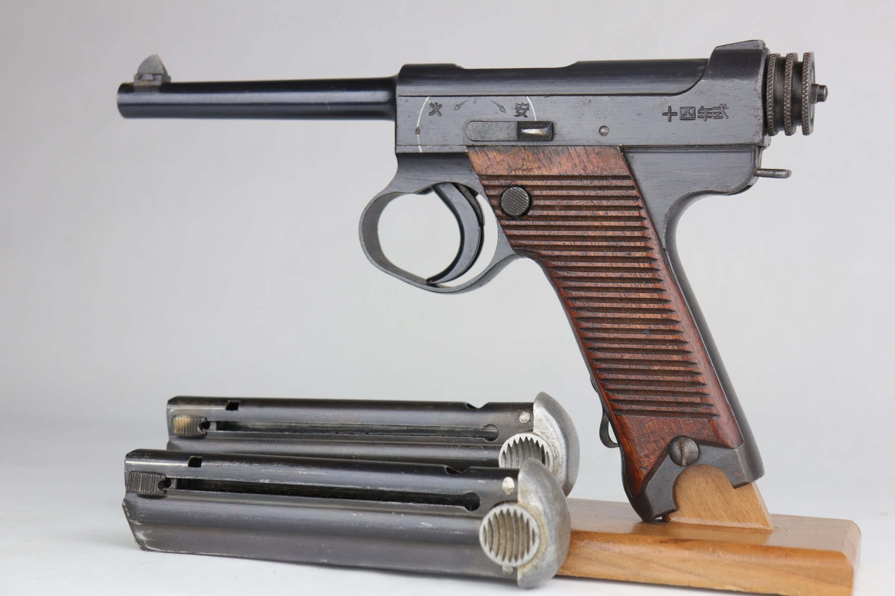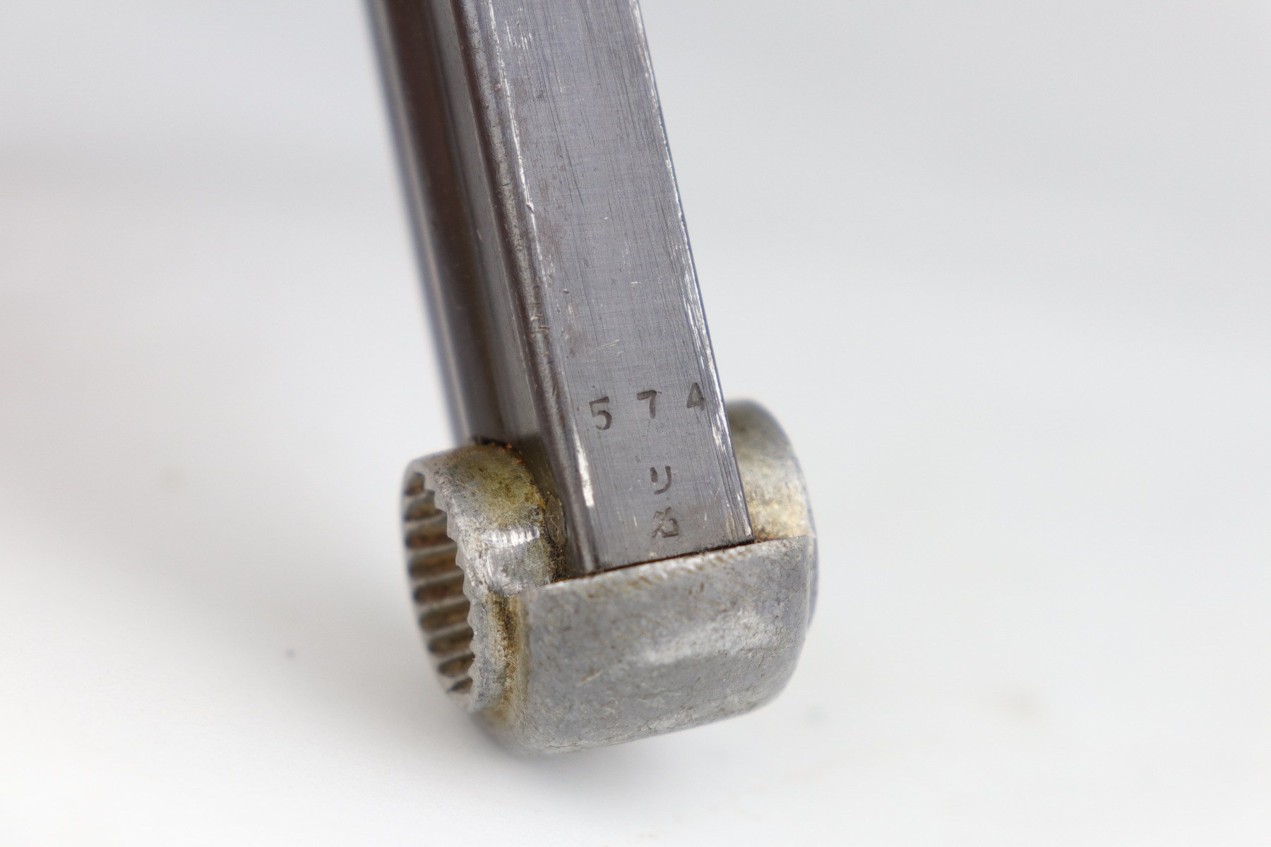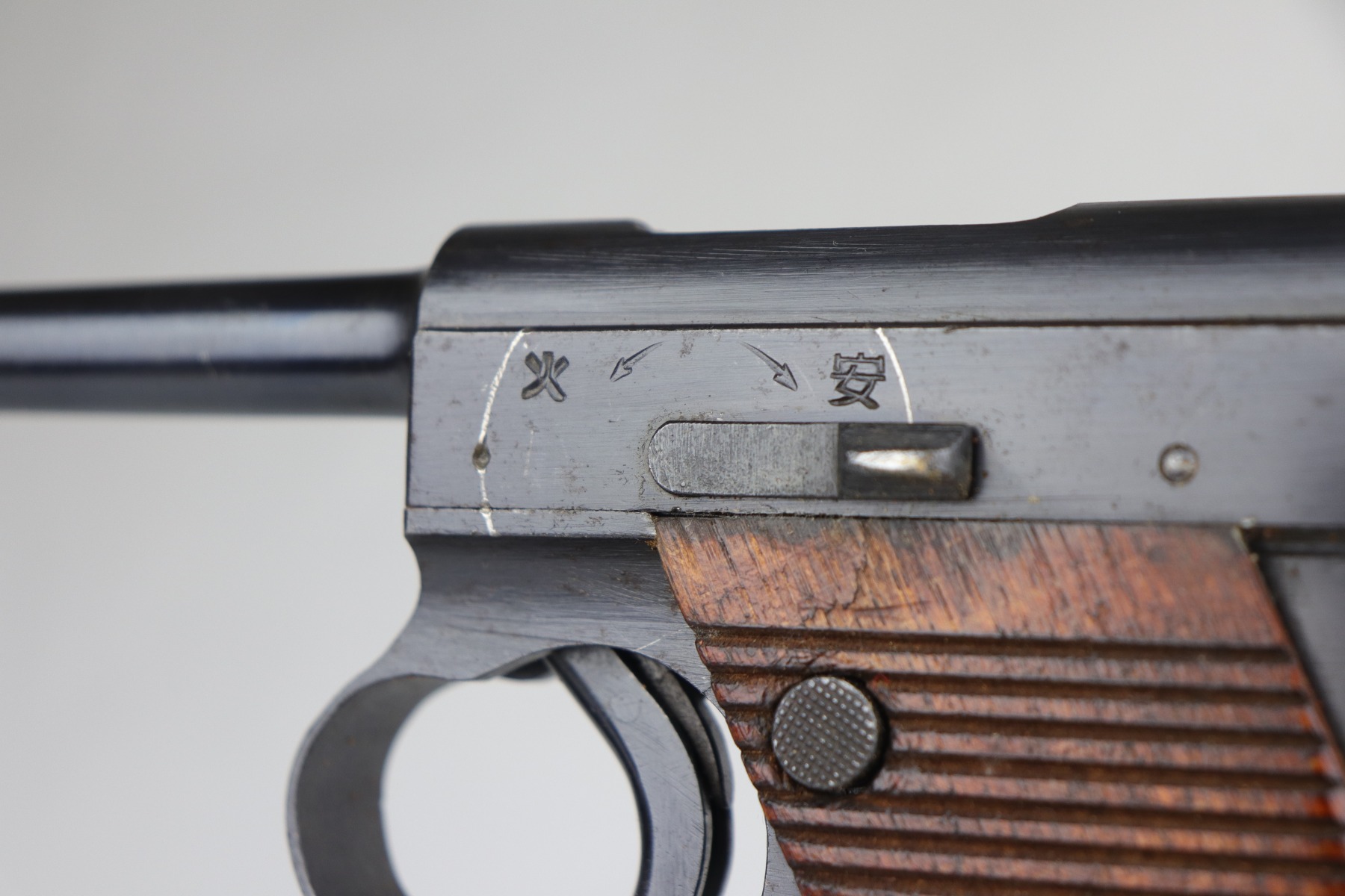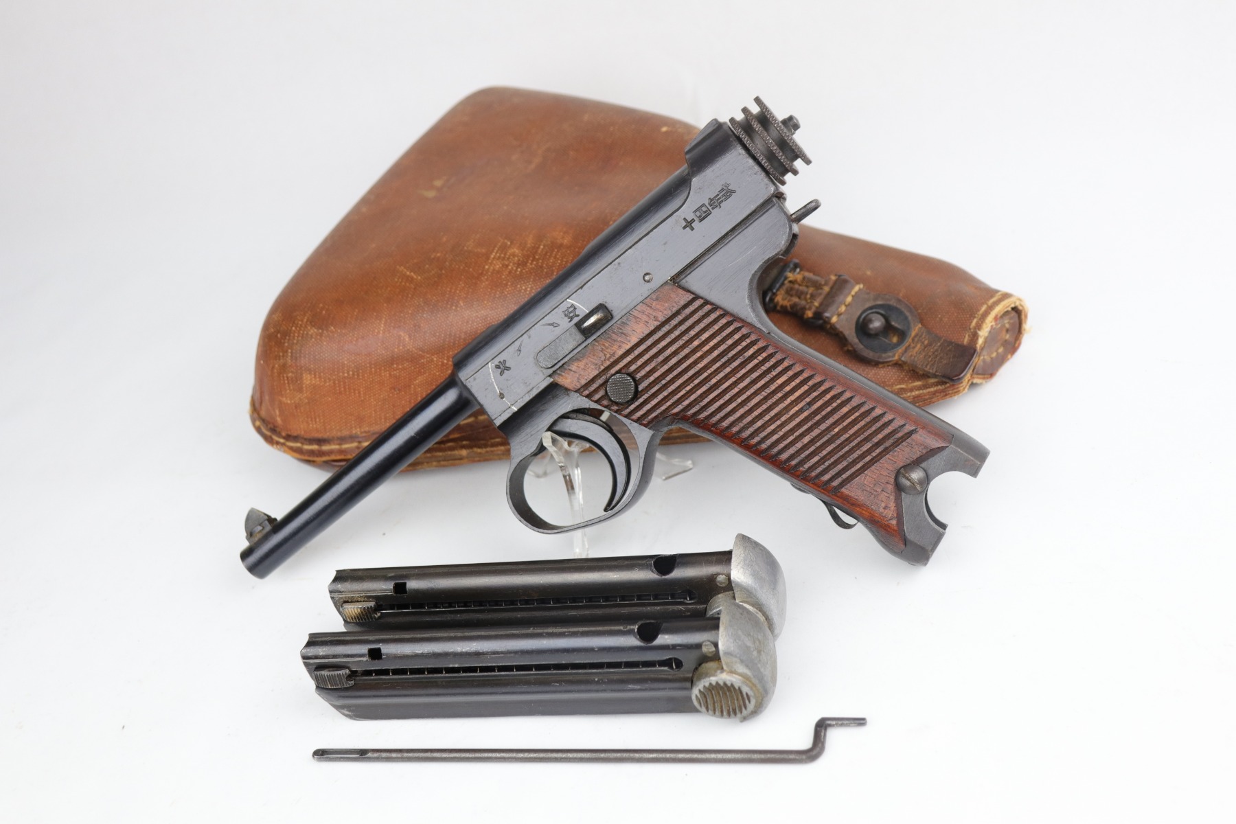 7/28/20 – This is a WW2 Japanese Nambu Type 14 Rig, issued to the Japanese military in 1943. The gun is all matching, including the grips. The gun is in minty condition, retaining about 98+% of its original bluing. There is very little actual finish loss – one small spot on the trigger guard. There is, however, very light freckling here and there. Excellent bore – shiny with strong rifling. The rig comes with an original holster, cleaning rod, spare firing pin, and two magazines. Neither of the magazines are matching but one (574) is very close.