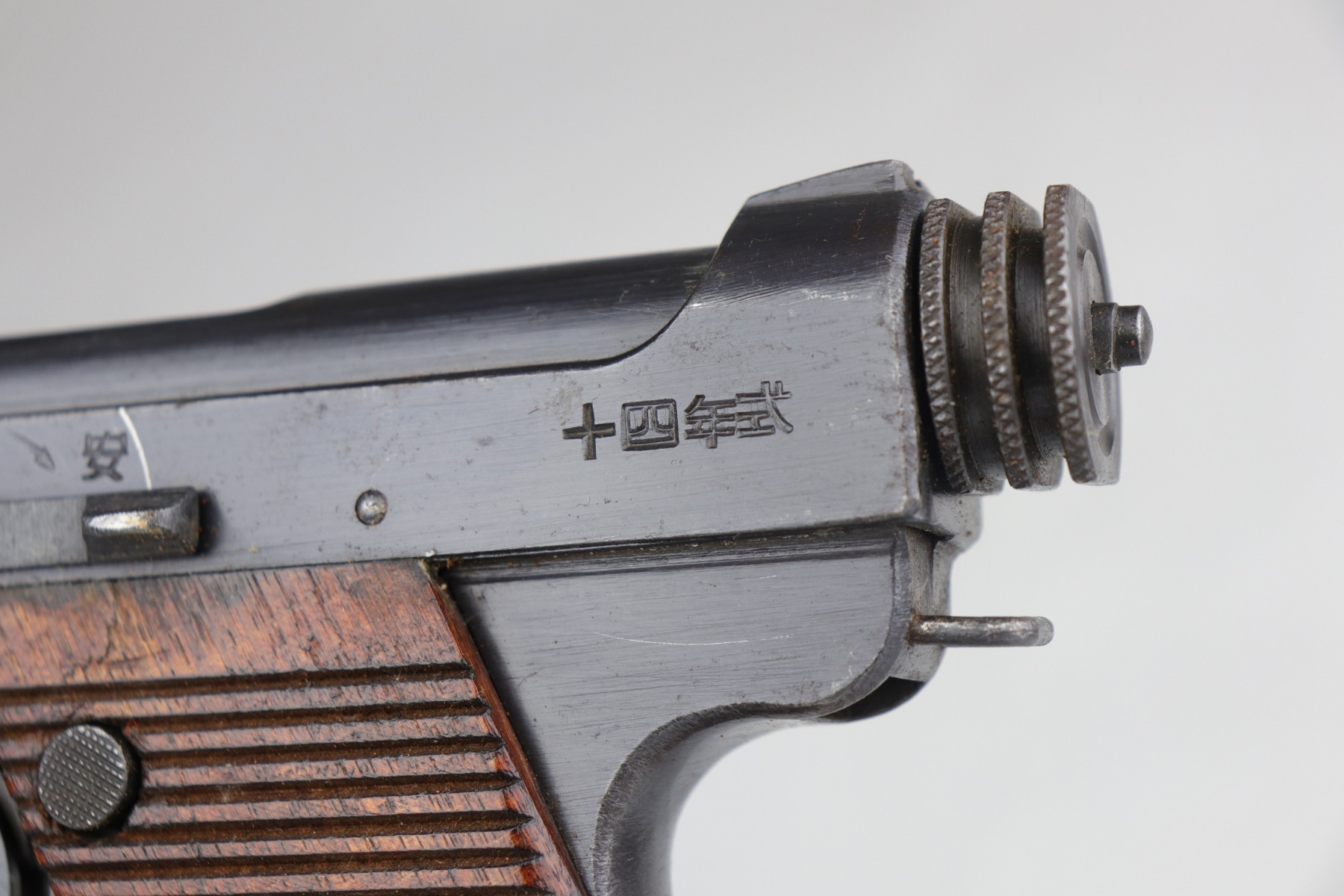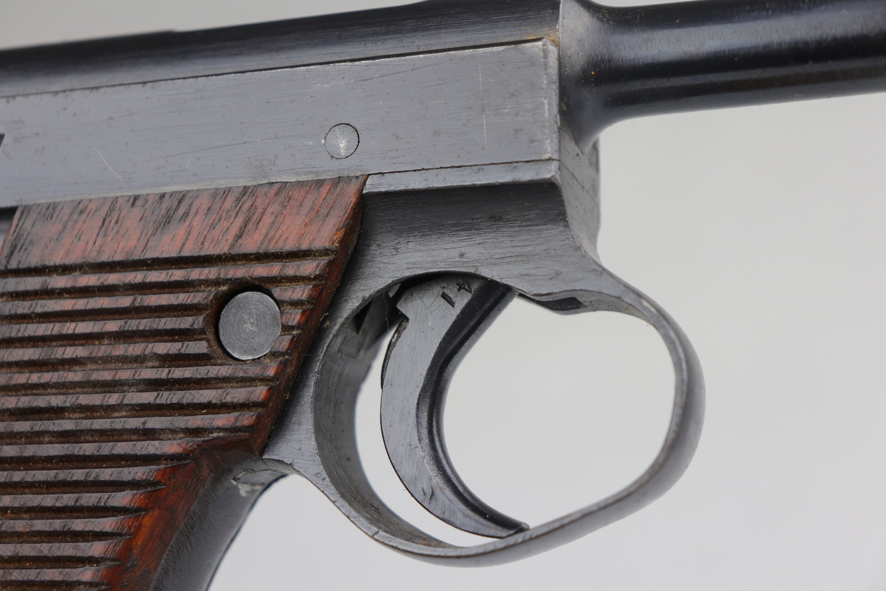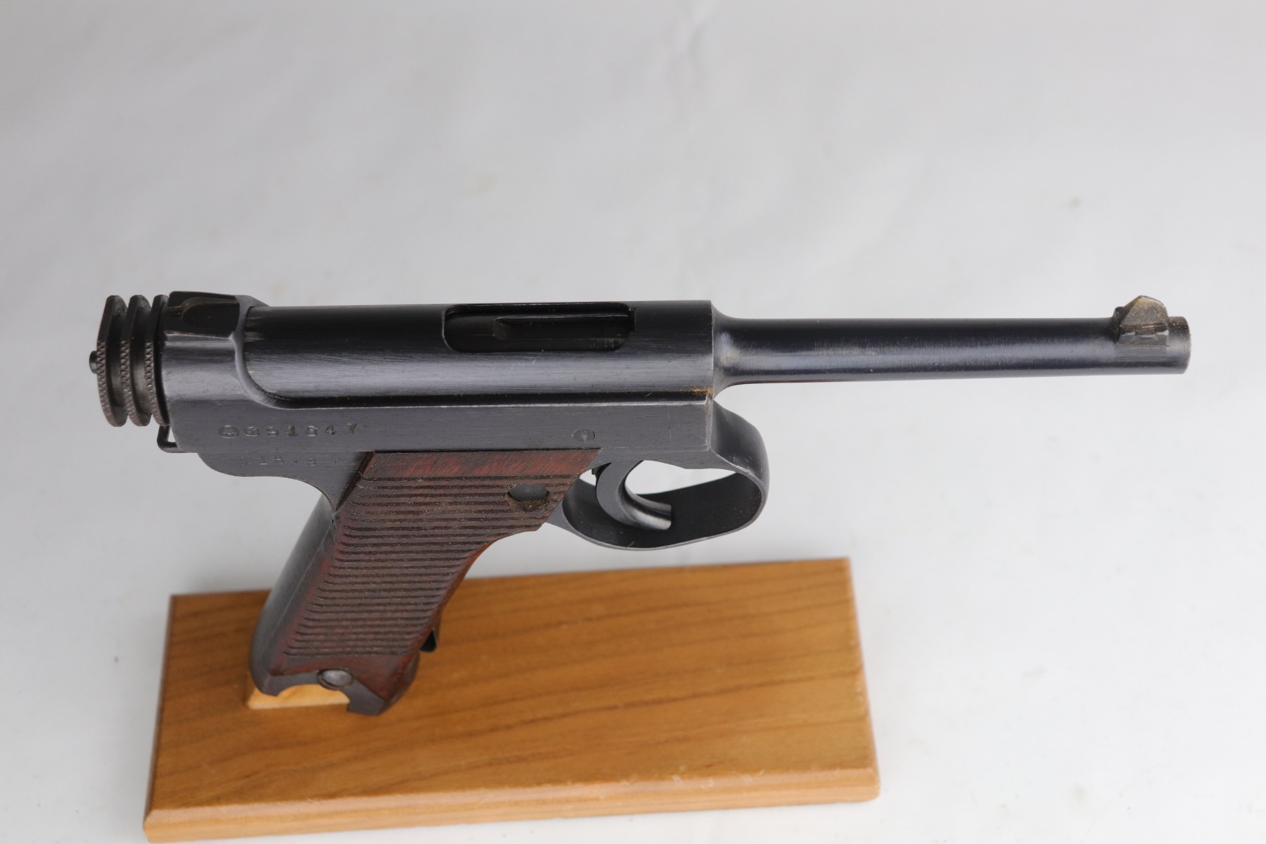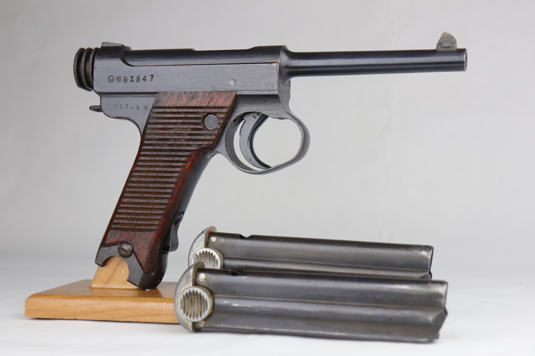7/28/20 – This is a WW2 Japanese Nambu Type 14 Rig, issued to the Japanese military in 1943. The gun is all matching, including the grips. The gun is in minty condition, retaining about 98+% of its original bluing. There is very little actual finish loss – one small spot on the trigger guard. There is, however, very light freckling here and there. Excellent bore – shiny with strong rifling. The rig comes with an original holster, cleaning rod, spare firing pin, and two magazines. Neither of the magazines are matching but one (574) is very close.
