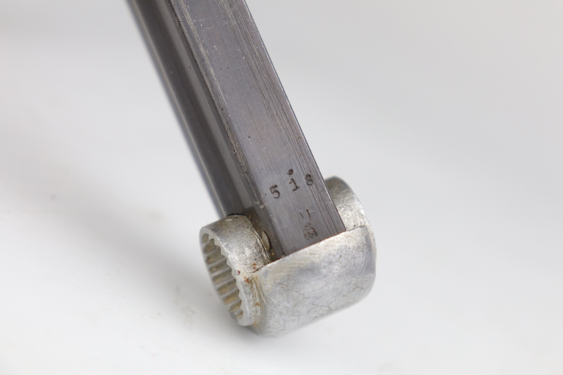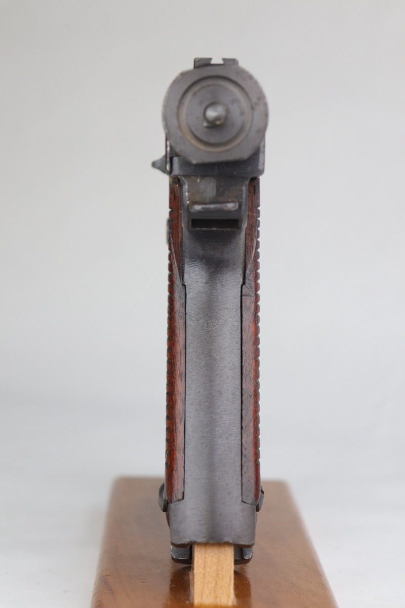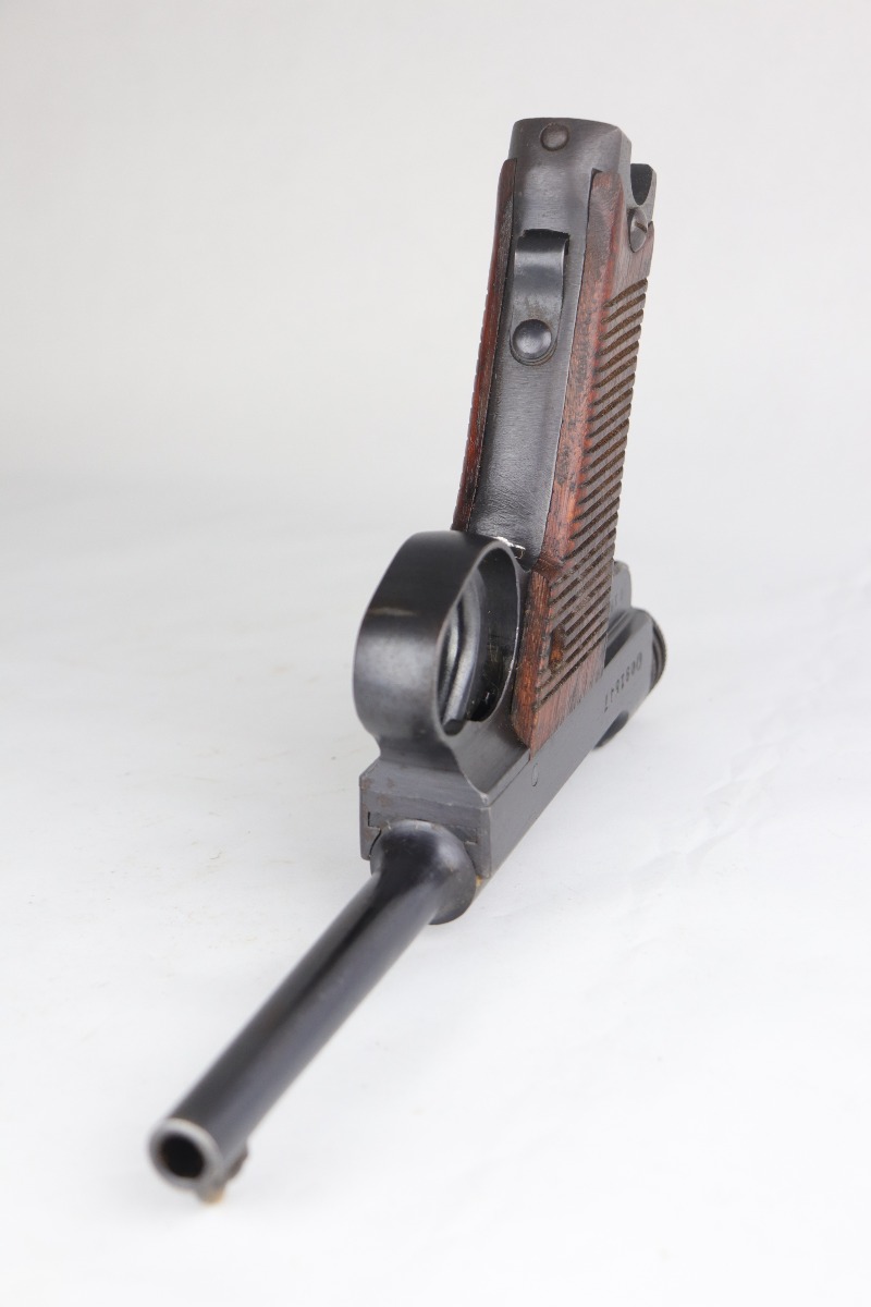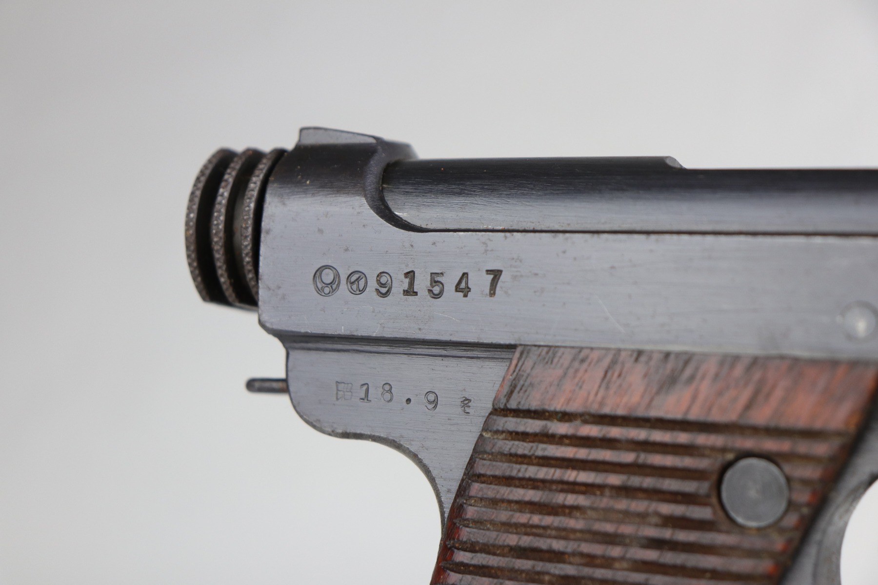 7/28/20 – This is a WW2 Japanese Nambu Type 14 Rig, issued to the Japanese military in 1943. The gun is all matching, including the grips. The gun is in minty condition, retaining about 98+% of its original bluing. There is very little actual finish loss – one small spot on the trigger guard. There is, however, very light freckling here and there. Excellent bore – shiny with strong rifling. The rig comes with an original holster, cleaning rod, spare firing pin, and two magazines. Neither of the magazines are matching but one (574) is very close.