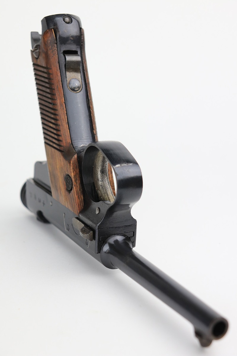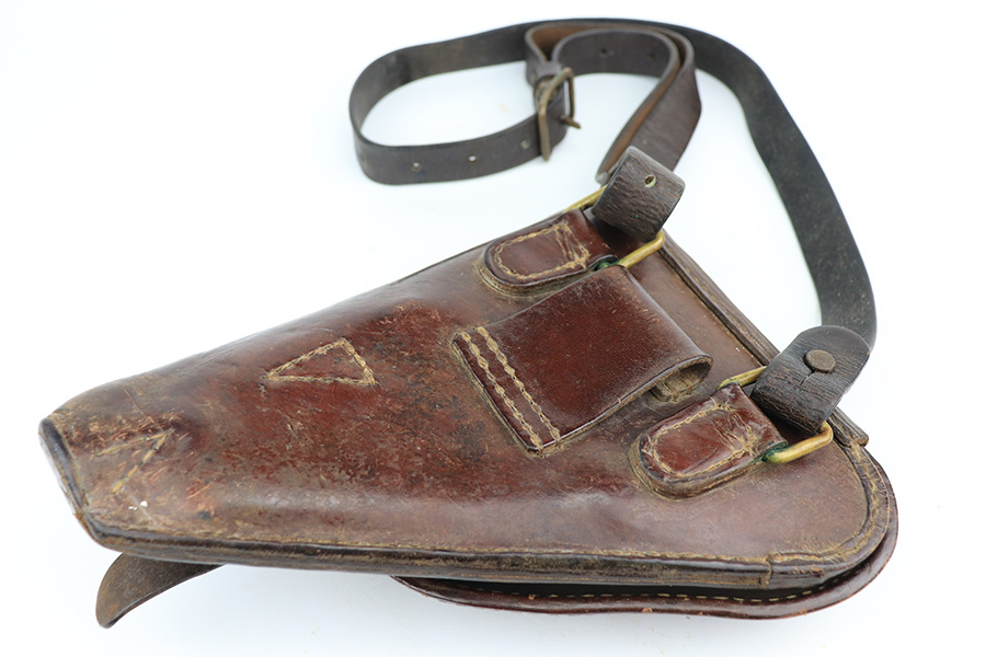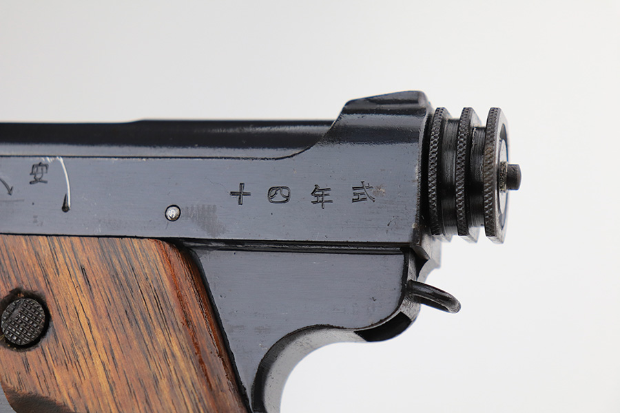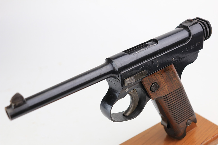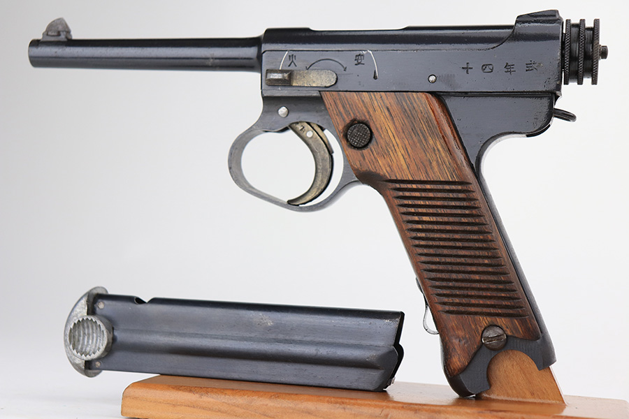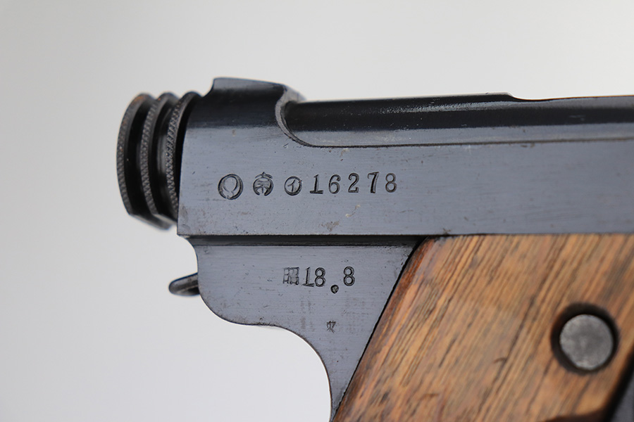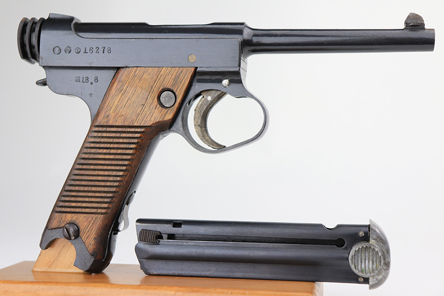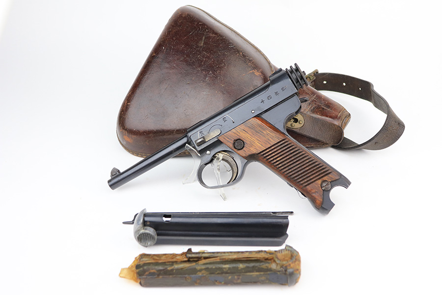 3/10/22 – This is a near-mint example of a Nambu Type 14 issued to the Japanese military in August of 1943. The gun is all matching and comes as a complete rig with two original matching-numbered magazines, cleaning rod, and rare hardshell leather holster with an original shoulder strap. The spare magazine is still in the original paper wrapping! The gun itself has retained almost all of its original finish. There is a small area of spotty discoloration on the underside of the barrel. There is tiny freckling here and there, but it most noticeable on both grip straps, where there is also some pin-pricking. Comes with excellent un-numbered wood grips. Mint bore.