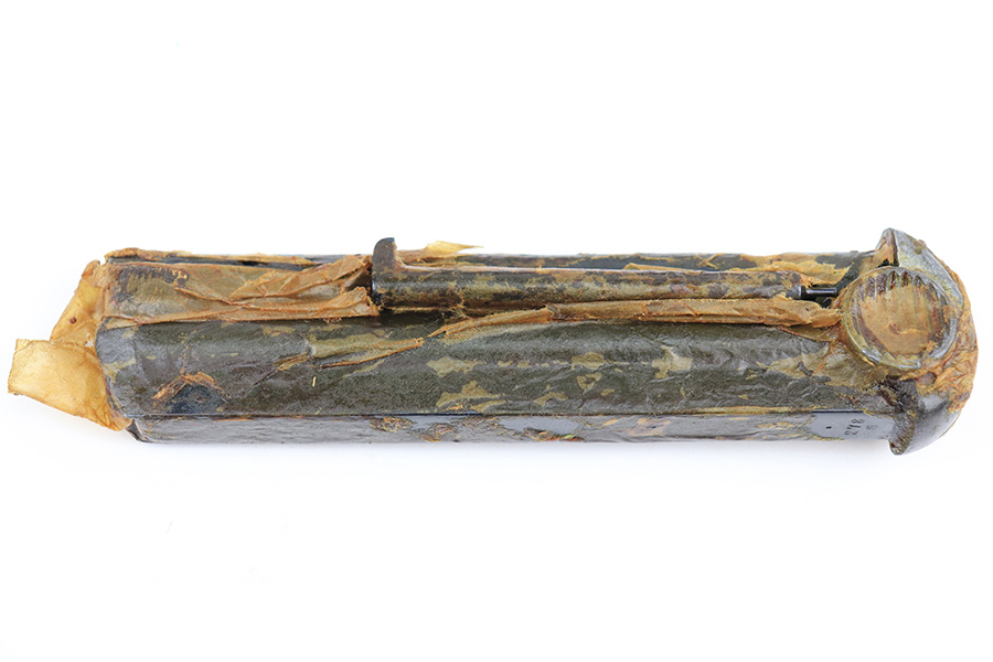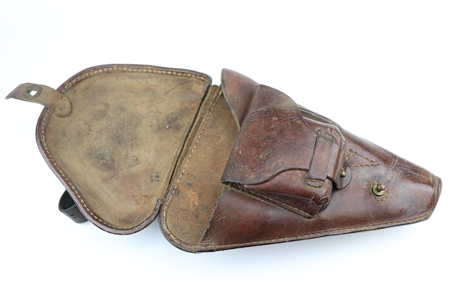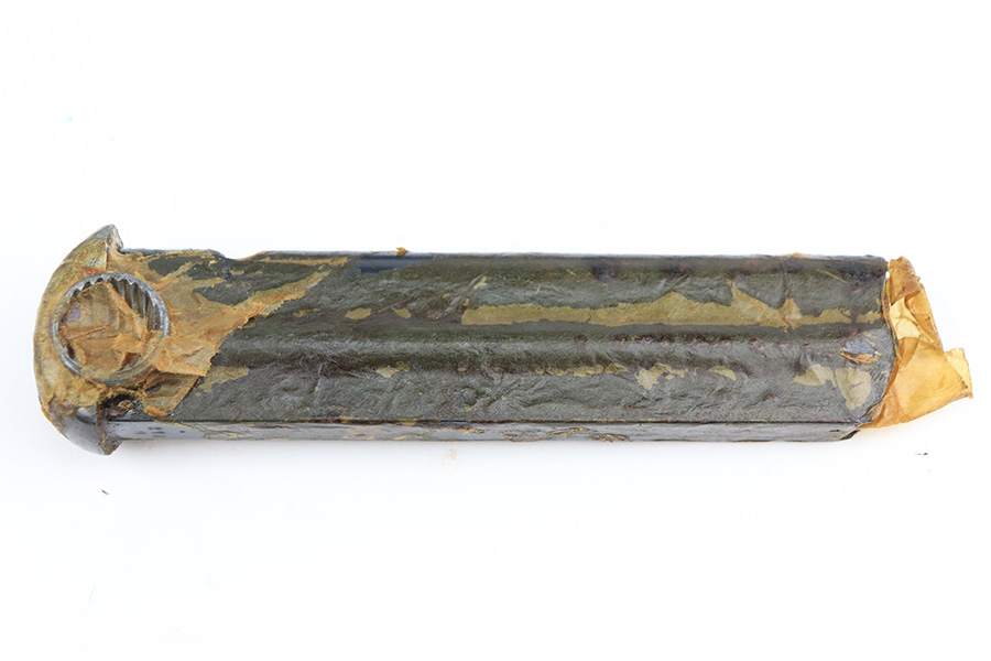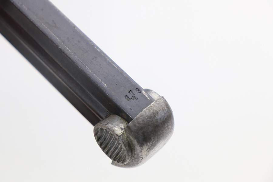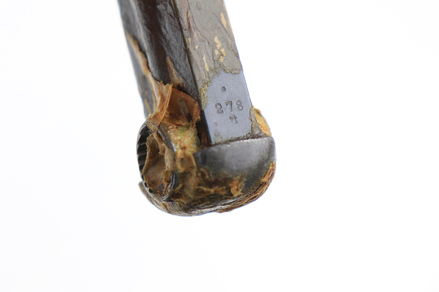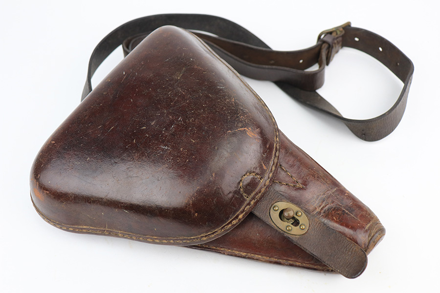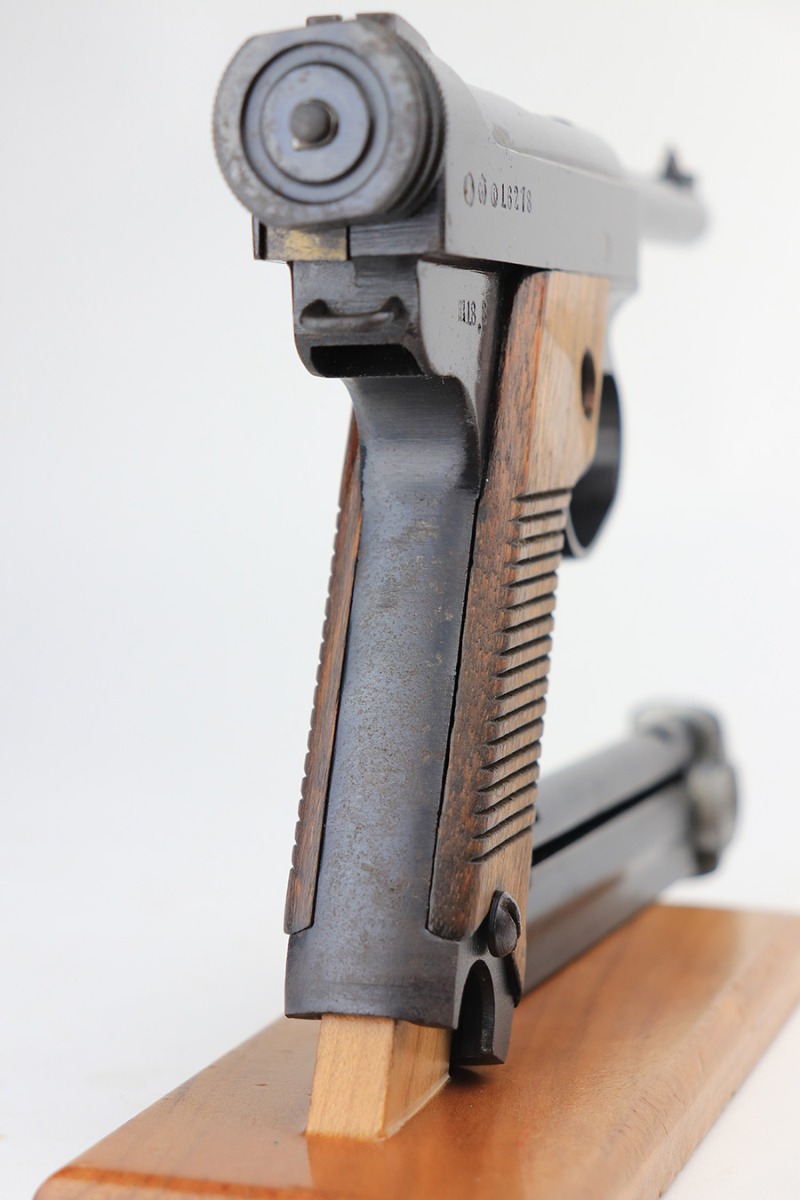 3/10/22 – This is a near-mint example of a Nambu Type 14 issued to the Japanese military in August of 1943. The gun is all matching and comes as a complete rig with two original matching-numbered magazines, cleaning rod, and rare hardshell leather holster with an original shoulder strap. The spare magazine is still in the original paper wrapping! The gun itself has retained almost all of its original finish. There is a small area of spotty discoloration on the underside of the barrel. There is tiny freckling here and there, but it most noticeable on both grip straps, where there is also some pin-pricking. Comes with excellent un-numbered wood grips. Mint bore.