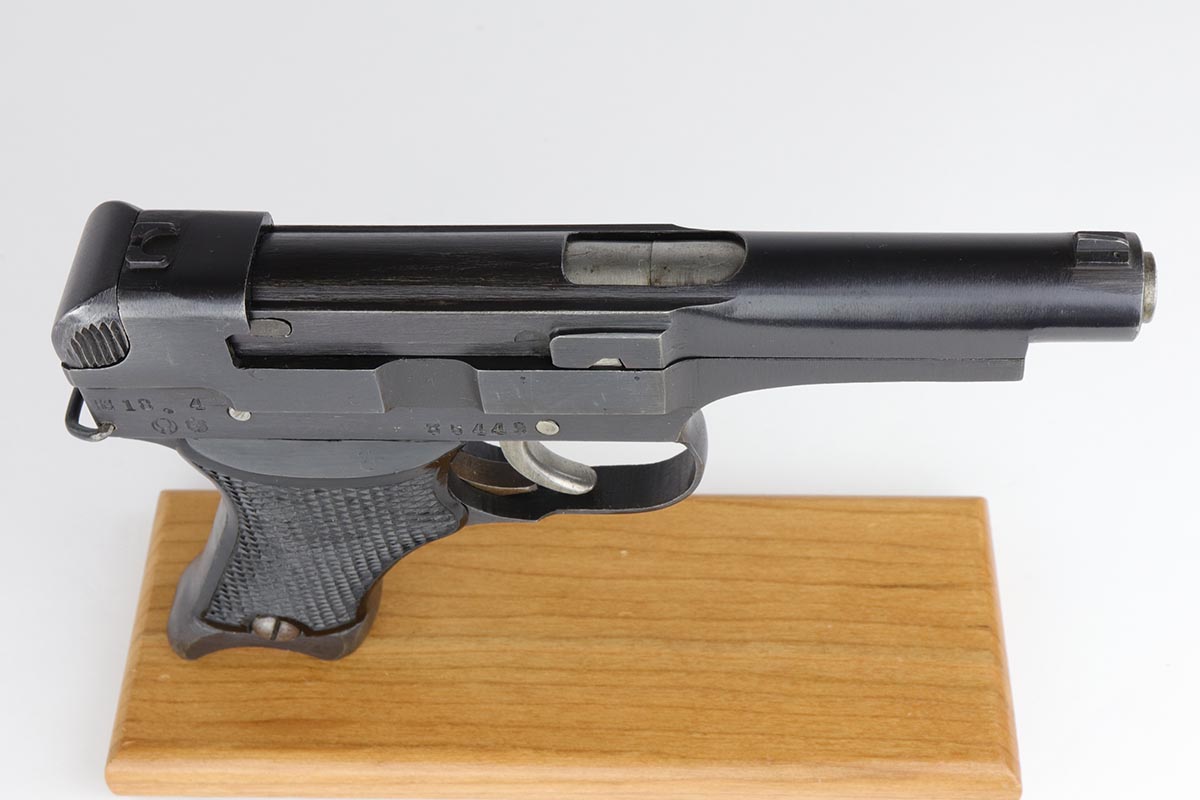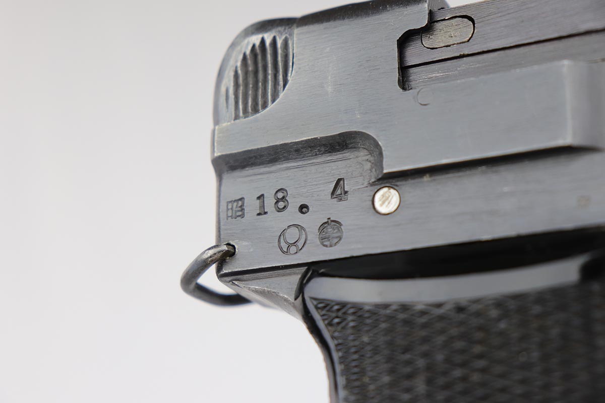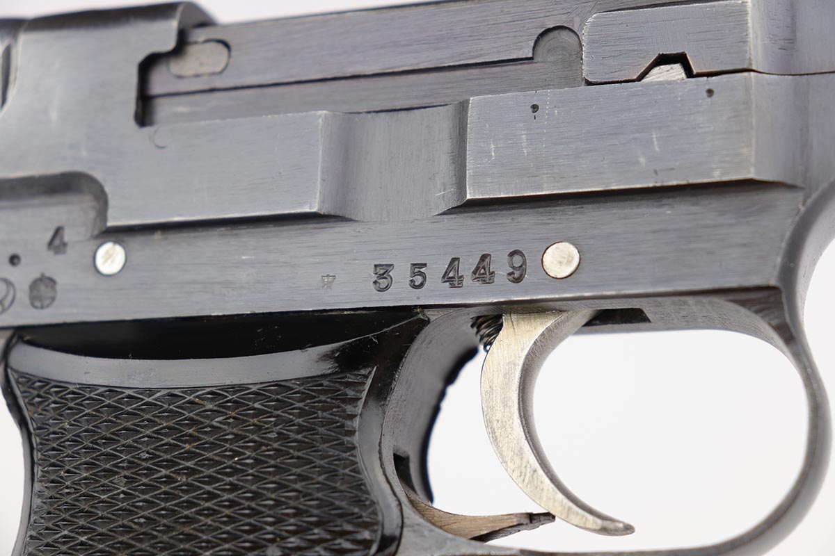 6/13/19 – This is a near-mint Type 94 Nambu with one original, matching magazine. Made in April of 1943, the pistol has 98% original blue, with minor edge thinning and slight finish loss on the straps. Terrific bore and nice grips, though they do have some minor handling wear.