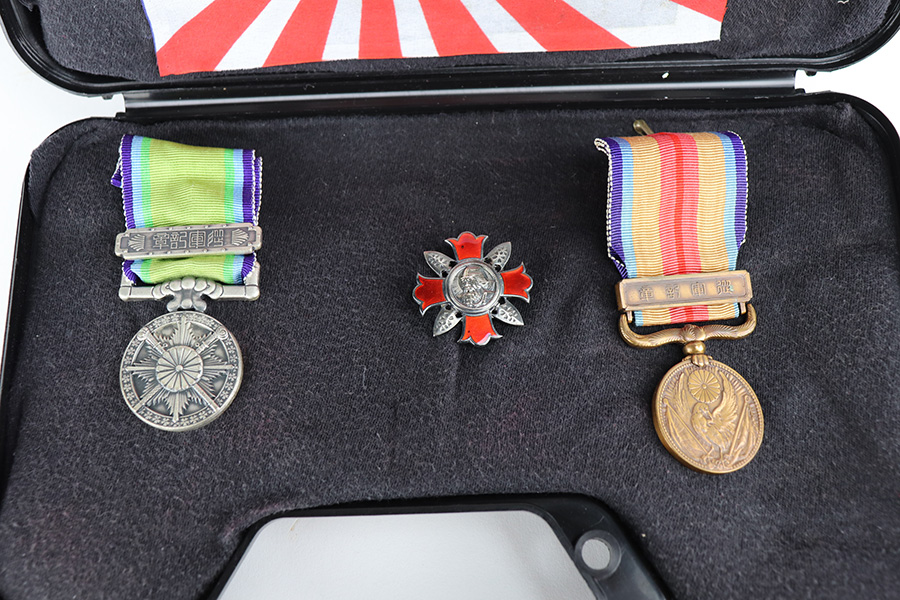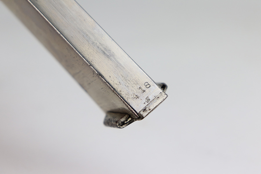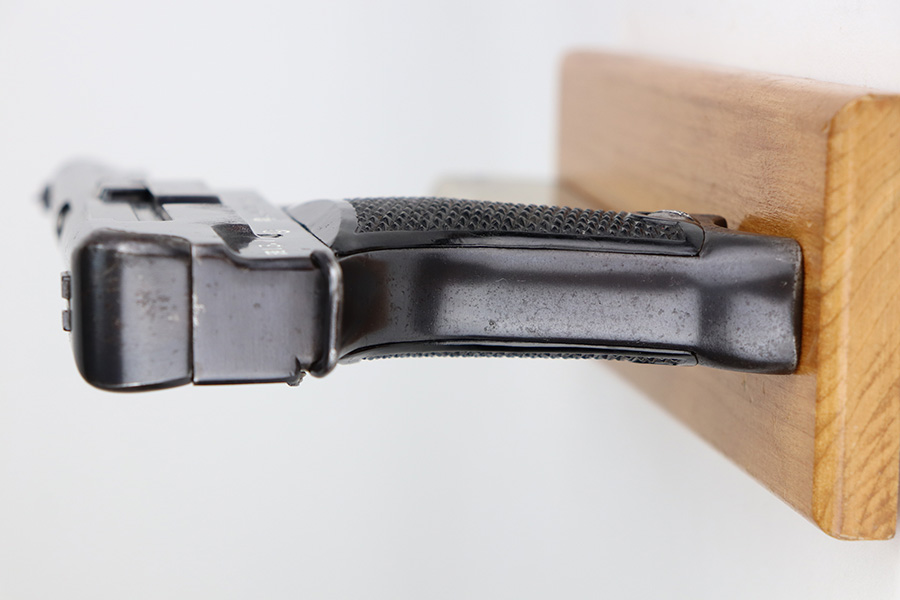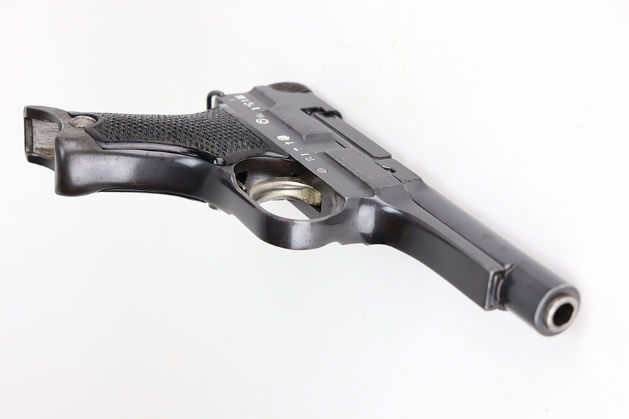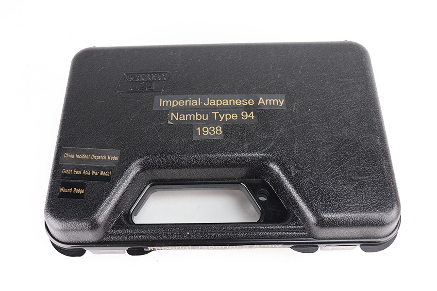 5/5/21 – This is a minty example of a Nambu Type 94 issued to the Japanese military in January of 1938. This gun is being sold on consignment. The consignor put together a very cool assembly to accompany the gun that includes a labeled hard case, repro Japanese flag, and several period Japanese military medals. The gun is all matching and comes with one original matching magazine. It has retained about 98% of its original bluing. Just a hint of wear on some of the high edges. While there isn’t much actual finish loss, there are areas of minor freckling and pitting throughout. Excellent black bakelite grips. The bore is excellent – shiny with strong rifling.