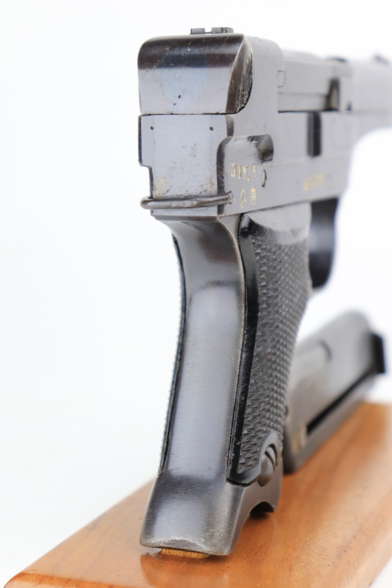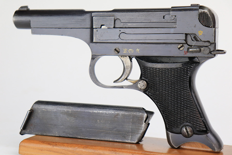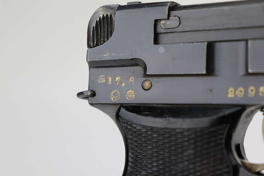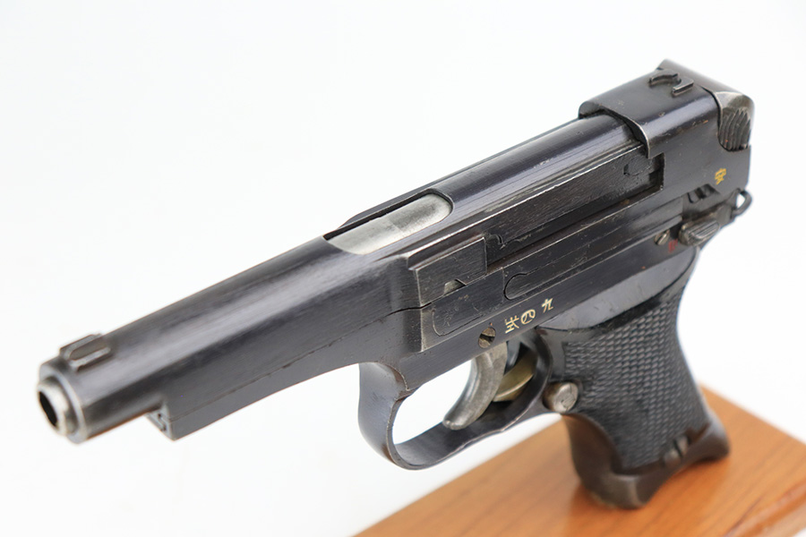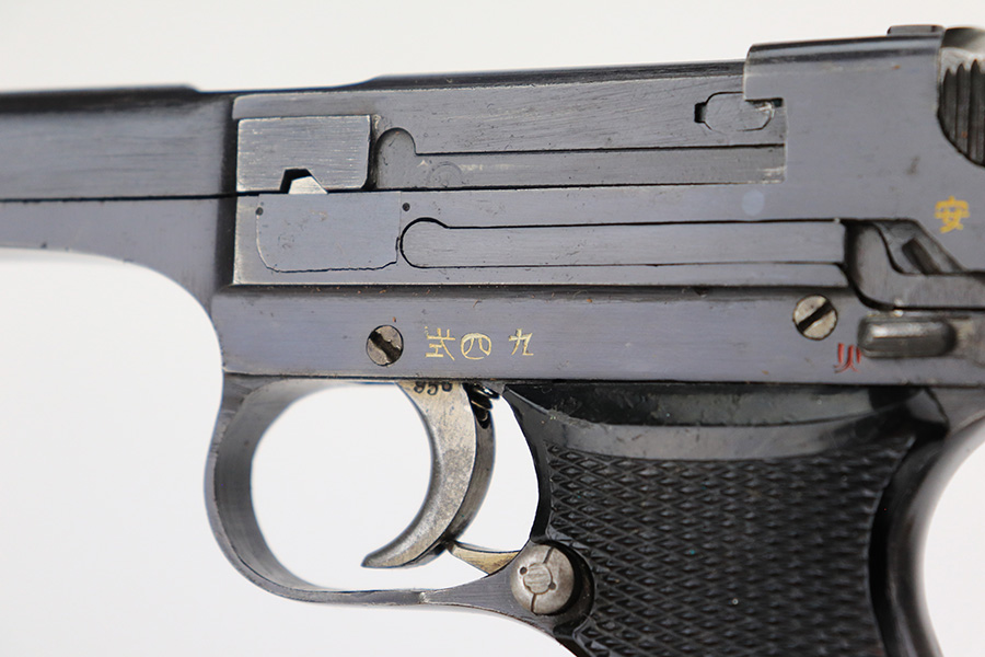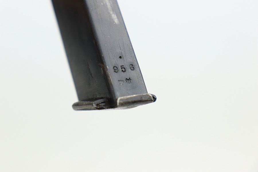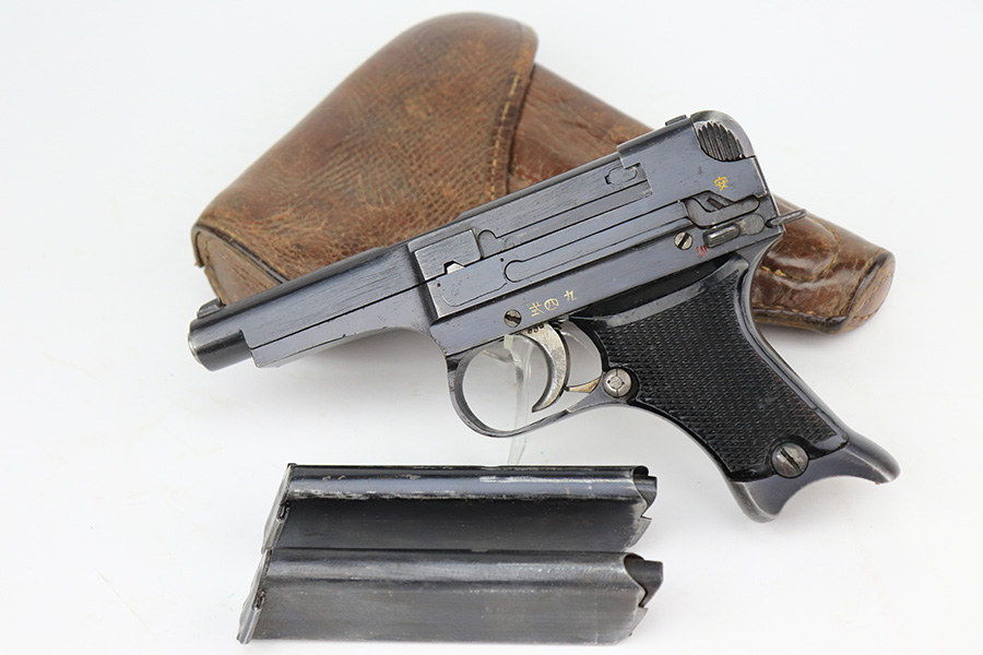 5/19/22 – This is a minty example of a Nambu Type 94 issued to the Japanese military in August of 1942. The gun is all matching and comes as a rig with an excellent period-correct tan leather holster, one original matching-numbered magazine, and one period-correct magazine that is not matching but is very close in number. The holster also has what appears to be an original wood hang tag on the back with kanji writing on it. The gun itself has retained about 97-98% of its original bluing with hints of wear on some of the high edges and minor wear at the base of both straps. Comes with very nice black bakelite grips. Mint bore.
