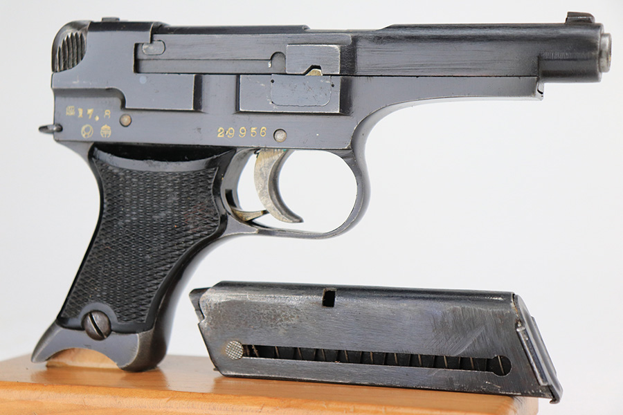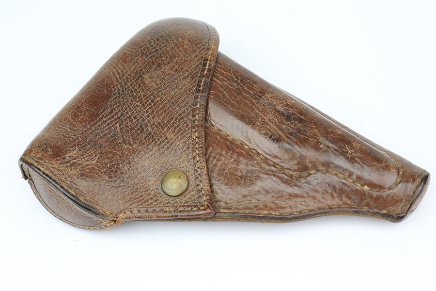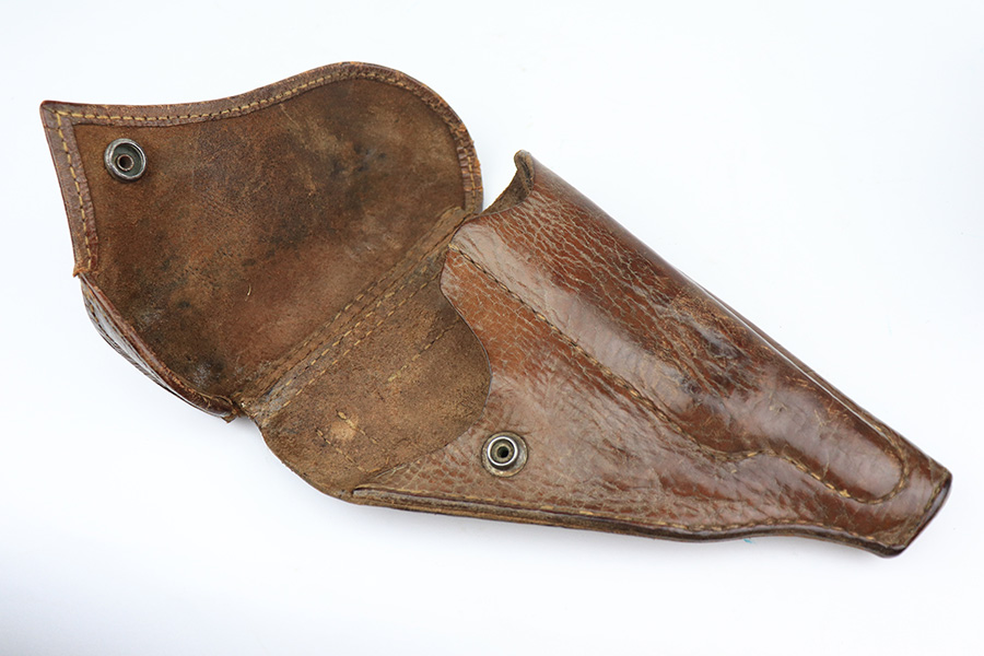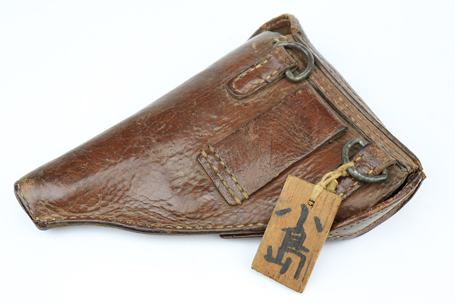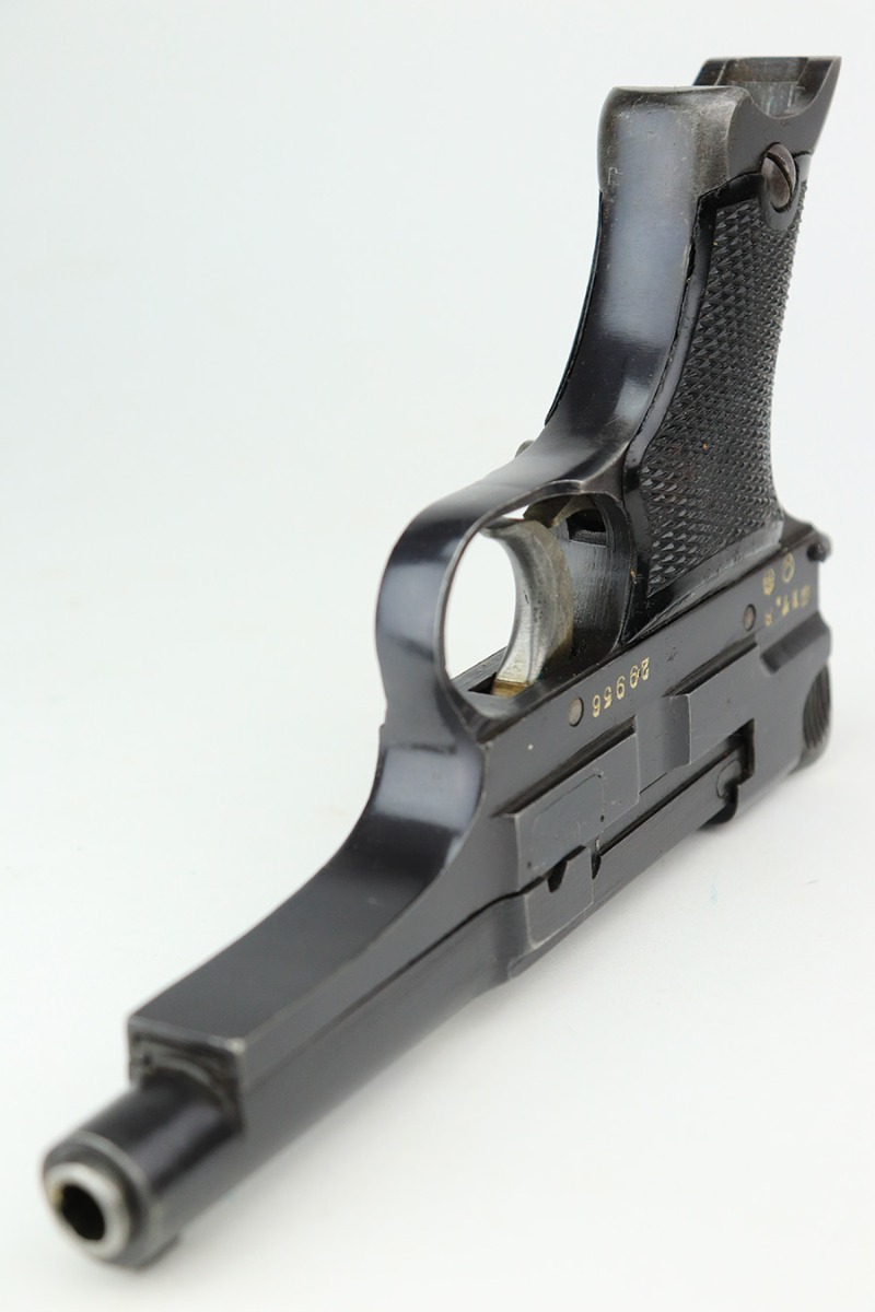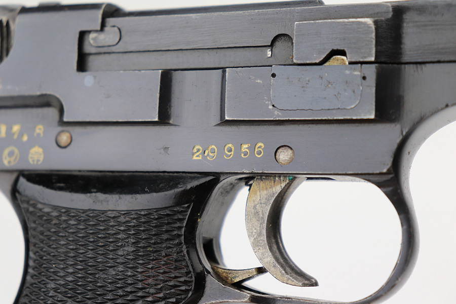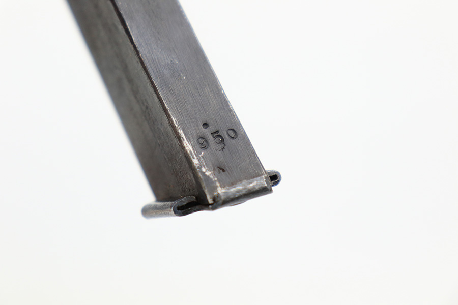 5/19/22 – This is a minty example of a Nambu Type 94 issued to the Japanese military in August of 1942. The gun is all matching and comes as a rig with an excellent period-correct tan leather holster, one original matching-numbered magazine, and one period-correct magazine that is not matching but is very close in number. The holster also has what appears to be an original wood hang tag on the back with kanji writing on it. The gun itself has retained about 97-98% of its original bluing with hints of wear on some of the high edges and minor wear at the base of both straps. Comes with very nice black bakelite grips. Mint bore.