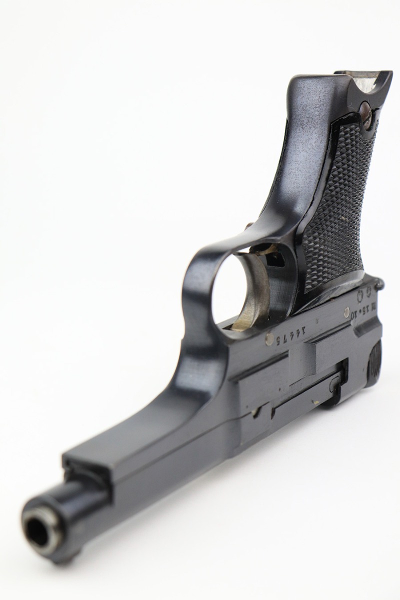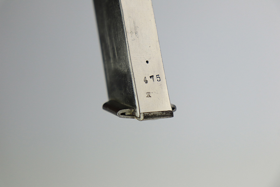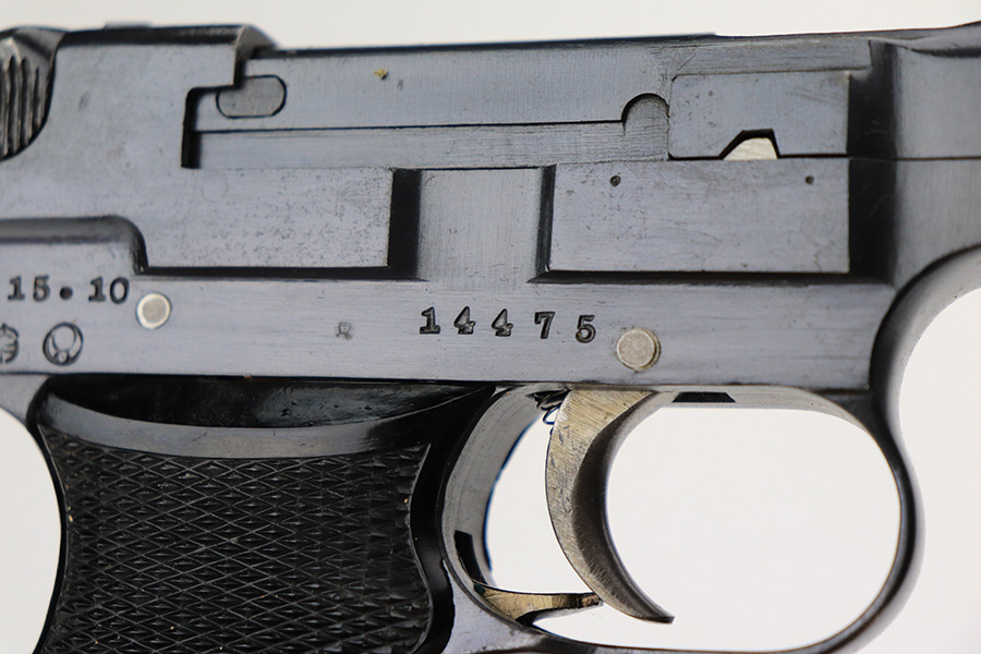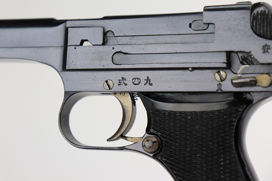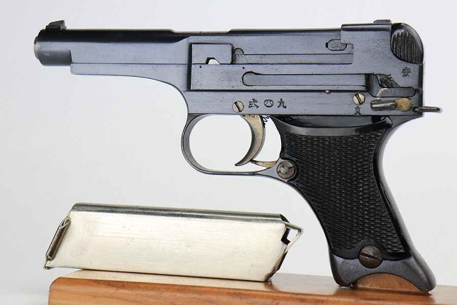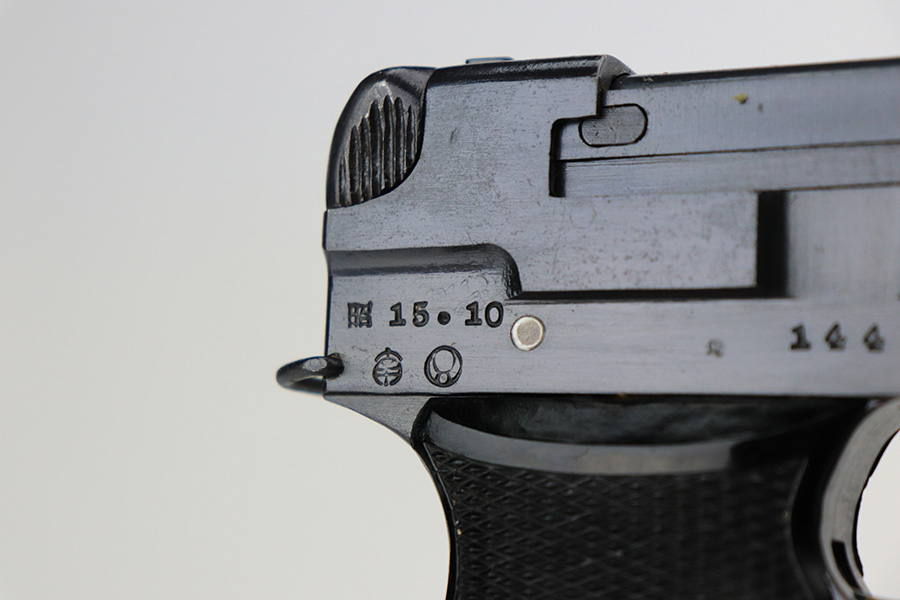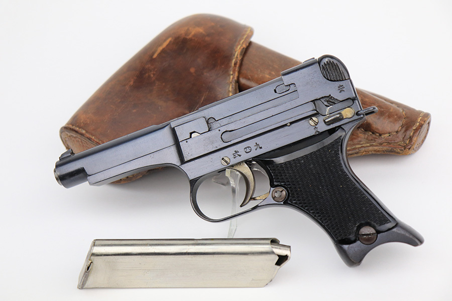 7/18/22 – This is a minty example of a Nambu Type 94 issued to the Japanese military in October of 1940. The gun is all matching and has straw-colored small parts (early feature). It comes as a rig with a period-correct leather holster and one original matching-numbered magazine. There is almost no actual finish loss on the gun, but there is noticeable pin-pricking on both grip straps. Comes with excellent period-correct black bakelite grips. Minty bore.