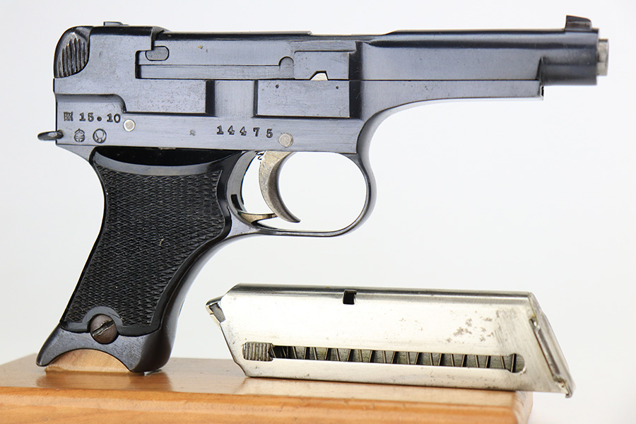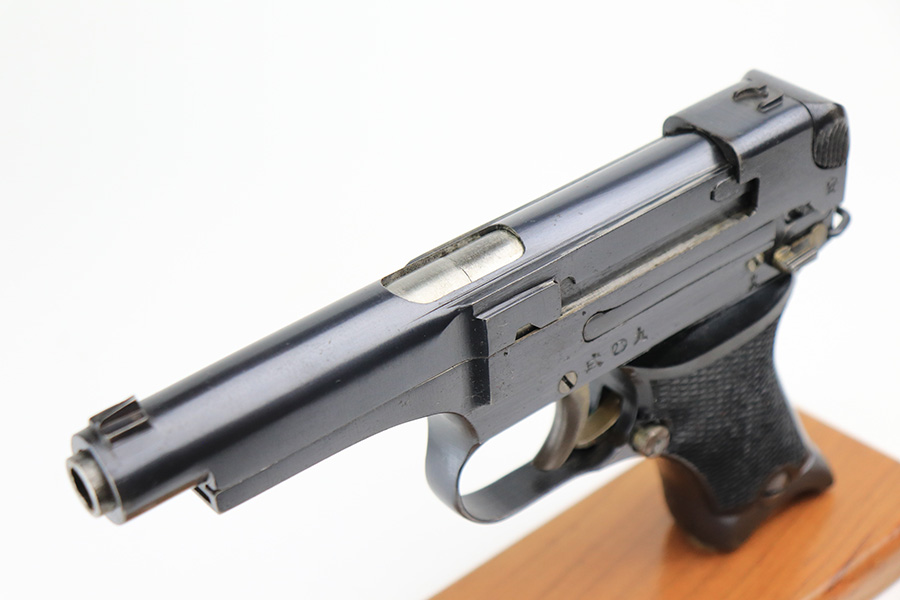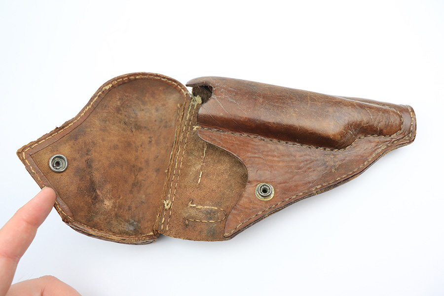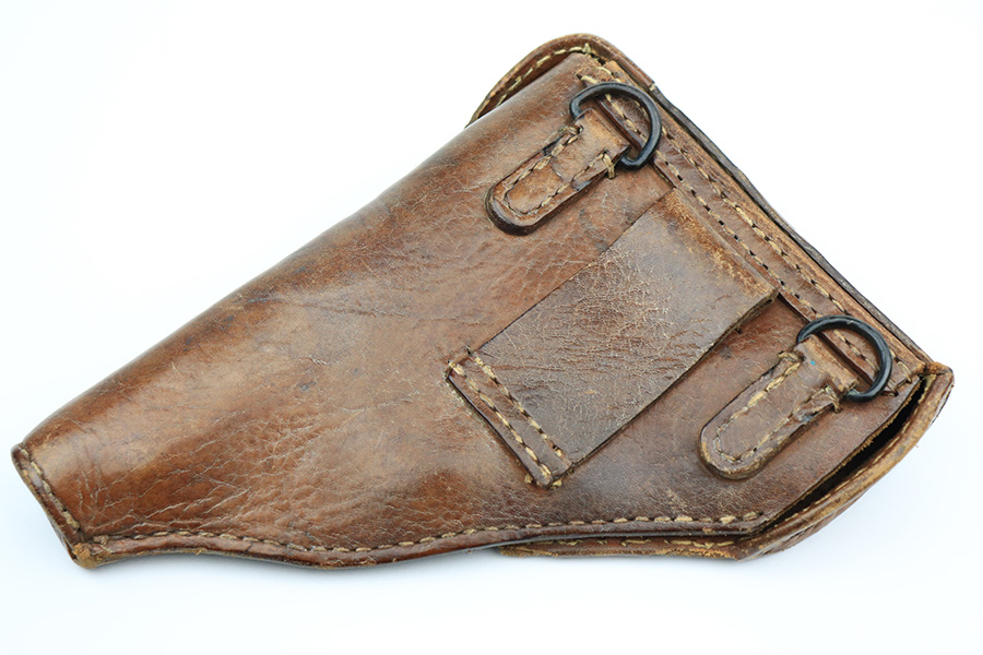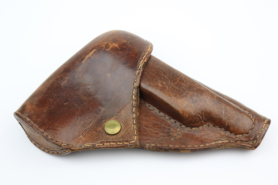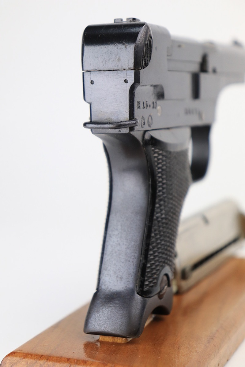 7/18/22 – This is a minty example of a Nambu Type 94 issued to the Japanese military in October of 1940. The gun is all matching and has straw-colored small parts (early feature). It comes as a rig with a period-correct leather holster and one original matching-numbered magazine. There is almost no actual finish loss on the gun, but there is noticeable pin-pricking on both grip straps. Comes with excellent period-correct black bakelite grips. Minty bore.