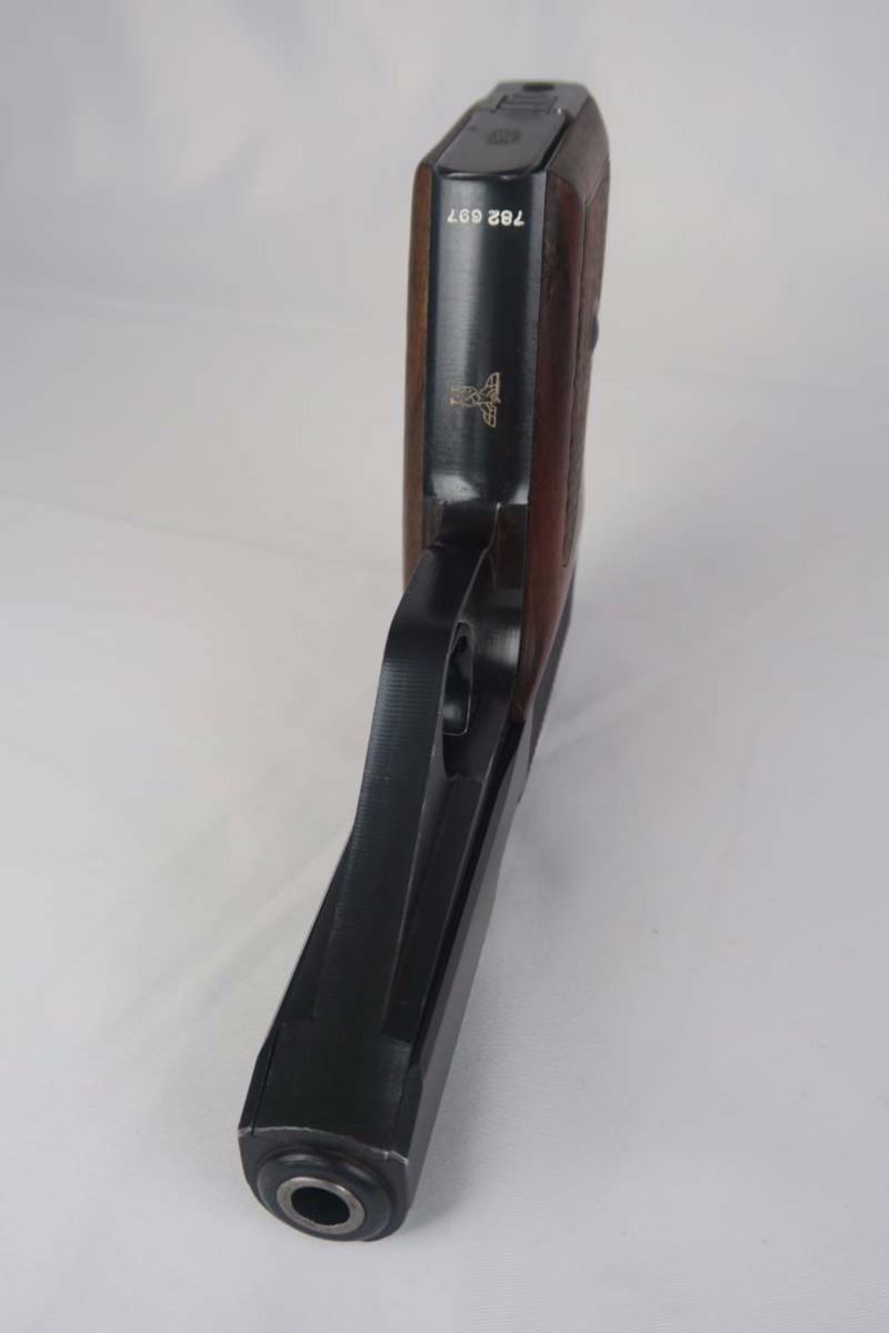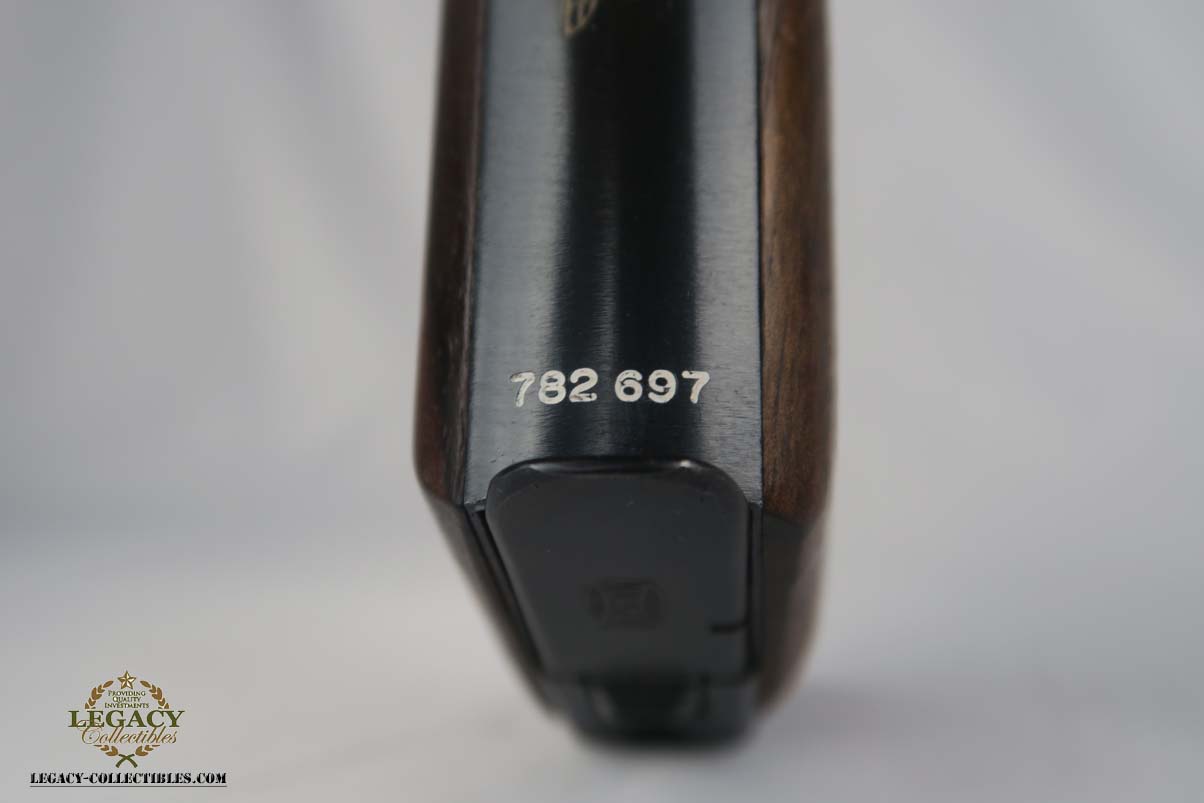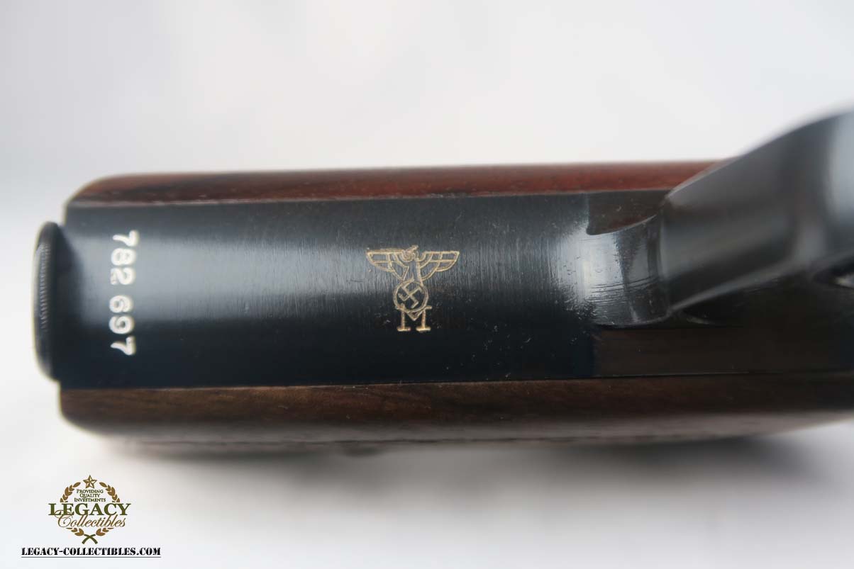 4/26/19 – This is an early Nazi Navy marked HSc.   The high polish finish is about 99% and the frame, slide and locking block are all matching.  It is in the correct serial range for a variation 2 Navy pistol which has the Nazi Navy insignia on the front strap.  The grips are excellent as well with no chips or cracks.  Comes with the correct early Mauser banner magazine as well.   Appears to be all mechanically correct.   Early style Lanyard loop built into the frame.  Mirror bore.   Overall a minty example.