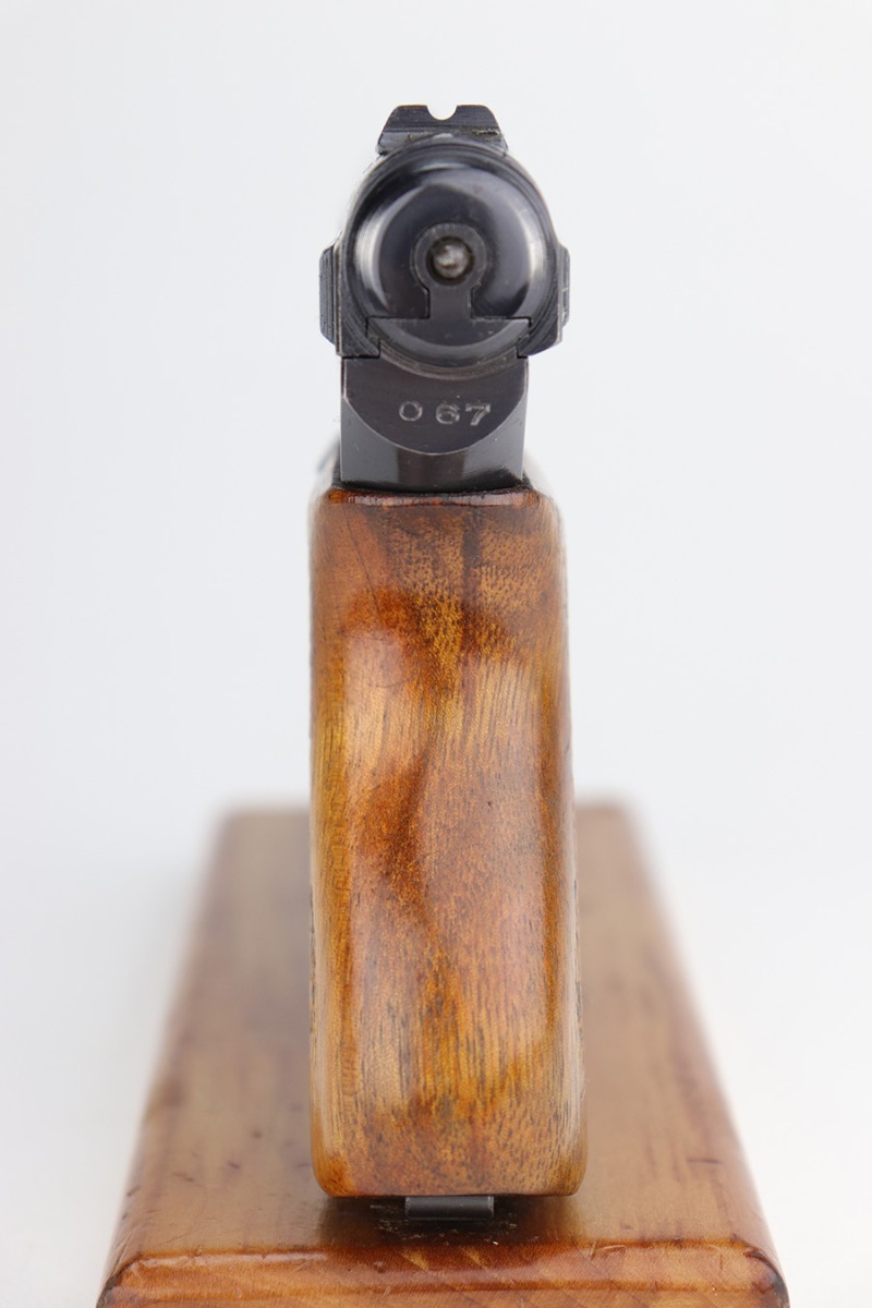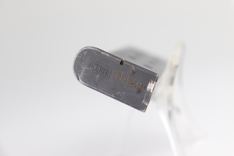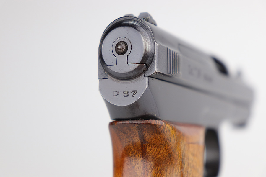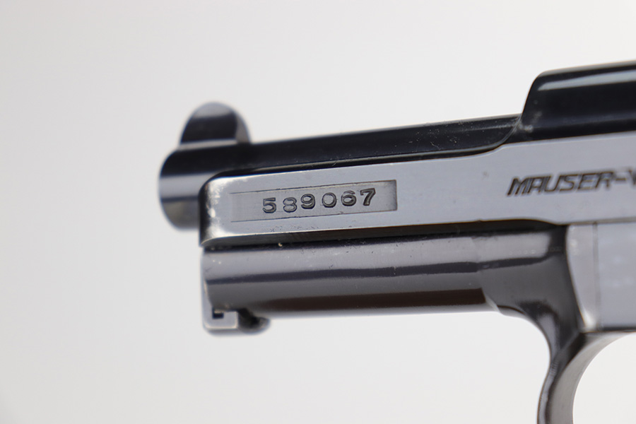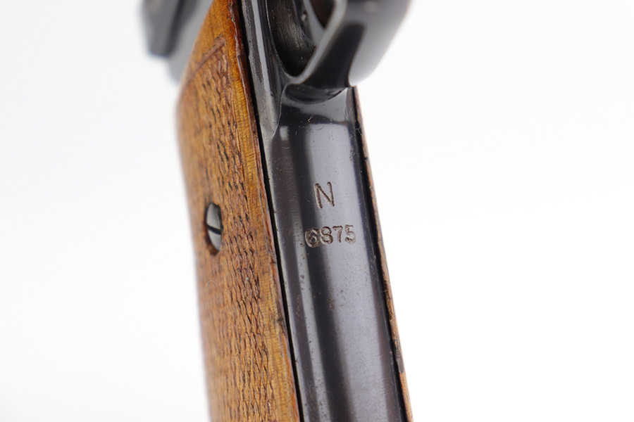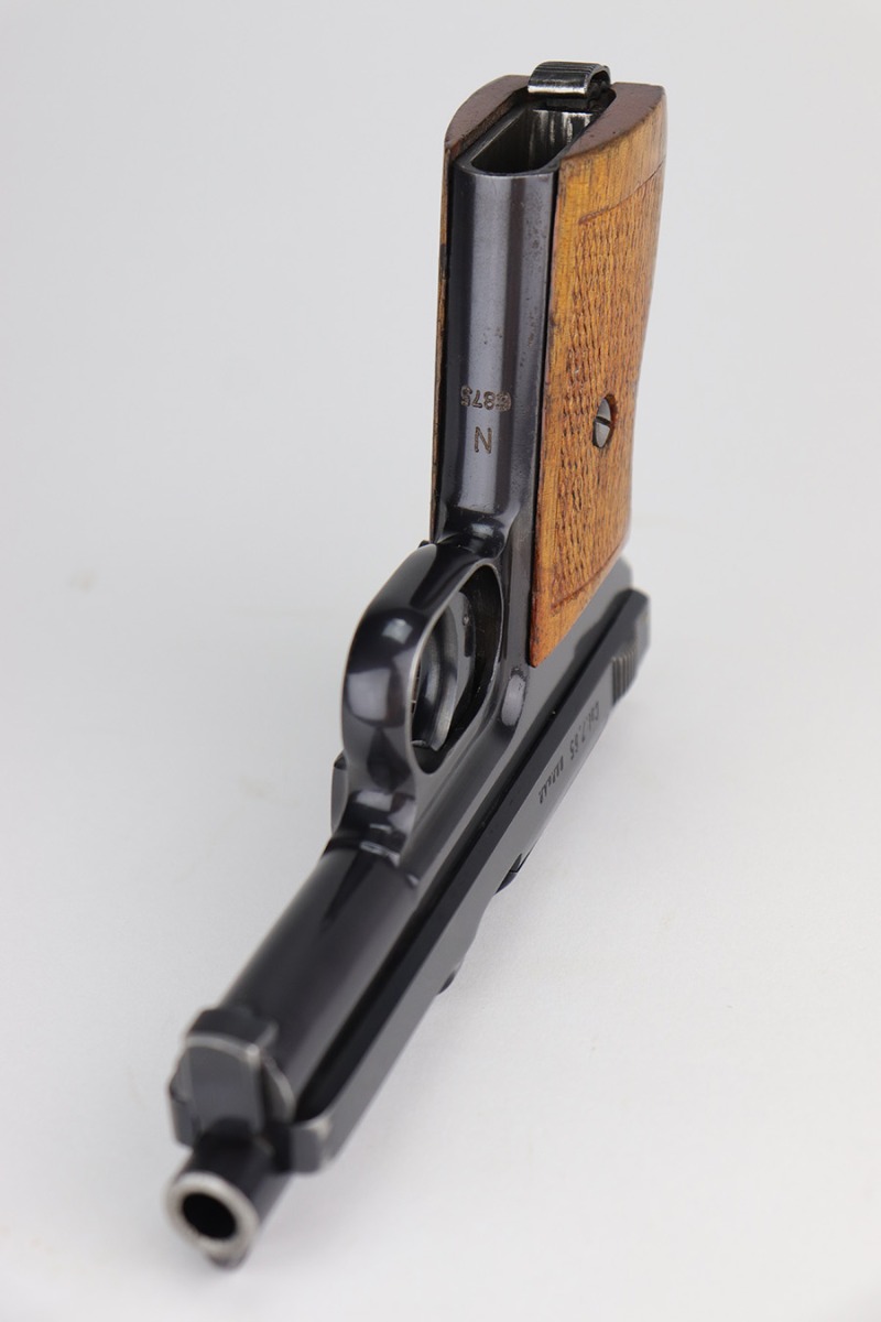 1/8/23 – This is an excellent example of a rare Mauser M1934 that was to the German Kriegsmarine. It’s a first variation example, one of 8,000 produced. It has 97-98% of the original high-polish blue remaining, with wear on the raised front edges of the slide, and a little more on the edges of the trigger guard. Minty bore. Excellent grip with no cracks. Left side frame is marked with the German Navy stamp, and front strap and magazine both have Nordsee property numbers (mismatched).