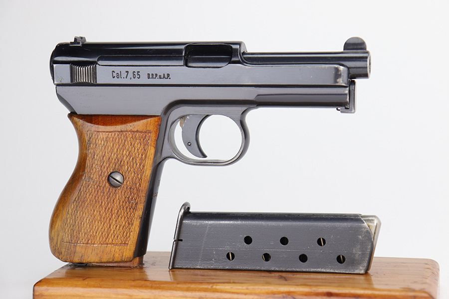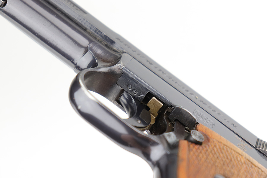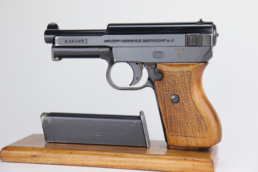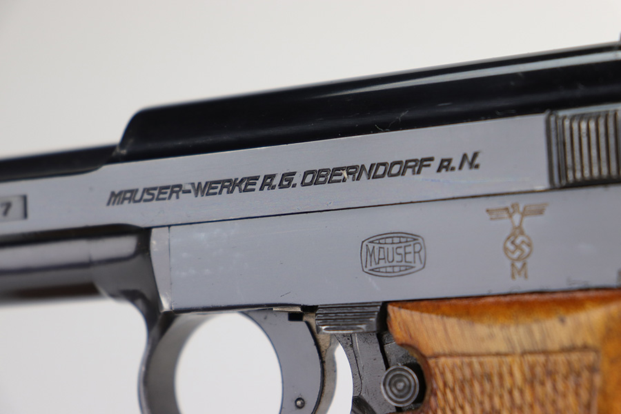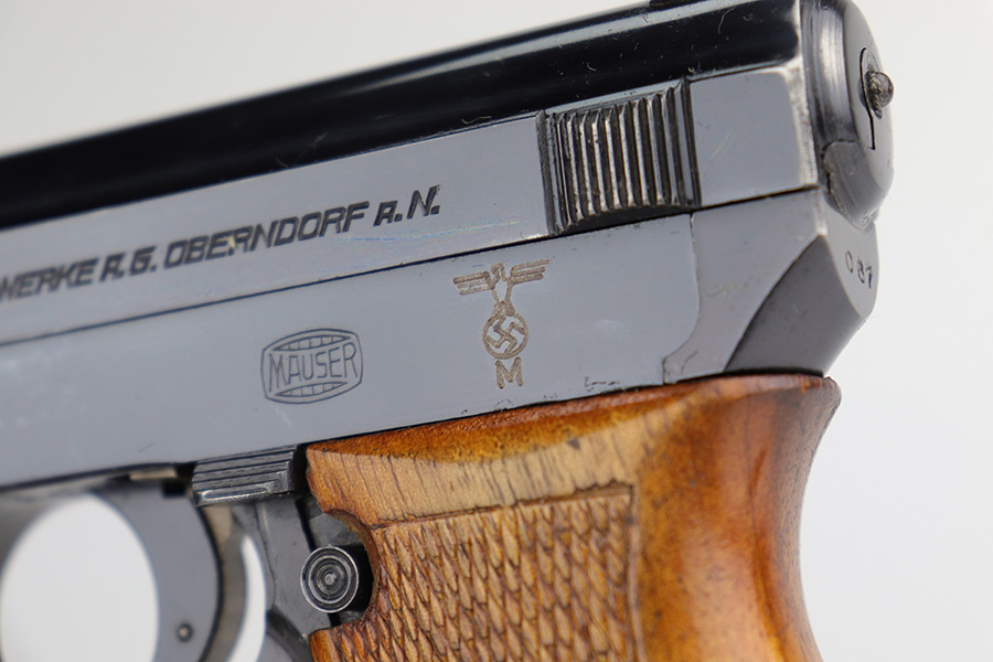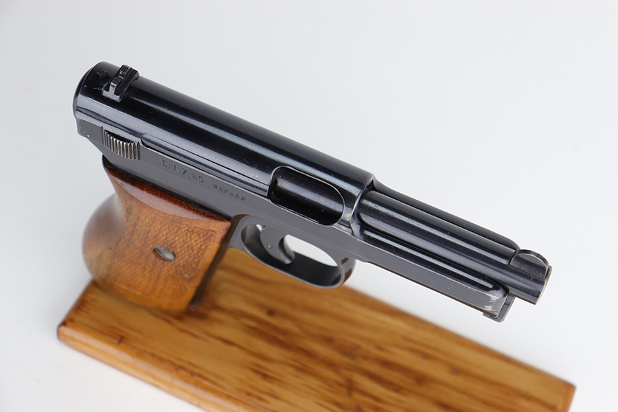 1/8/23 – This is an excellent example of a rare Mauser M1934 that was to the German Kriegsmarine. It’s a first variation example, one of 8,000 produced. It has 97-98% of the original high-polish blue remaining, with wear on the raised front edges of the slide, and a little more on the edges of the trigger guard. Minty bore. Excellent grip with no cracks. Left side frame is marked with the German Navy stamp, and front strap and magazine both have Nordsee property numbers (mismatched).