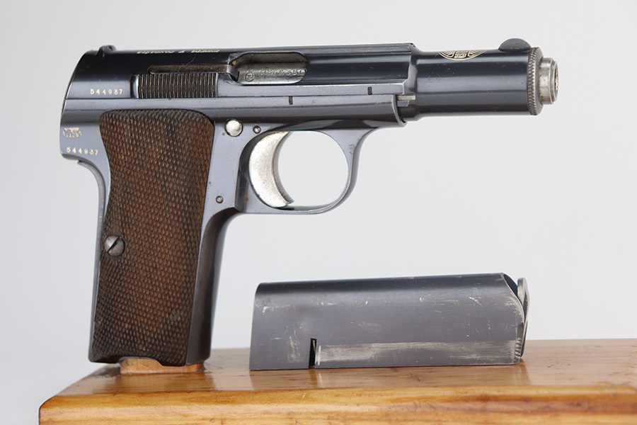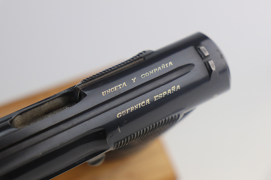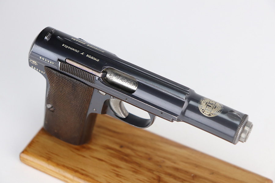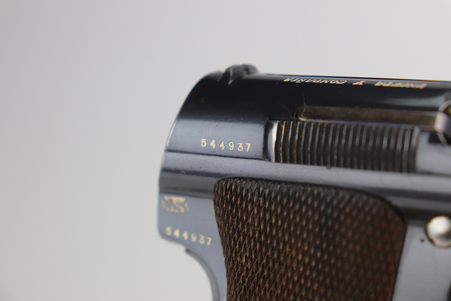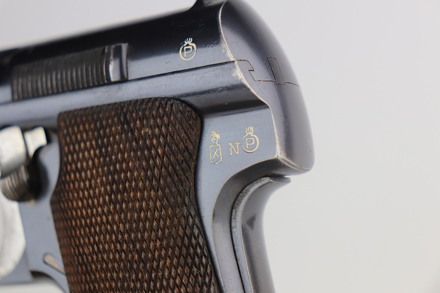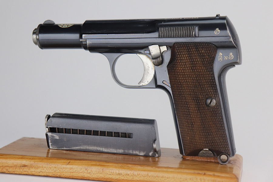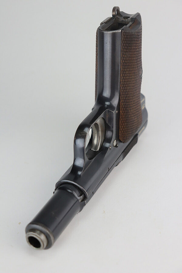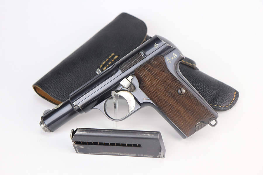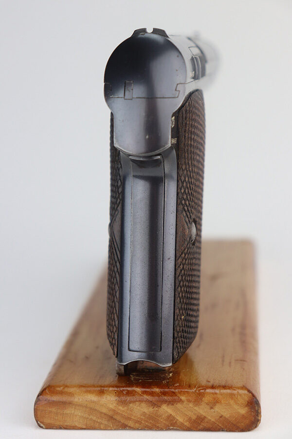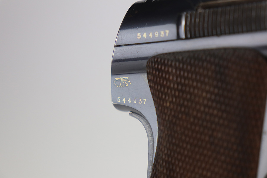 5/25/21 – This is a near-mint example of an Astra Model 300 rig issued to the Nazi military during WW2. The rig comes with one proper magazine and a rare 1944-dated waffen-proofed pebble grain holster. The gun is all matching and has the proper “Waffen 251” military proof. The gun has retained more than 98% of its original bluing. There is just a hint of wear on some of the high edges and very minor pin pricking on the straps. A few very light surface scratches here and there. Comes with excellent grips. Excellent bore – shiny with strong rifling.