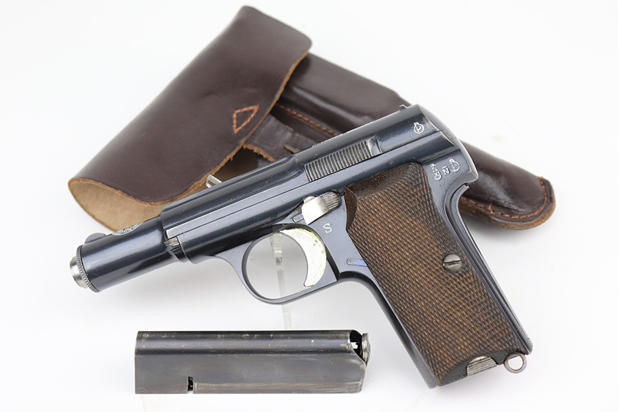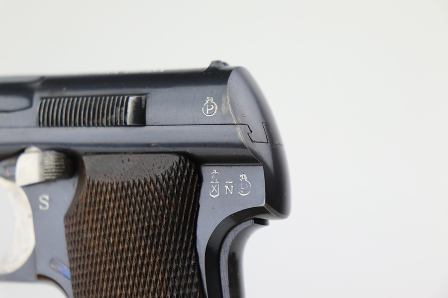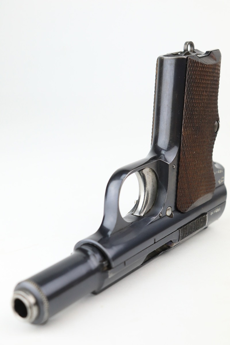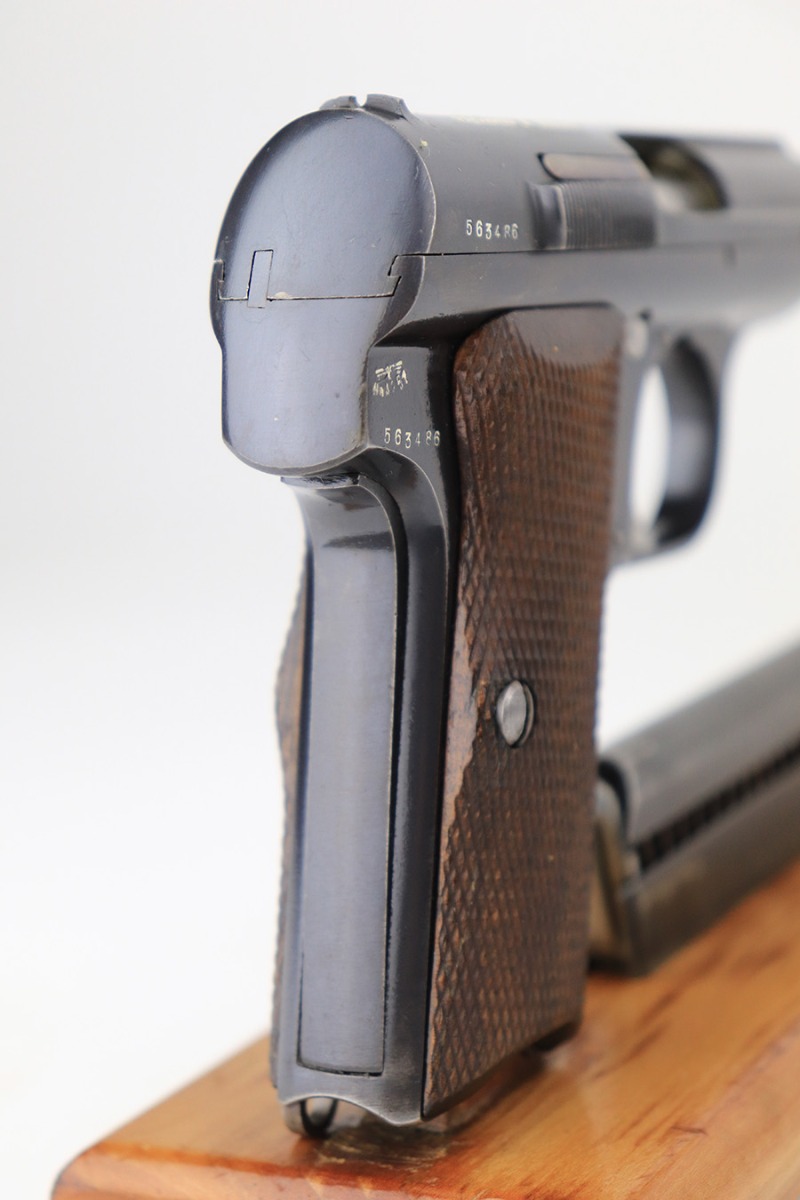 5/16/22 – This is a near-mint example of a Spanish Astra 300 issued to the Nazi military and delivered on February 12th of 1943. The gun is all matching and has the proper “Waffen 251” military acceptance proof on the right side of the frame. It comes as a rig with one proper magazine and a 1943-dated waffen-proofed holster in un-issued condition. The gun has retained nearly all of its original bluing with just very minor thinning on the grip straps and hints of wear on some of the high edges. Mint wood grips. Mint bore.