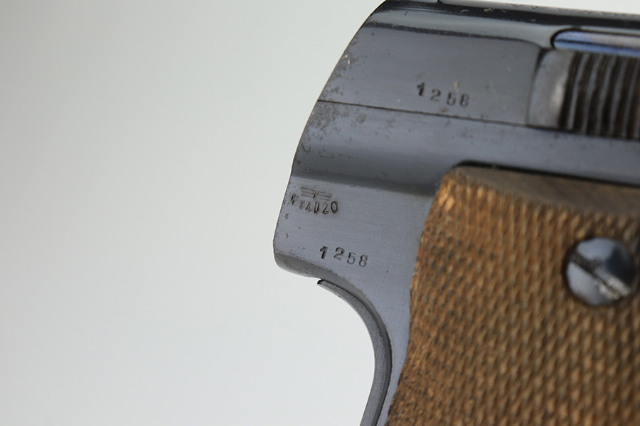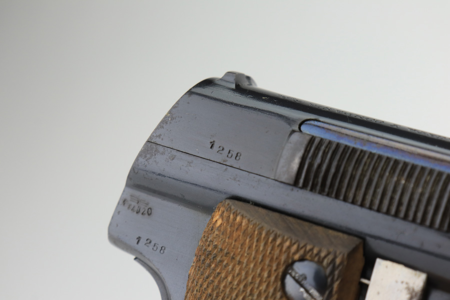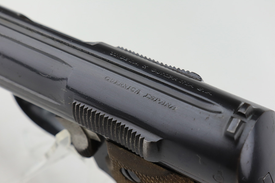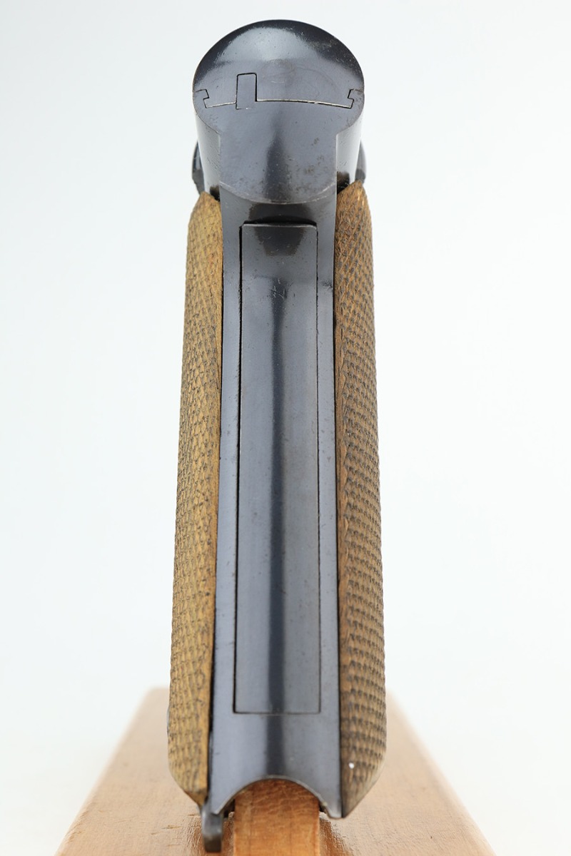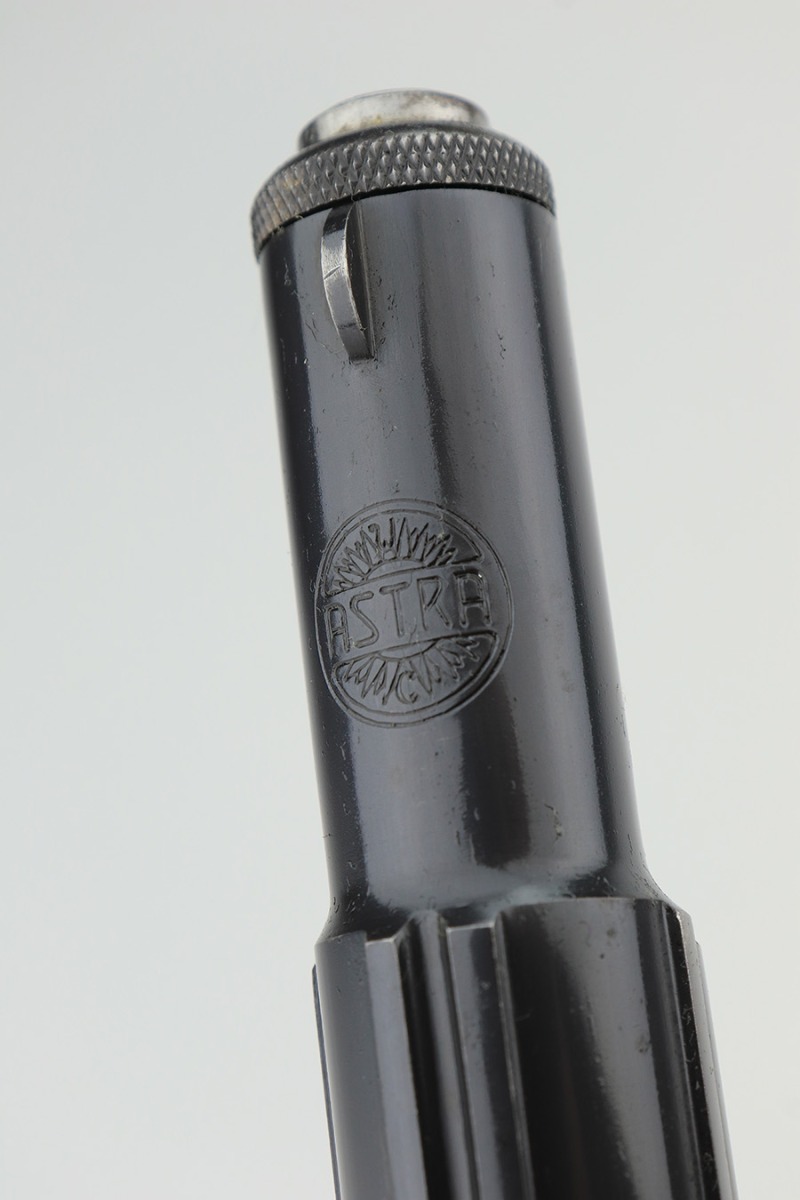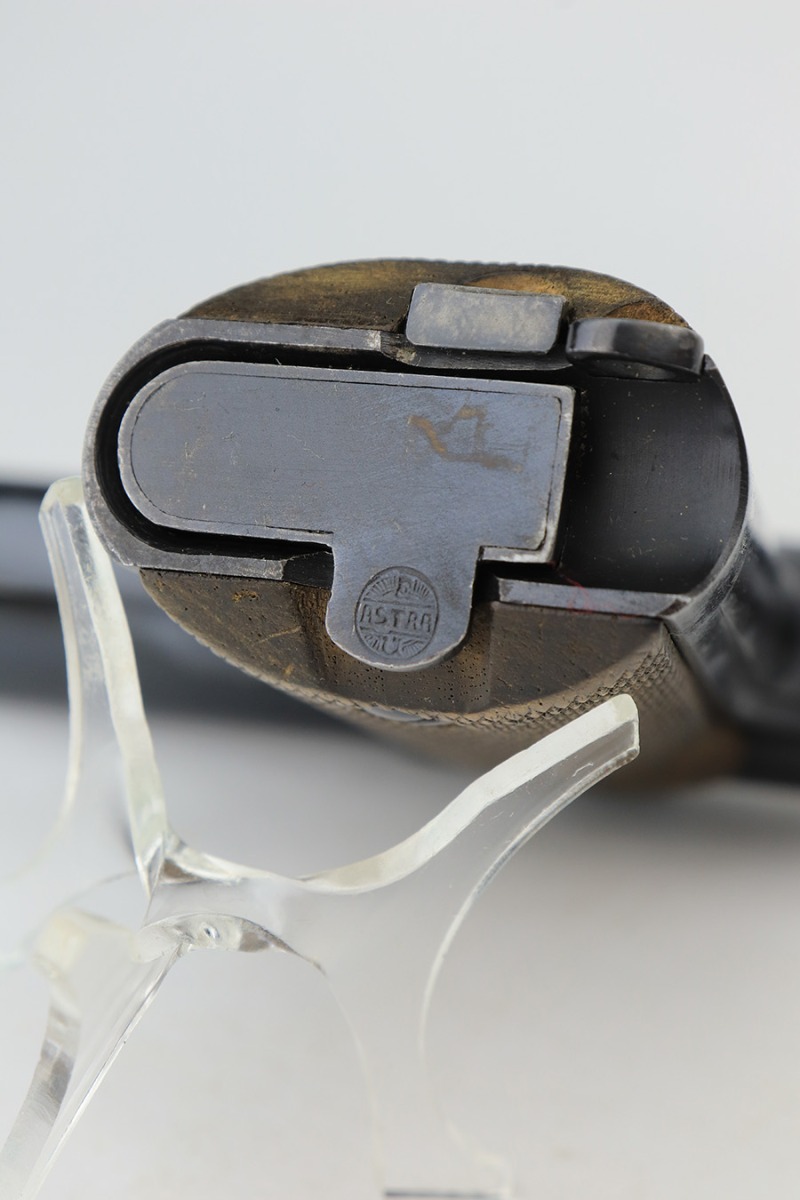 4/5/23 – This is a beautiful, honest example of a scarce Astra 600 that is waffen marked and part of the first Nazi contract for these pistols. This pistol was delivered on May 16th of 1944, which was the first major shipment of Nazi marked Astra 600s. It retains about 98% of the original blue with minor wear at the highest edges and a little oxidation on the rear sides of the pistol. These pistols were delivered to German Army via the Spanish-French border before it was closed by the Allies. Only about 10,000 waffen marked Astra 600s were delivered before this point. Minty bore and excellent wood grips. Correct/original magazine.
