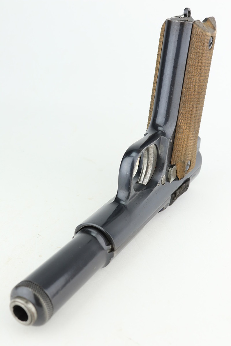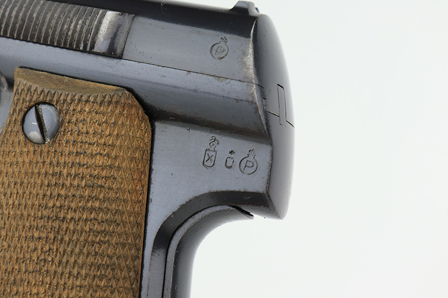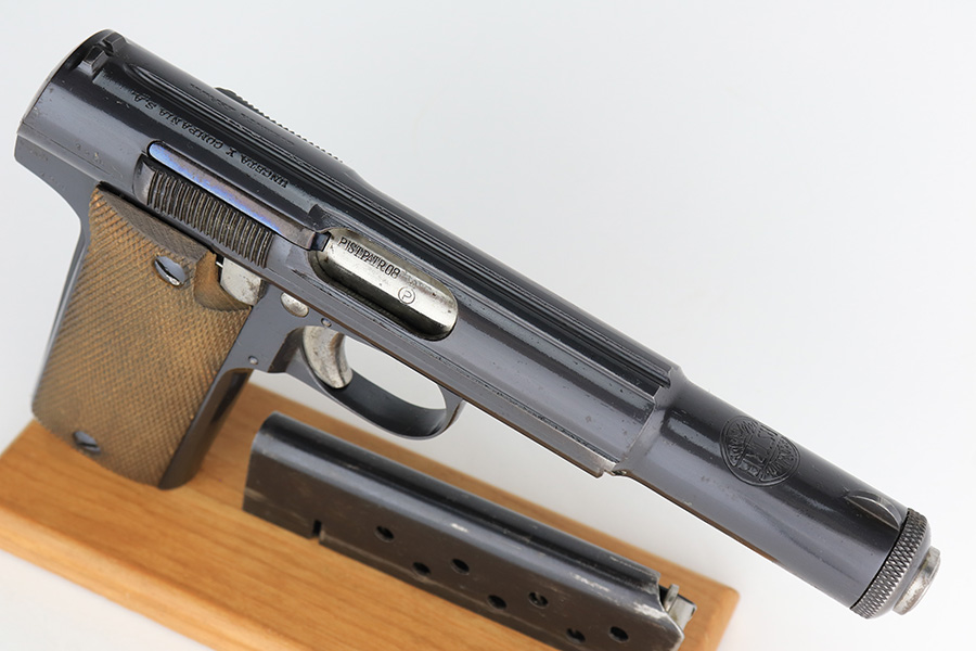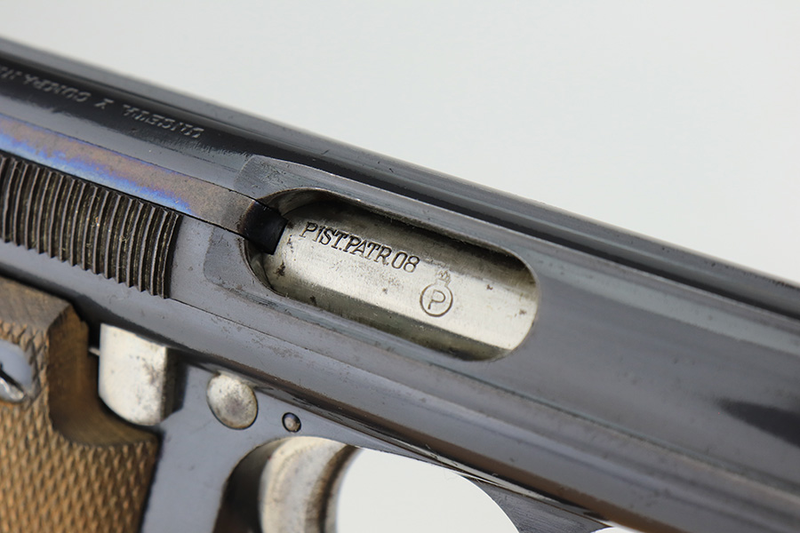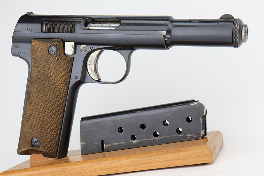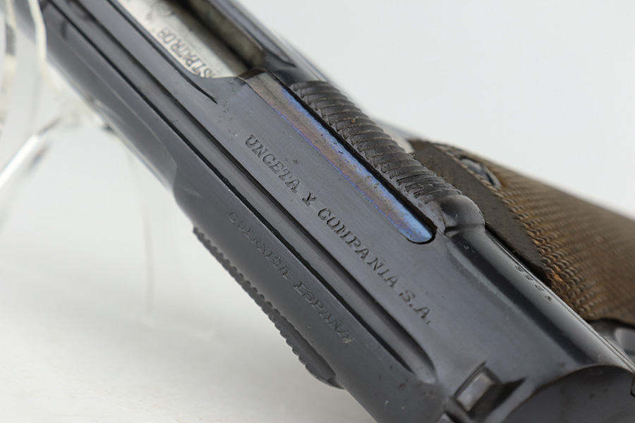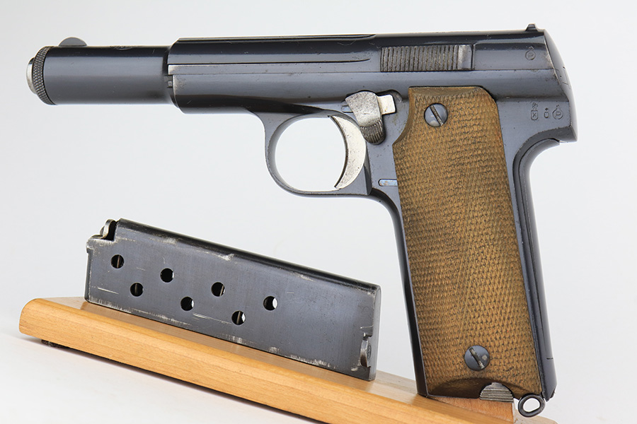 4/5/23 – This is a beautiful, honest example of a scarce Astra 600 that is waffen marked and part of the first Nazi contract for these pistols. This pistol was delivered on May 16th of 1944, which was the first major shipment of Nazi marked Astra 600s. It retains about 98% of the original blue with minor wear at the highest edges and a little oxidation on the rear sides of the pistol. These pistols were delivered to German Army via the Spanish-French border before it was closed by the Allies. Only about 10,000 waffen marked Astra 600s were delivered before this point. Minty bore and excellent wood grips. Correct/original magazine.
