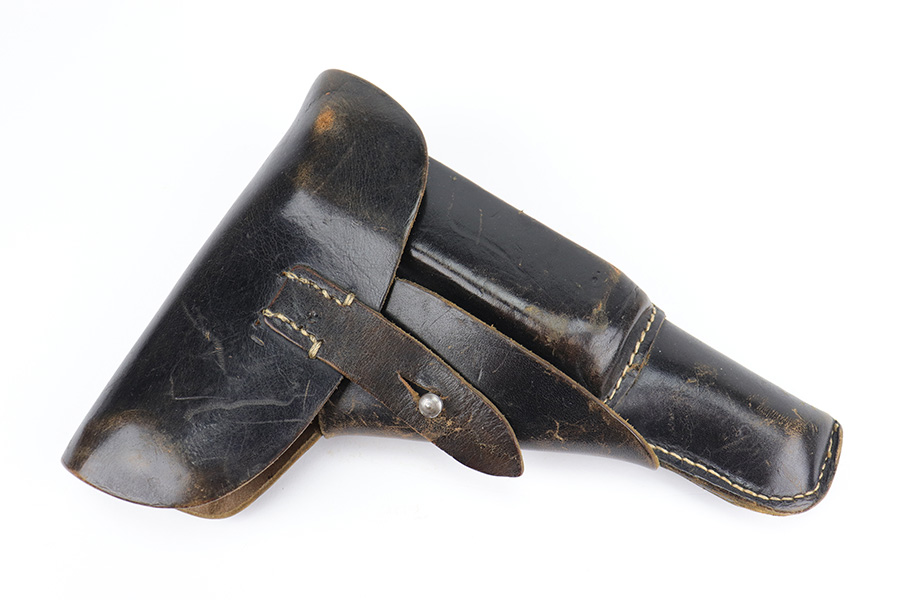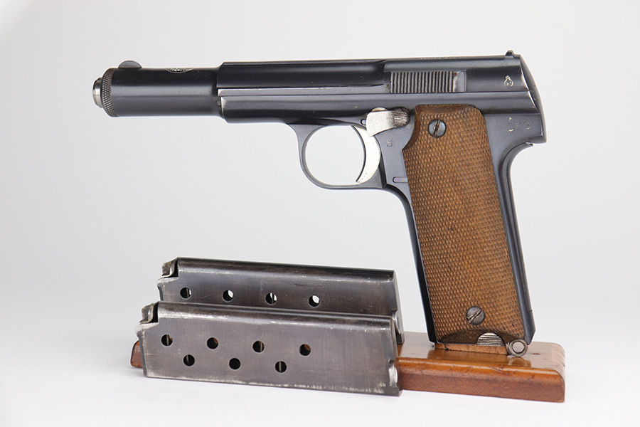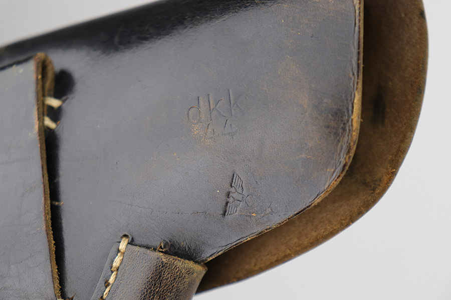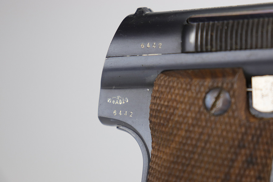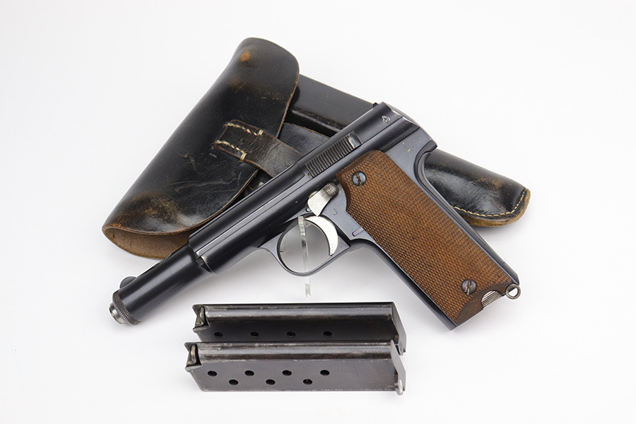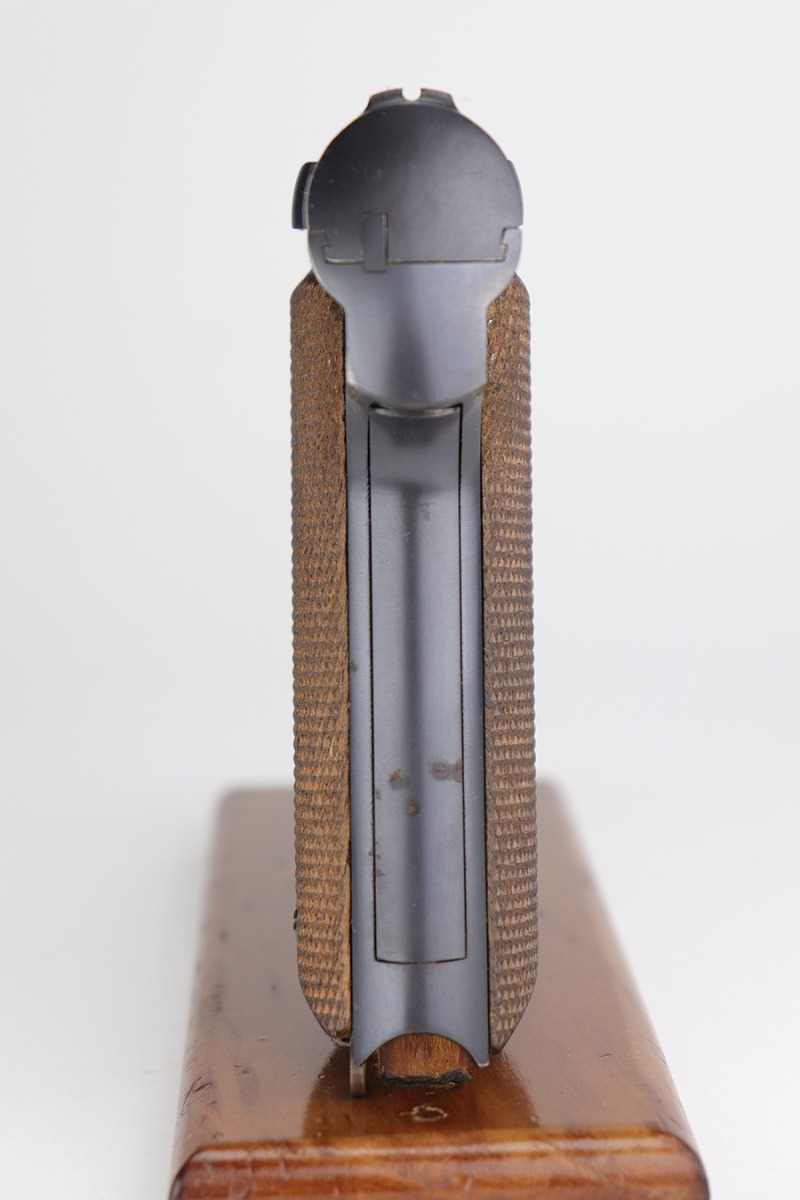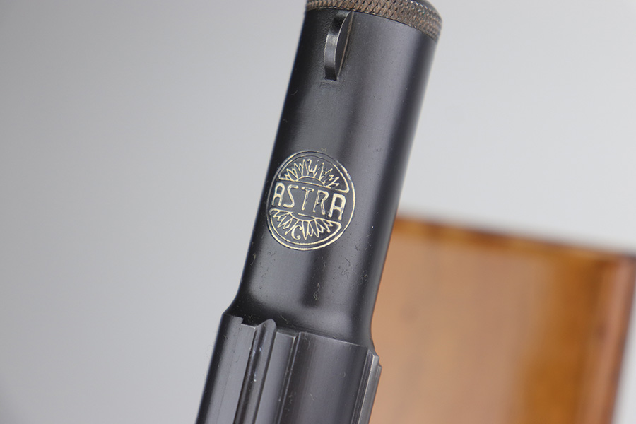 1/11/23 – This is a near-mint example of a Spanish Astra Model 600 issued to the Nazi military in 1944. It is all matching and has the proper “Waffen D20” Nazi military acceptance proof on the right side of the tang. It comes as a complete rig with two period-correct magazines and a nice 1944-dated waffen-proofed black leather holster. The gun itself has retained virtually all of its original finish with just hints of wear on some of the high edges and a couple of tiny dots of oxidation on the back strap. Fitted with a mint set of period-correct wood grips. The bore is near-mint.