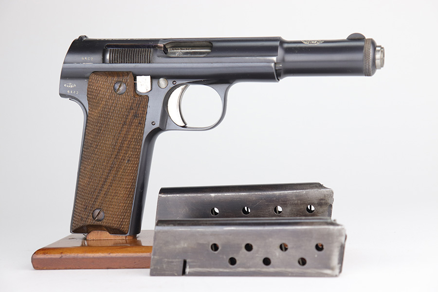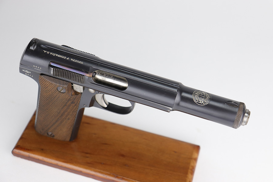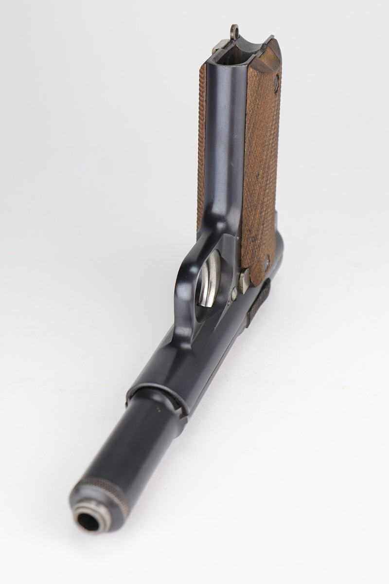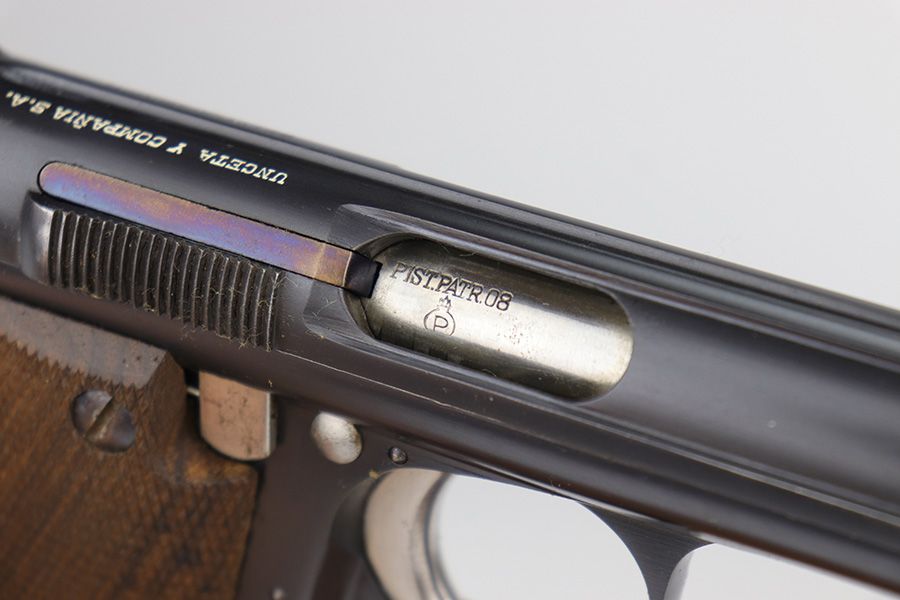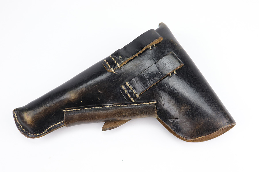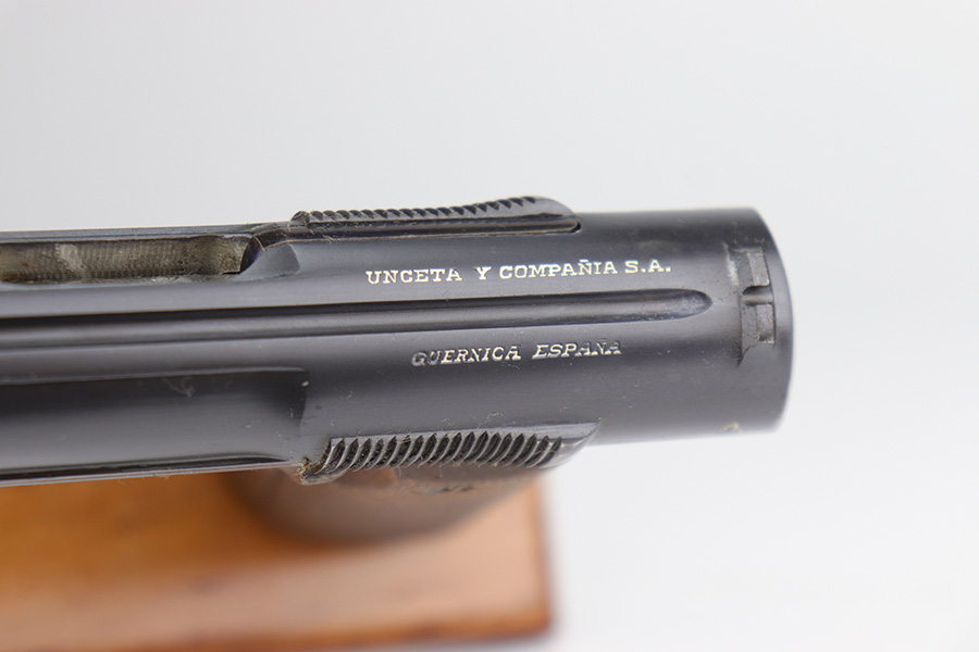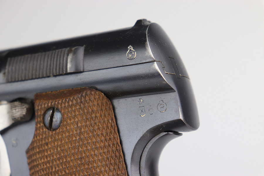 1/11/23 – This is a near-mint example of a Spanish Astra Model 600 issued to the Nazi military in 1944. It is all matching and has the proper “Waffen D20” Nazi military acceptance proof on the right side of the tang. It comes as a complete rig with two period-correct magazines and a nice 1944-dated waffen-proofed black leather holster. The gun itself has retained virtually all of its original finish with just hints of wear on some of the high edges and a couple of tiny dots of oxidation on the back strap. Fitted with a mint set of period-correct wood grips. The bore is near-mint.