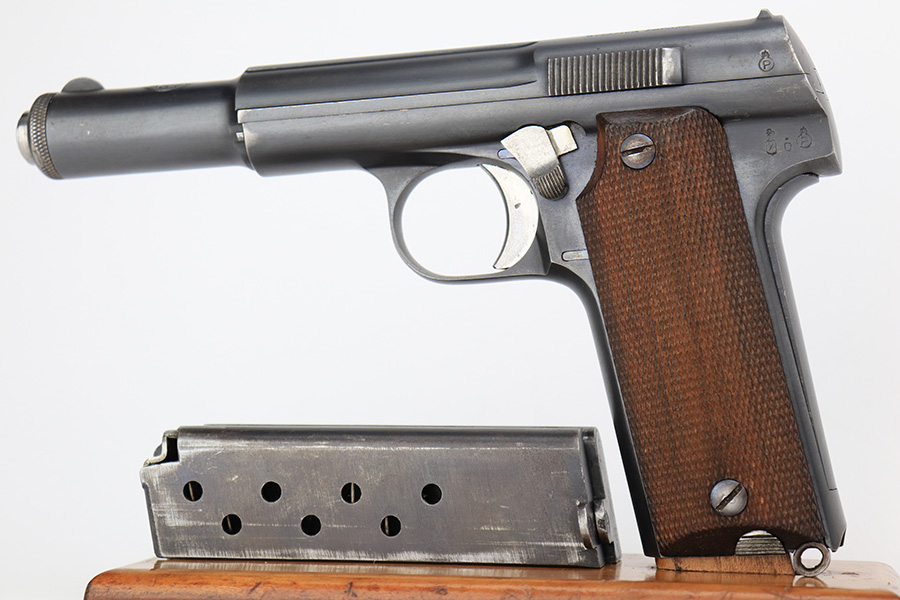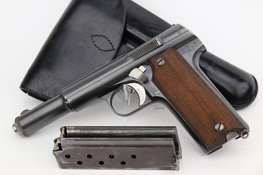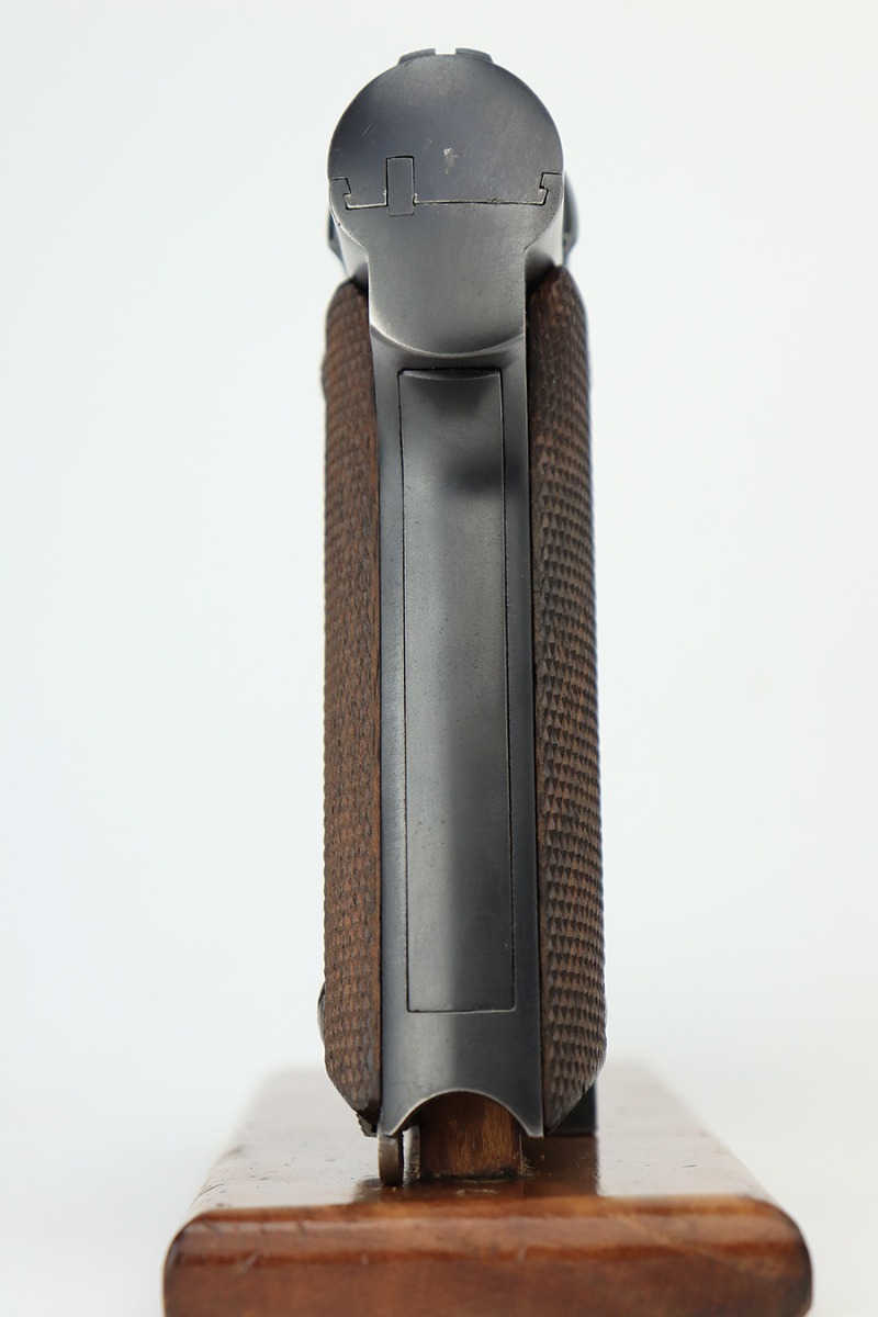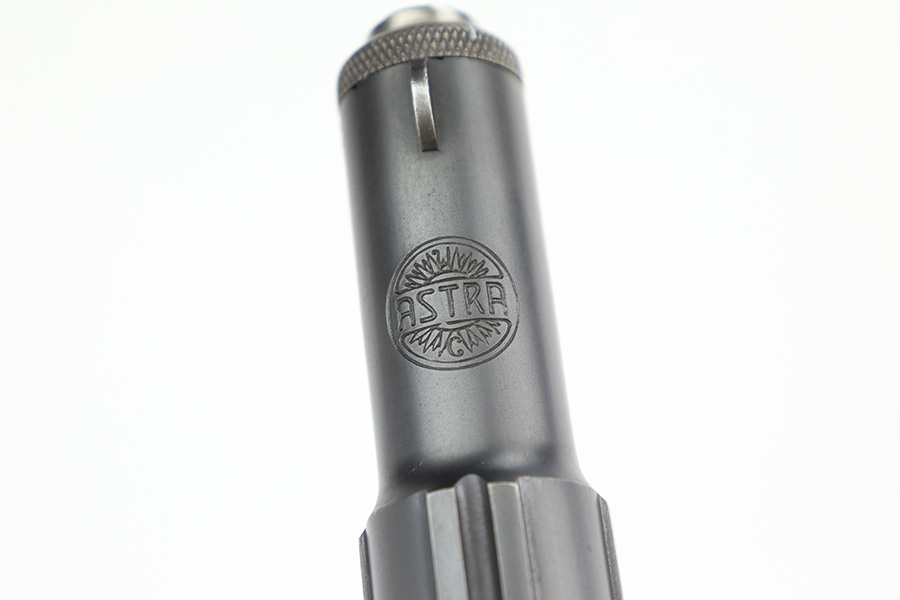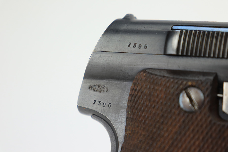5/12/23 – This is a near-mint example of an Astra 600 delivered to the Nazi military on June 23, 1944. All matching with the proper “Waffen D20” military acceptance proof on the tang. It comes as a rig with two period-correct magazines and an excellent black leather holster. The gun itself has retained nearly all of its original finish with just hints of wear on some of the high edges and a few tiny handling marks here and there. Fitted with minty wood grips. The bore has strong rifling, but there is some very light pin-pricking here and there.
