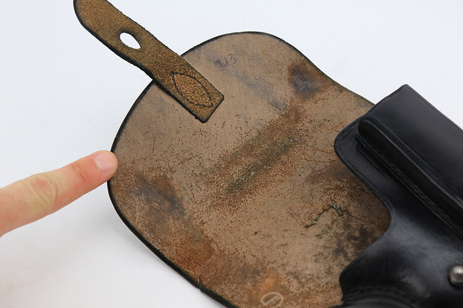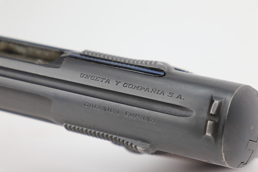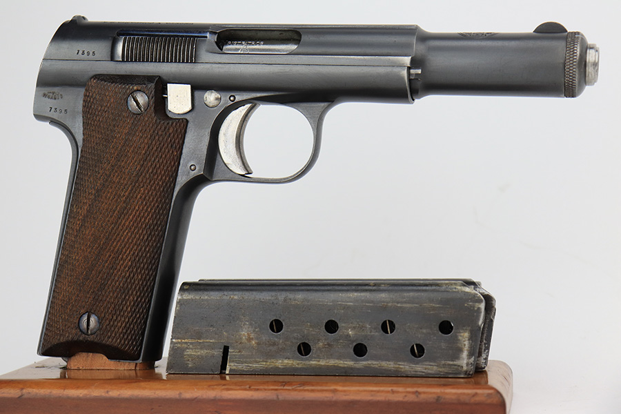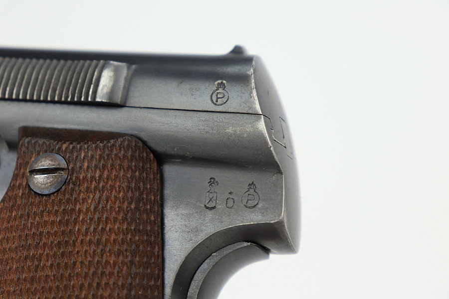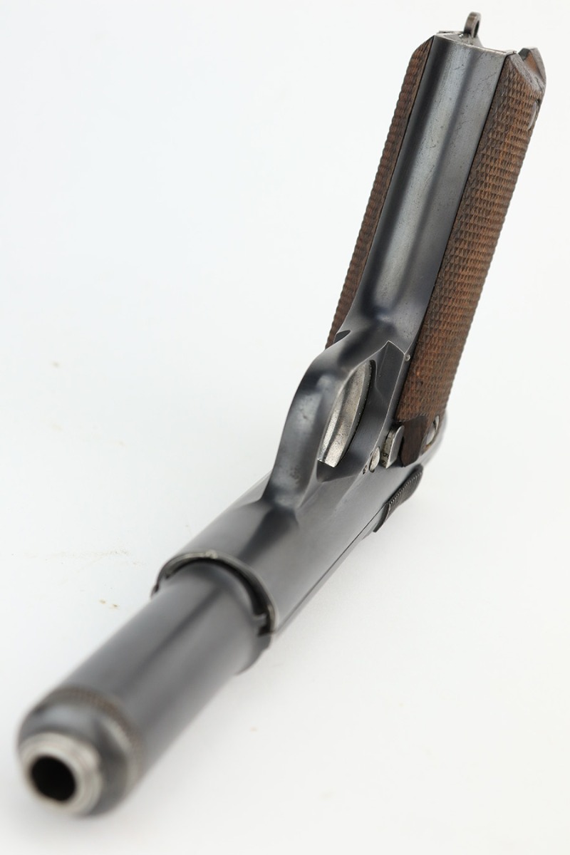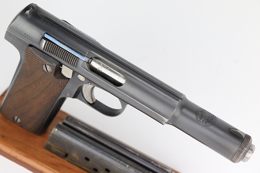 5/12/23 – This is a near-mint example of an Astra 600 delivered to the Nazi military on June 23, 1944. All matching with the proper “Waffen D20” military acceptance proof on the tang. It comes as a rig with two period-correct magazines and an excellent black leather holster. The gun itself has retained nearly all of its original finish with just hints of wear on some of the high edges and a few tiny handling marks here and there. Fitted with minty wood grips. The bore has strong rifling, but there is some very light pin-pricking here and there.