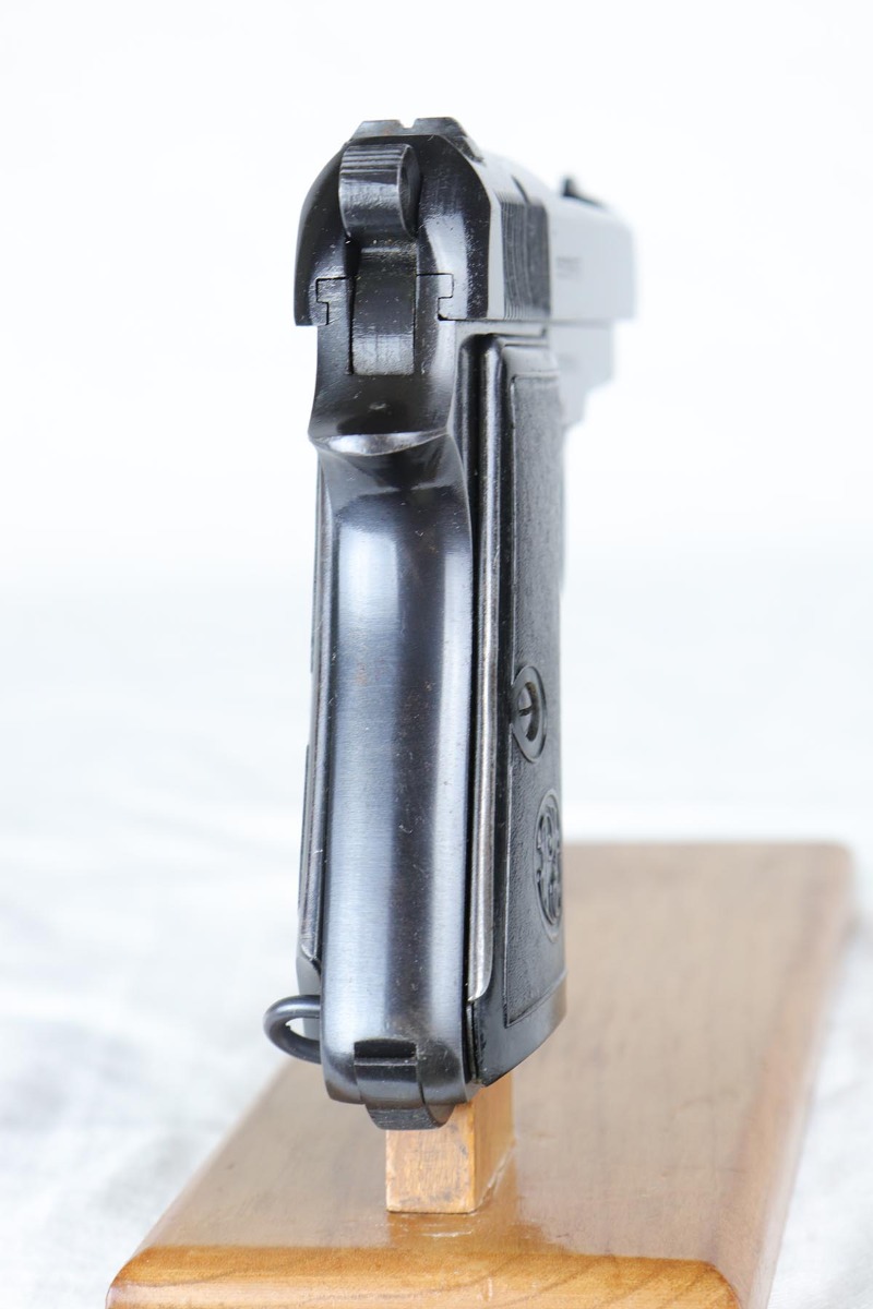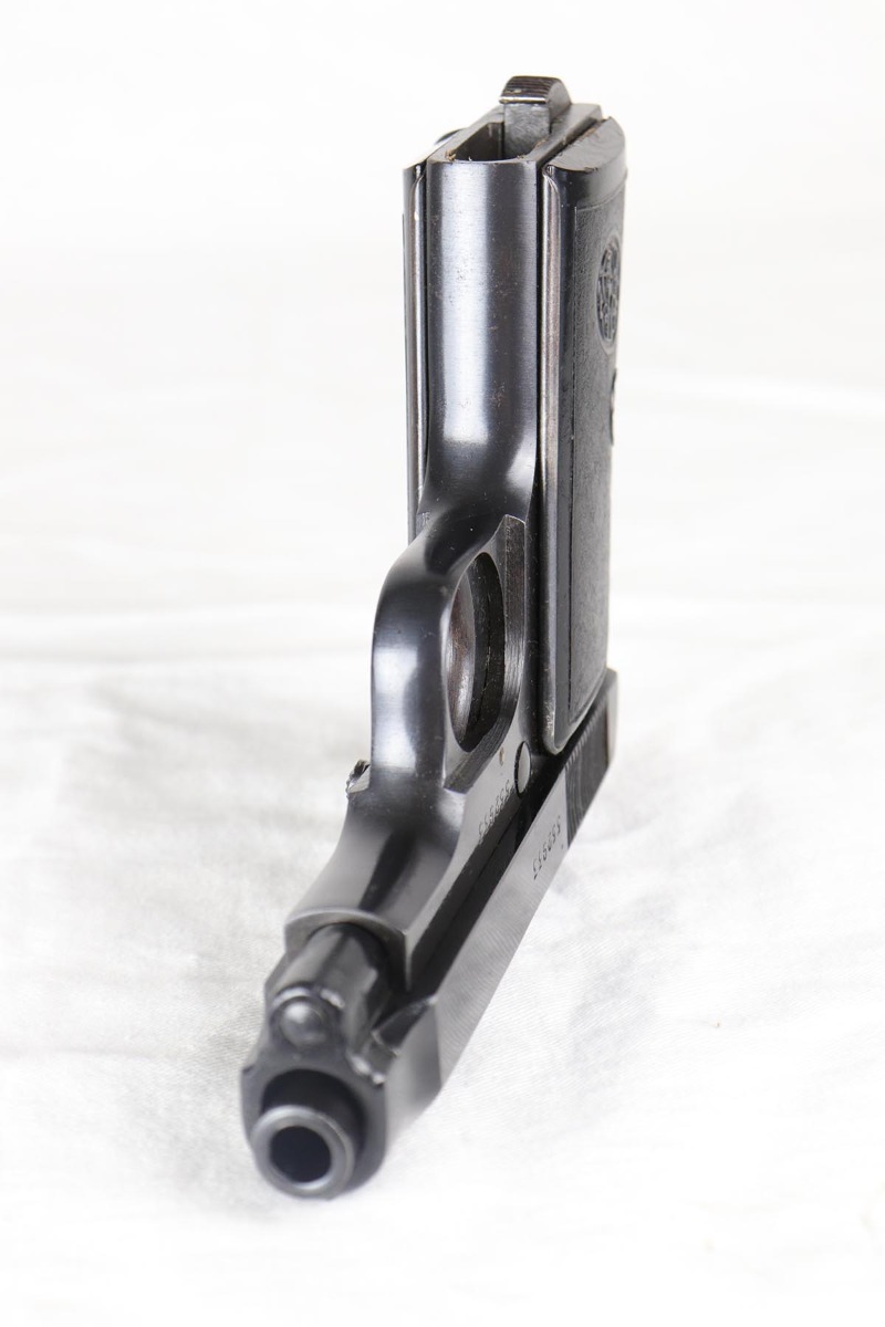 3/23/18 – This is the nicest late-war Model 1935 Beretta I have ever seen – worthy of my own collection, but I can’t keep all the good stuff for myself.   It is dated 1944 and 4UT marked which was a Nazi inspector proof.   The high-polish finish makes it quite rare.  The Italians maintained the high polish finish but when the Nazis took over after the fall of Mussolini, the Germans degraded the finish to a cheaper military dull blue.   So this one had to be in the factory completed – all but the final inspection proof when the Nazis took over.   A very rare and beautiful Nazi pistol.  Excellent bore and magazine. Seemingly never issued or used.