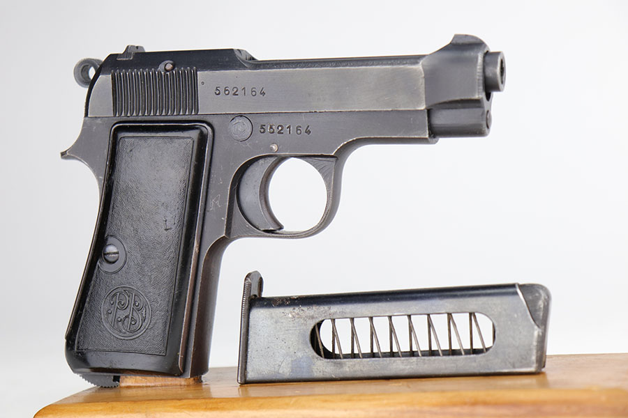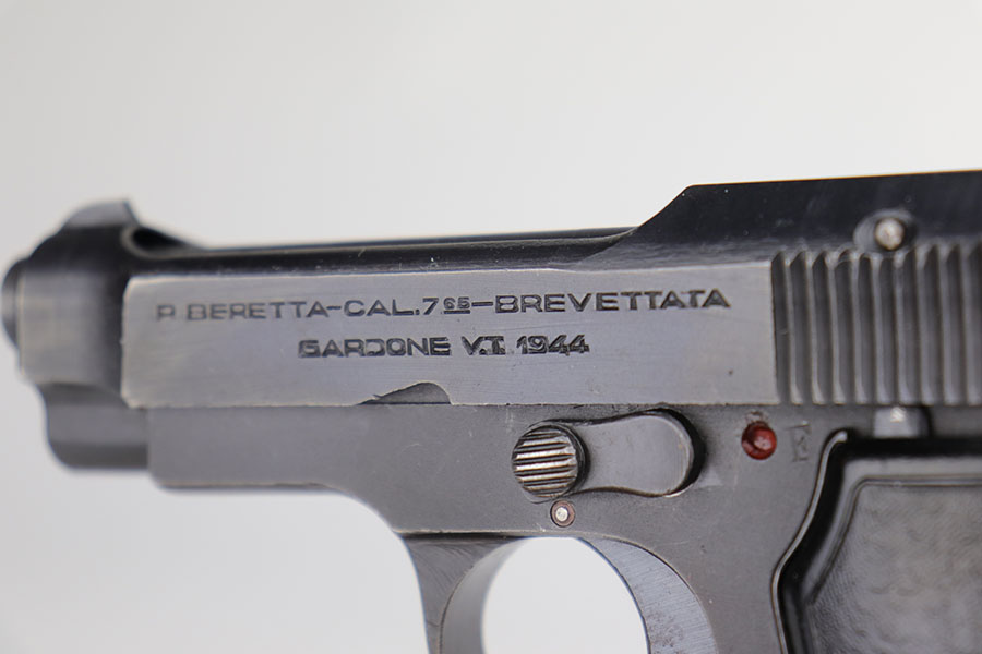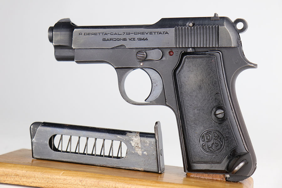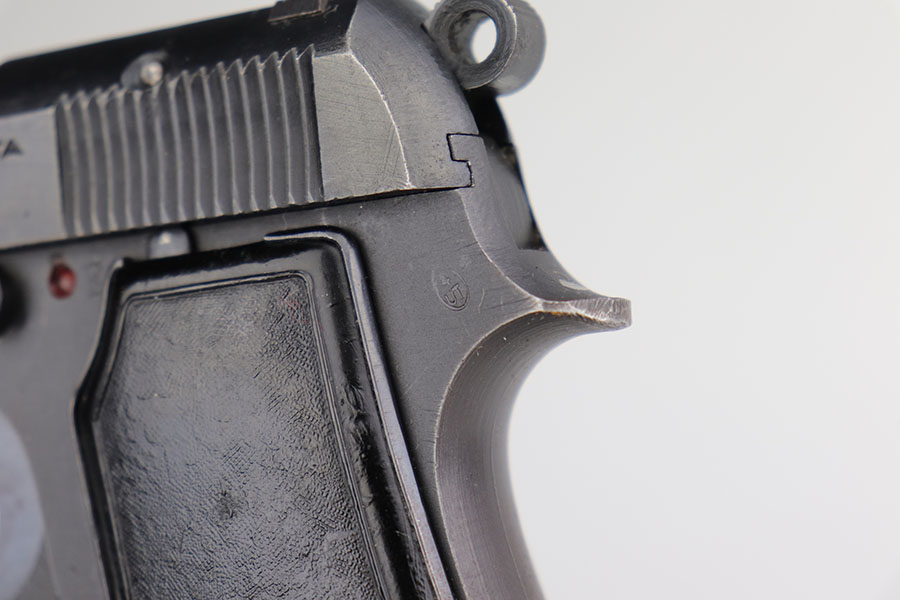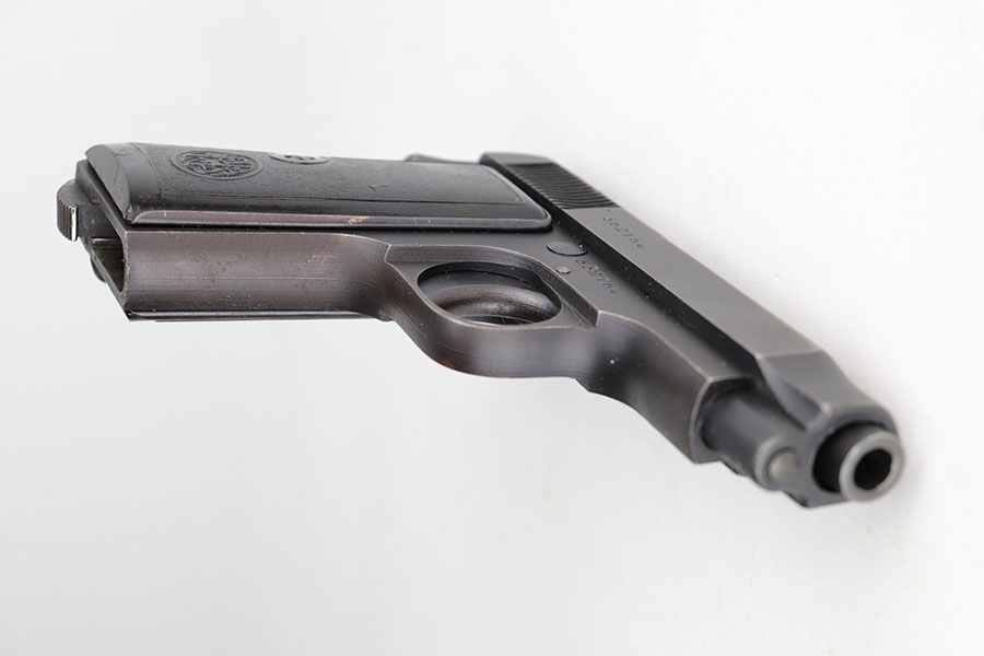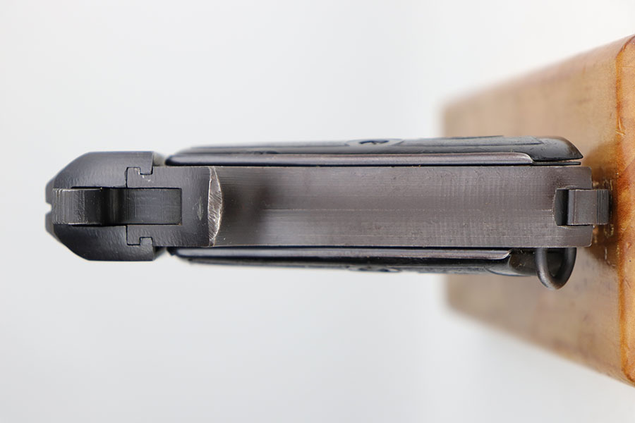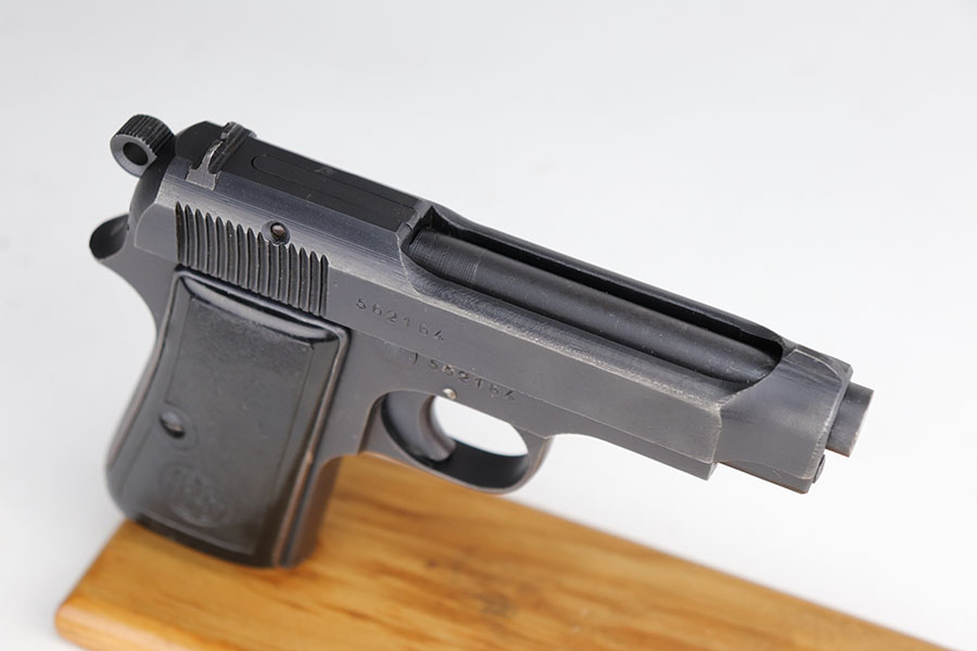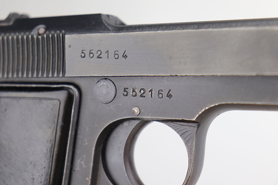 12/9/20 – This is a minty, original Beretta Model 1935 from 1944 with 4UT marking on frame. Jan Still’s book on the axis pistols notes that a Beretta factory letter indicates the ‘4UT’ marking found on the frame of this pistol as having been a “German acceptance quality control” and being part of a lot that was delivered to the German Army headquarters in Italy. This one is all matching and has just a hint of high edge wear. Bore is shiny with strong rifling and the grips are in great shape. Original magazine with flat bottom.