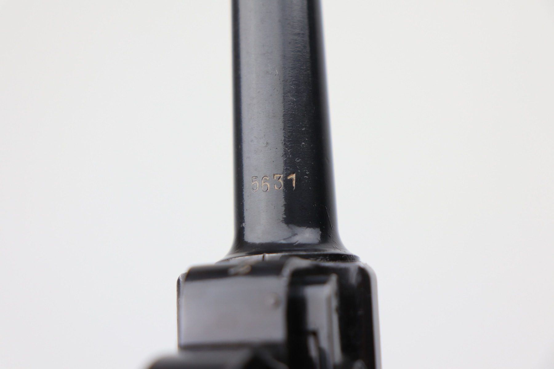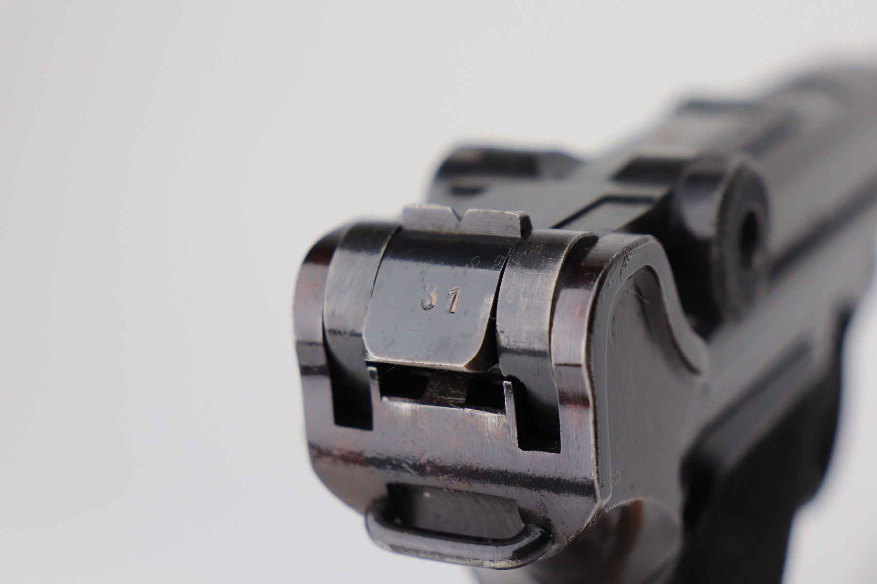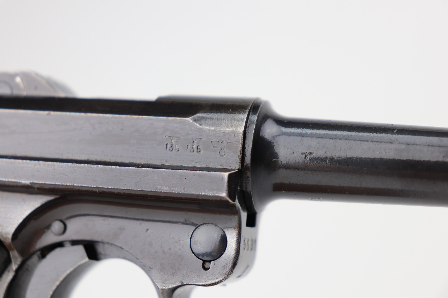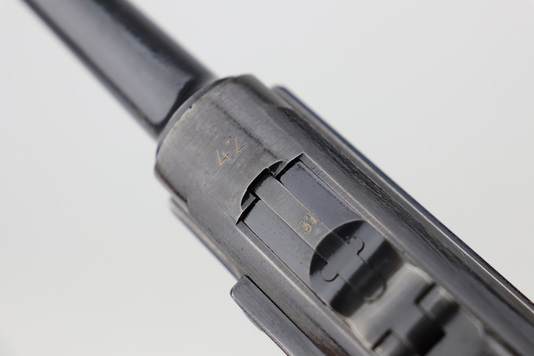 3/15/21 – This is a minty example of a Black Widow Mauser Luger Rig issued to the Nazi military in 1942. It is all matching and has the proper “Eagle 135” military proofs. The rig comes with a minty 1941-dated holster, an unmarked luger tool, and two black widow magazines. The gun has retained about 97-98% of its original bluing. There is just a hint of wear on some of the high edges and muzzle and minor thinning on the chamber. There are a few micro scratches just below the trigger guard. Comes with excellent grips. The bore is shiny with strong rifling and minor freckling throughout. It looks like someone scratched out the original waffen proof on the back of the holster.