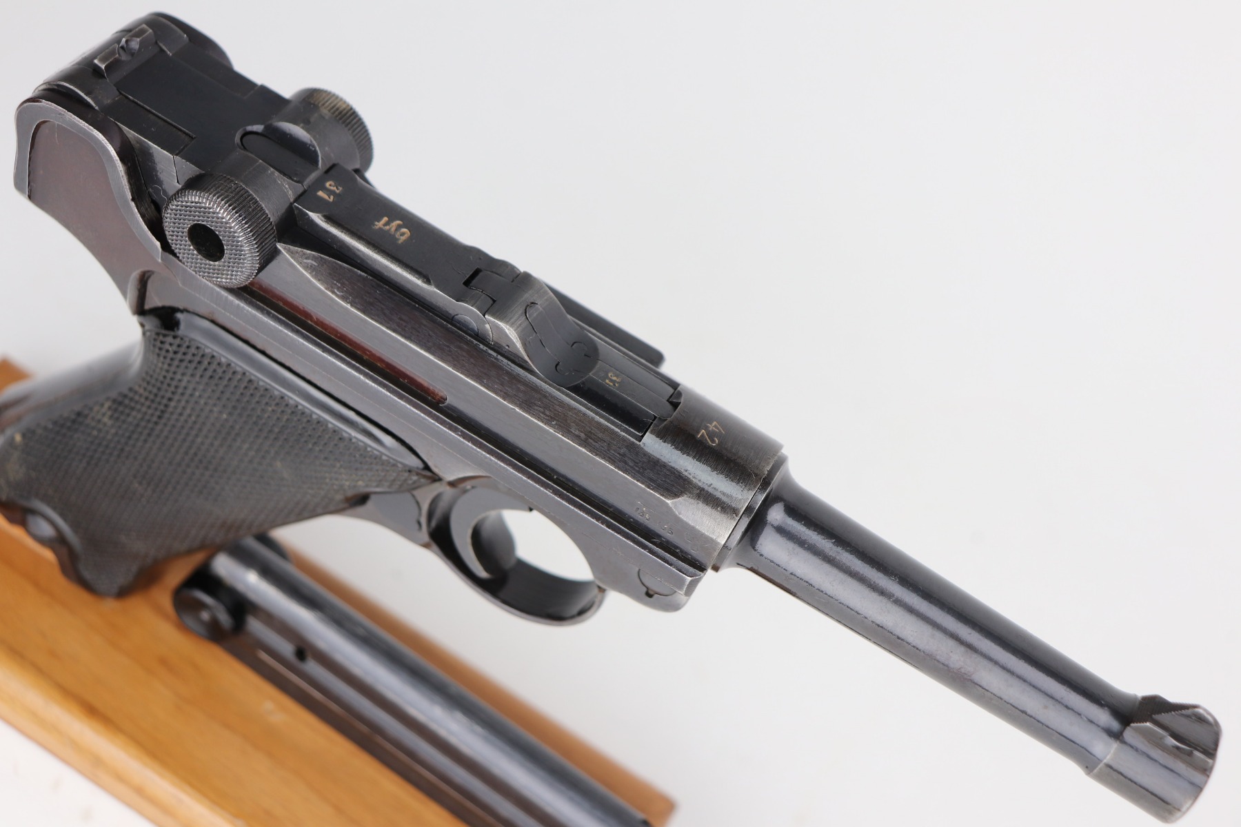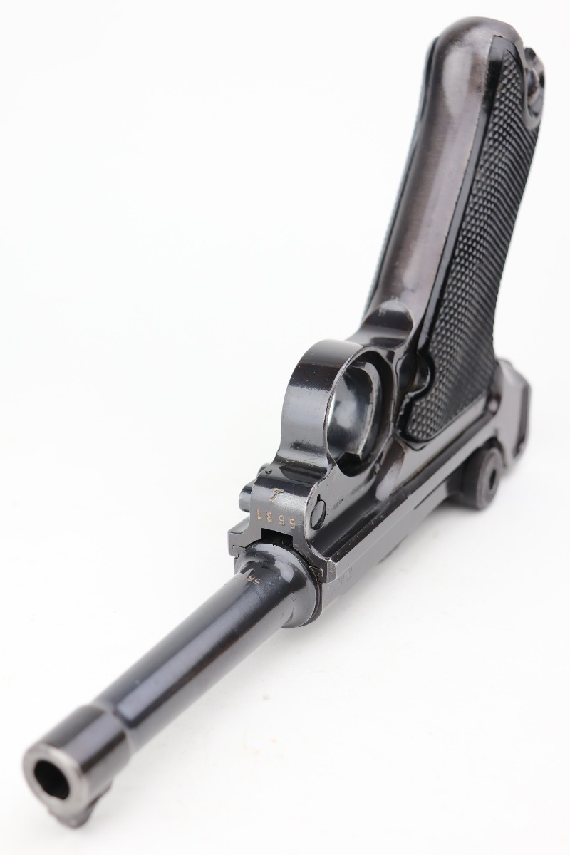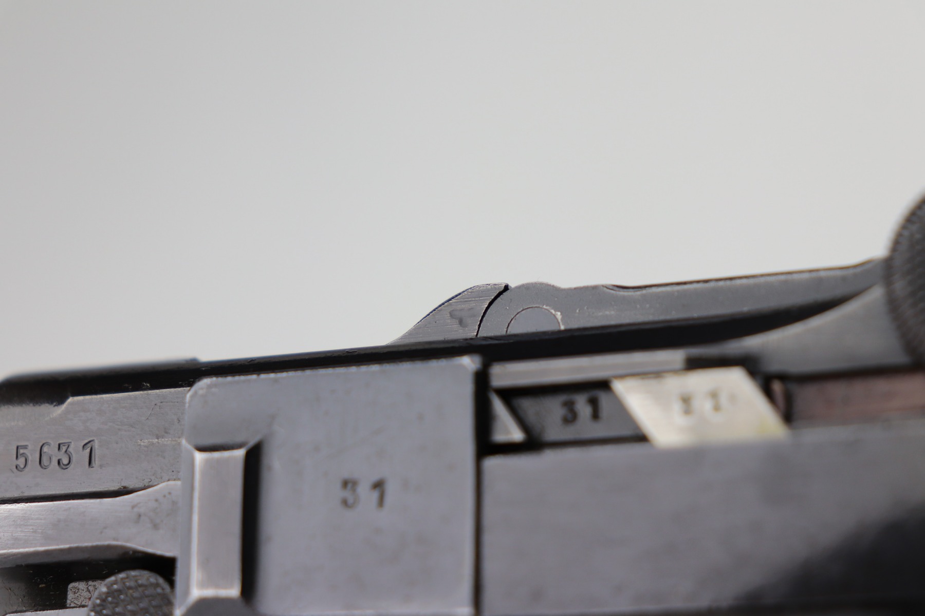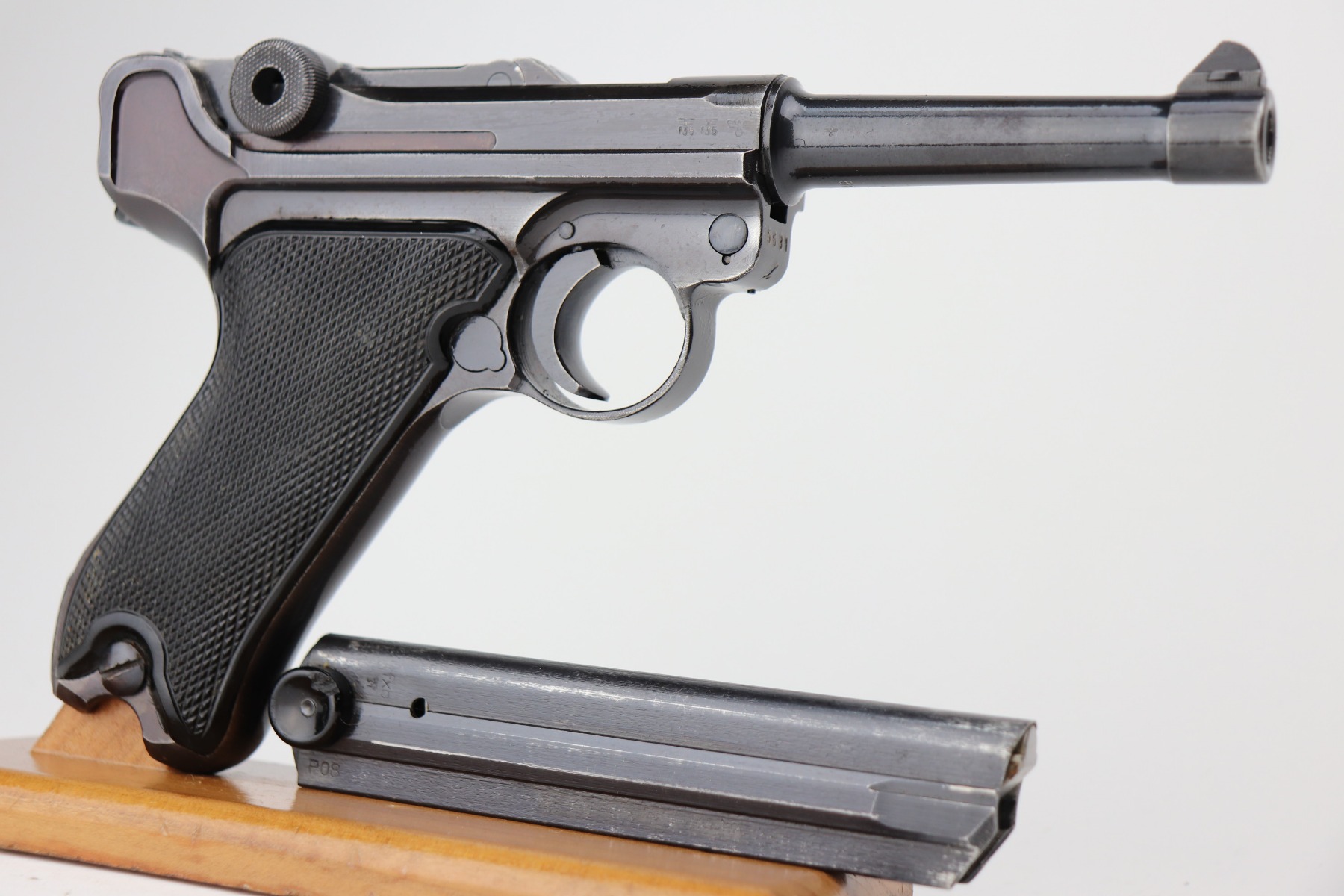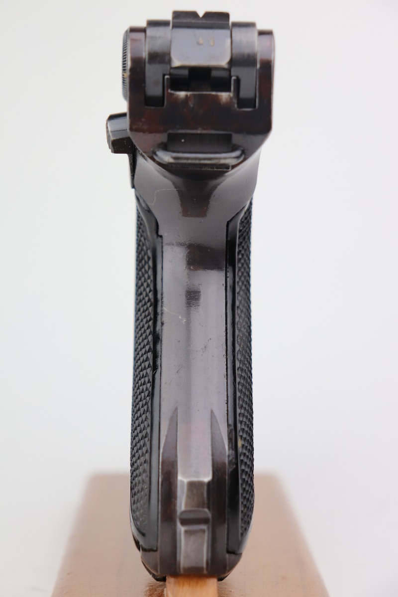 3/15/21 – This is a minty example of a Black Widow Mauser Luger Rig issued to the Nazi military in 1942. It is all matching and has the proper “Eagle 135” military proofs. The rig comes with a minty 1941-dated holster, an unmarked luger tool, and two black widow magazines. The gun has retained about 97-98% of its original bluing. There is just a hint of wear on some of the high edges and muzzle and minor thinning on the chamber. There are a few micro scratches just below the trigger guard. Comes with excellent grips. The bore is shiny with strong rifling and minor freckling throughout. It looks like someone scratched out the original waffen proof on the back of the holster.