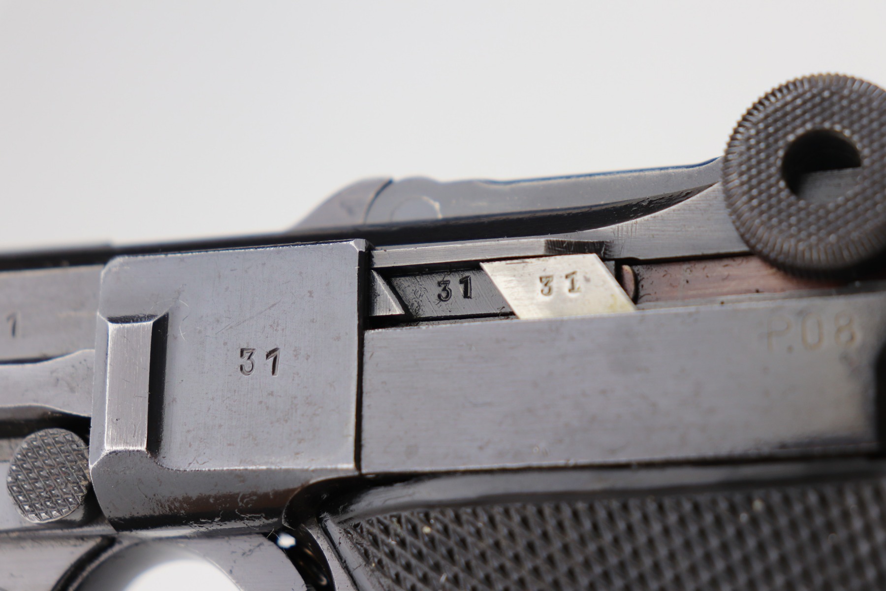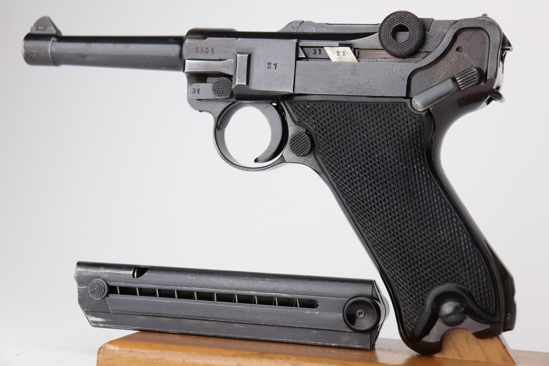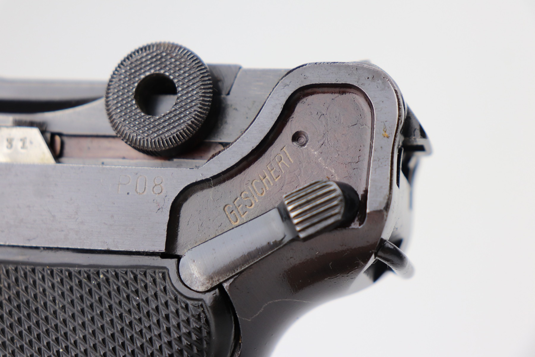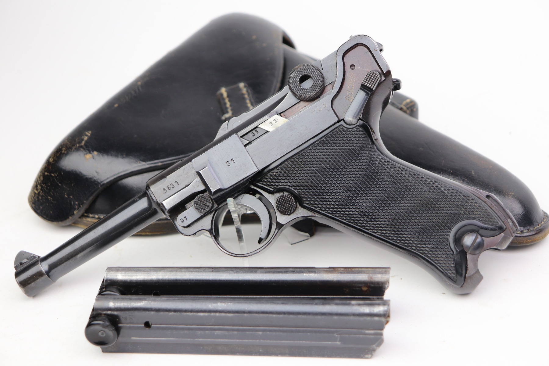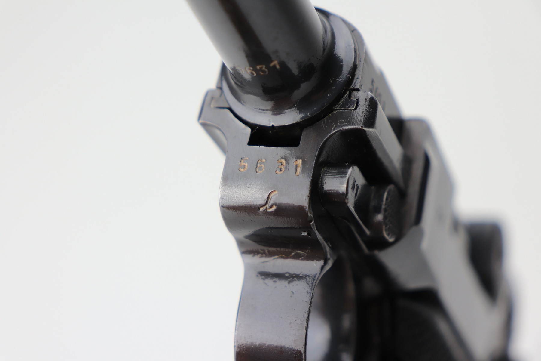 3/15/21 – This is a minty example of a Black Widow Mauser Luger Rig issued to the Nazi military in 1942. It is all matching and has the proper “Eagle 135” military proofs. The rig comes with a minty 1941-dated holster, an unmarked luger tool, and two black widow magazines. The gun has retained about 97-98% of its original bluing. There is just a hint of wear on some of the high edges and muzzle and minor thinning on the chamber. There are a few micro scratches just below the trigger guard. Comes with excellent grips. The bore is shiny with strong rifling and minor freckling throughout. It looks like someone scratched out the original waffen proof on the back of the holster.
