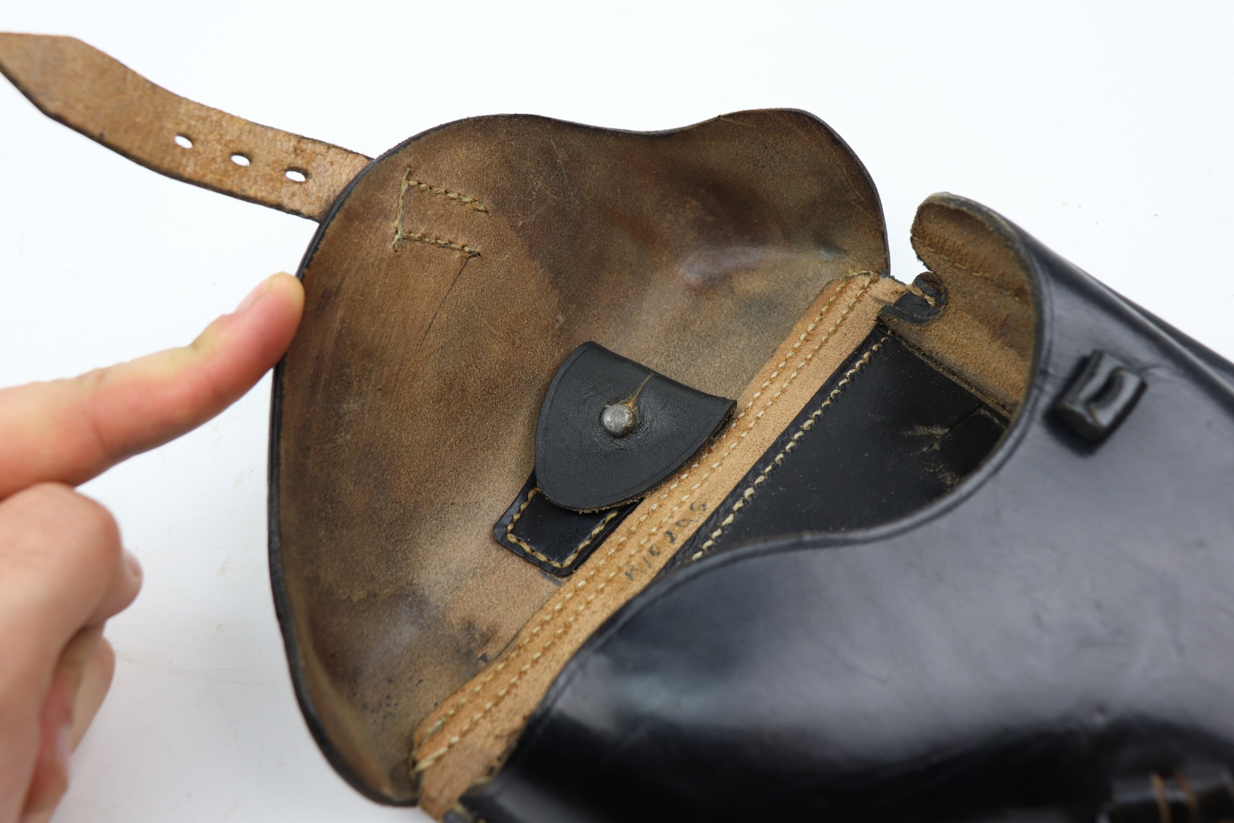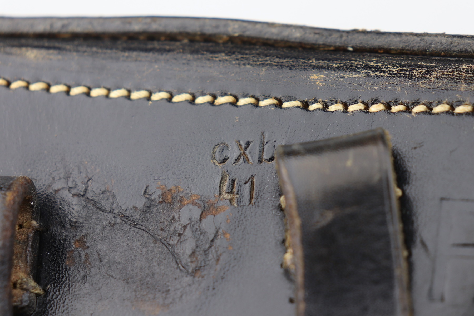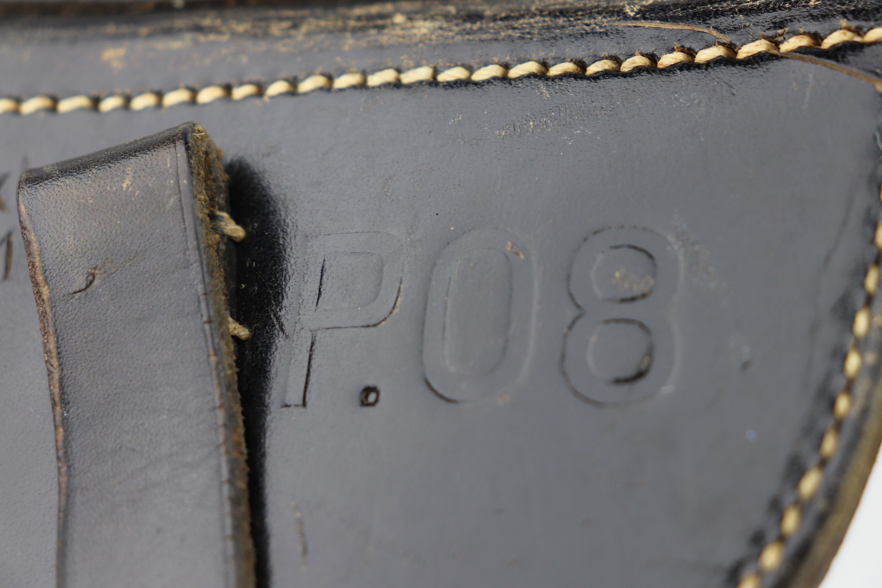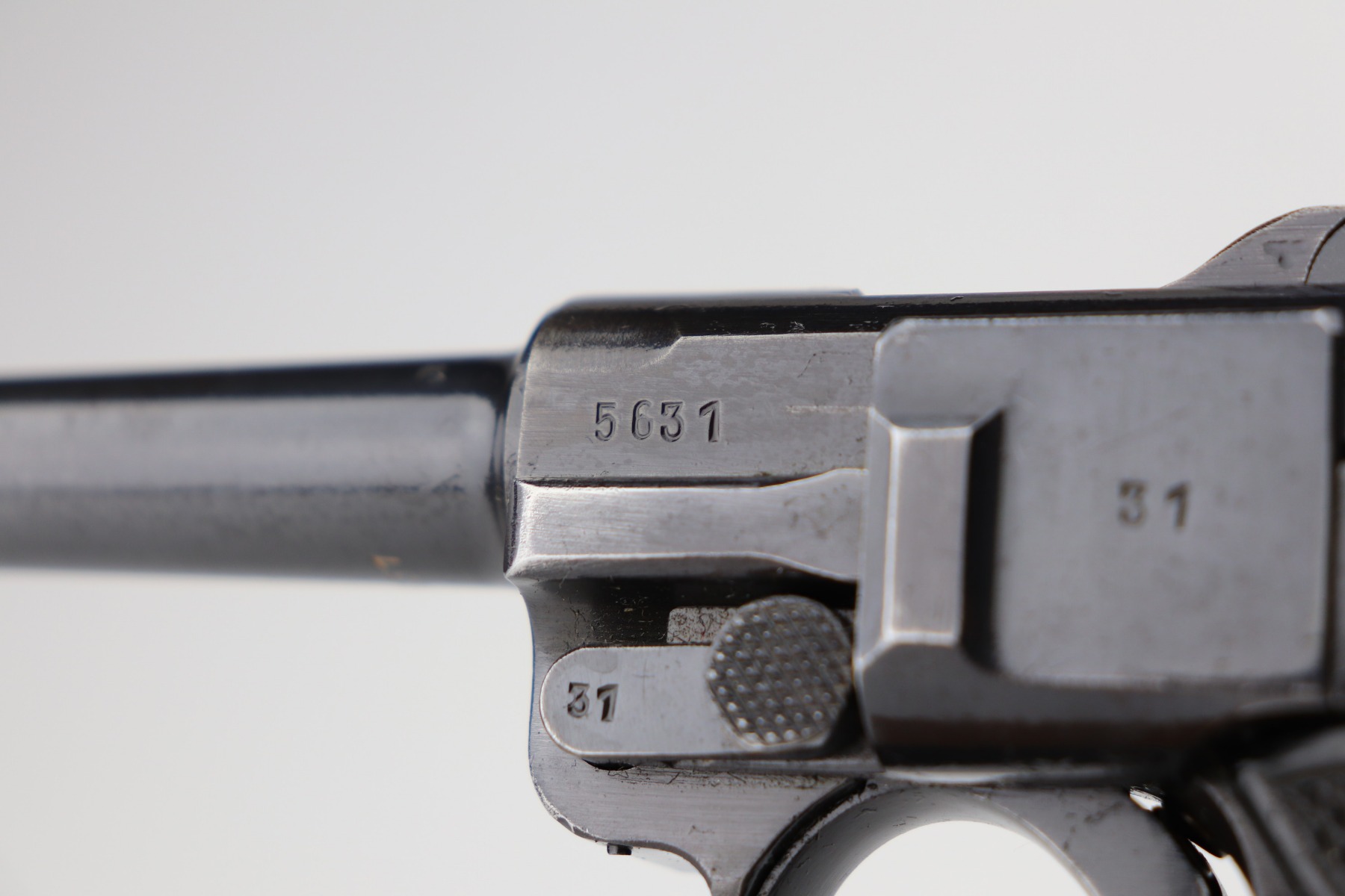 3/15/21 – This is a minty example of a Black Widow Mauser Luger Rig issued to the Nazi military in 1942. It is all matching and has the proper “Eagle 135” military proofs. The rig comes with a minty 1941-dated holster, an unmarked luger tool, and two black widow magazines. The gun has retained about 97-98% of its original bluing. There is just a hint of wear on some of the high edges and muzzle and minor thinning on the chamber. There are a few micro scratches just below the trigger guard. Comes with excellent grips. The bore is shiny with strong rifling and minor freckling throughout. It looks like someone scratched out the original waffen proof on the back of the holster.
