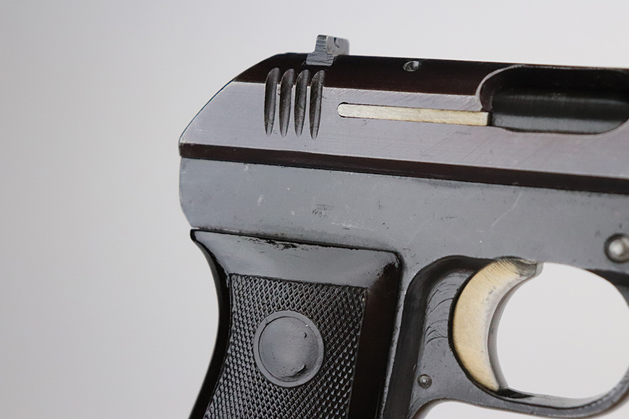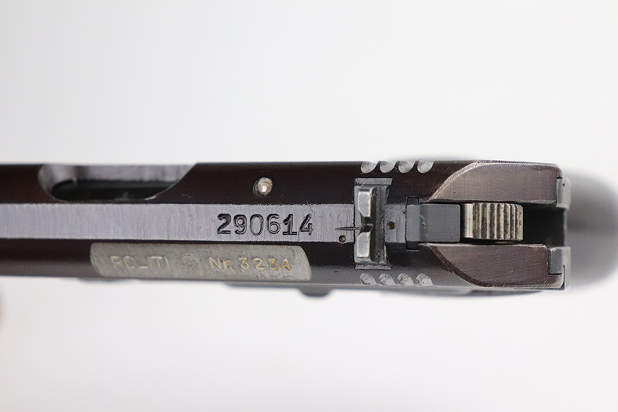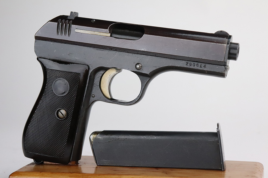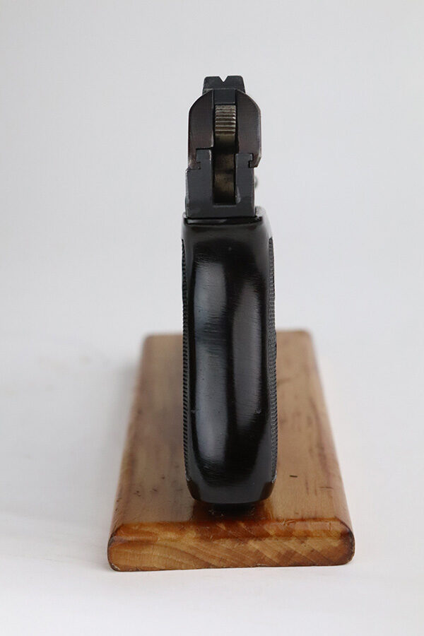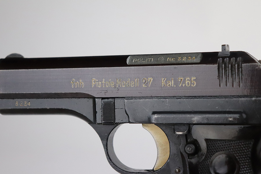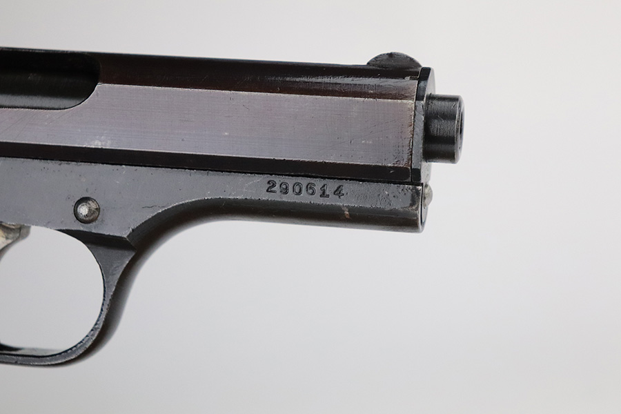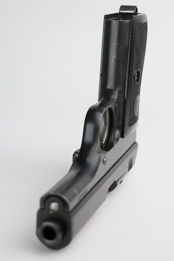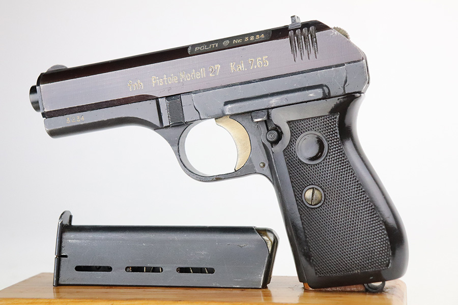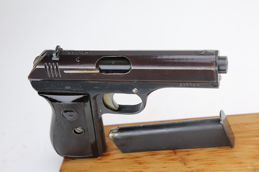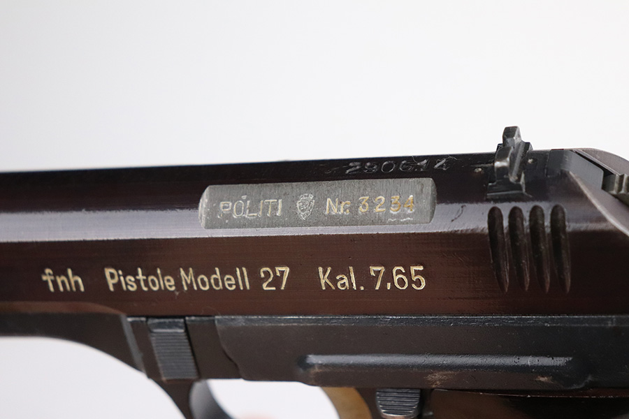 7/15/21 – This is a minty example of a CZ 27 issued to the Nazi military during WW2. It is matching and has the proper “Waffen 76” military proof. The left side of the slide is milled and has a “Politi Nr 3234” marking, indicating this gun was diverted to the Norwegian police after WW2. It has retained about 98% of its finish. There are hints of wear on the high edges and around the muzzle. A few small dots of wear and handling marks on the front strap. There are some light scratches on the slide just below the ejection port. Comes with an excellent grip (no chips or cracks) and a WW2-era magazine. Mint bore.