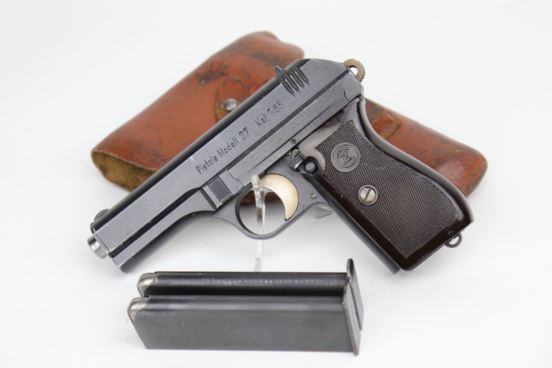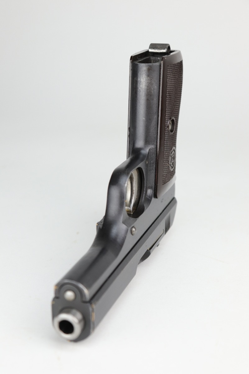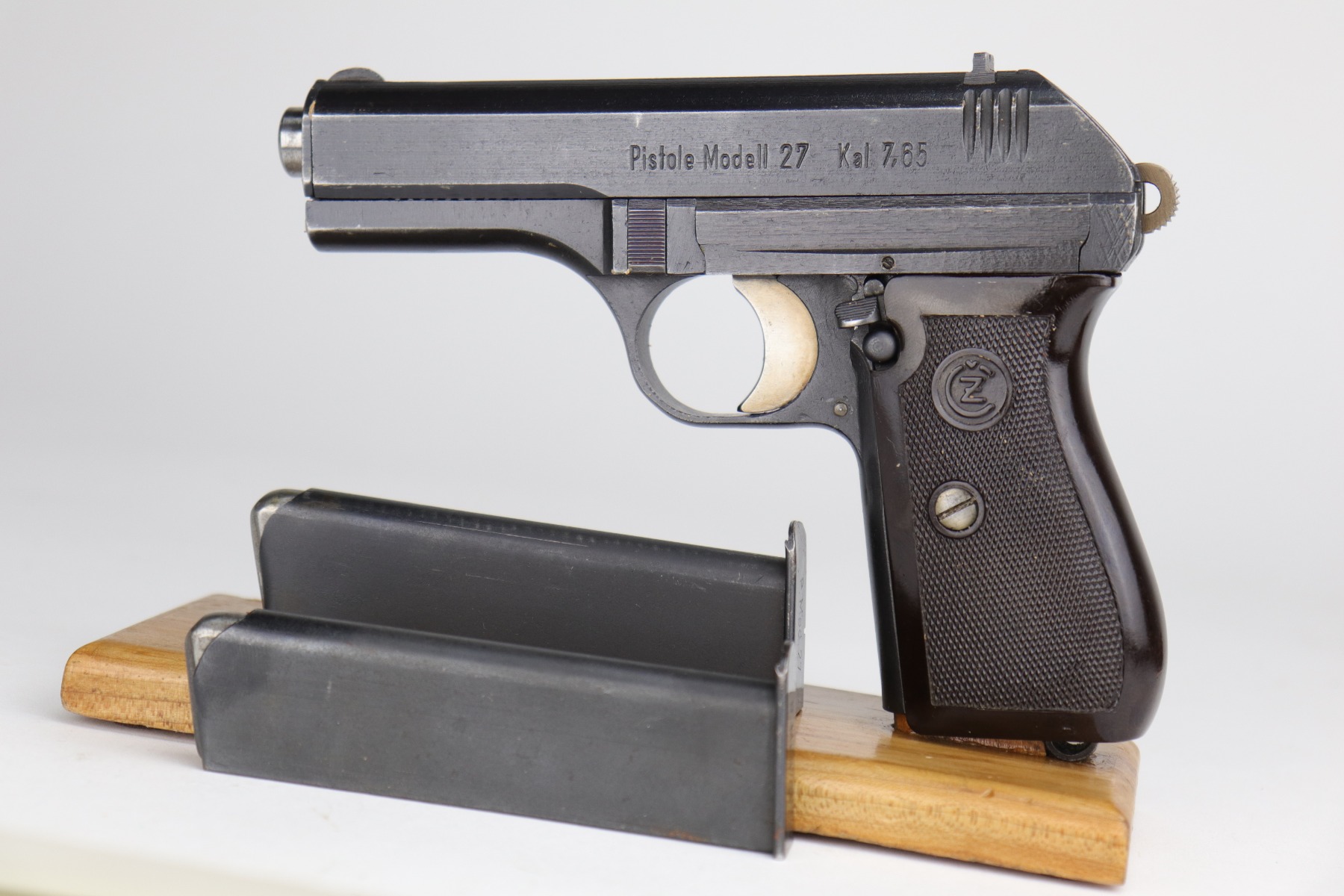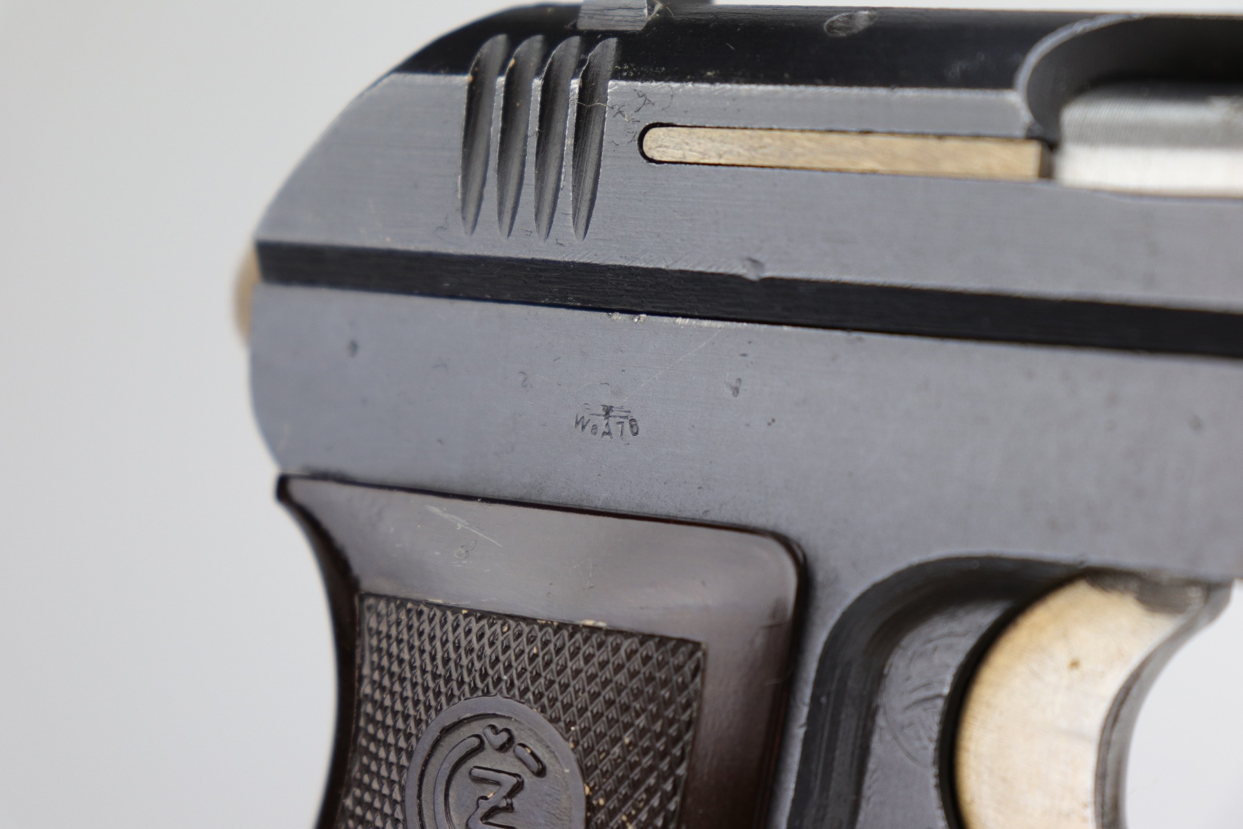 9/30/20 – This is a minty example of a CZ 27 rig issued to the Nazi military during WW2. The rig comes with a period-correct paper holster and two magazines. The gun has the proper “Waffen 76” Nazi military acceptance proof. It is in excellent condition, retaining about 98% of its original finish. There is just some very minor high edge wear on the slide, and a few very light handling marks here and there. One area of wear on the front strap. There are small dots of oxidation on the frame here and there. Excellent grips – no chips or cracks. There is just one very small surface mark on the right side. The bore is mint. The holster is in decent condition. It is unmarked, except for a name on the inside. The slide does not stay back with one of the magazines but works fine with the other.