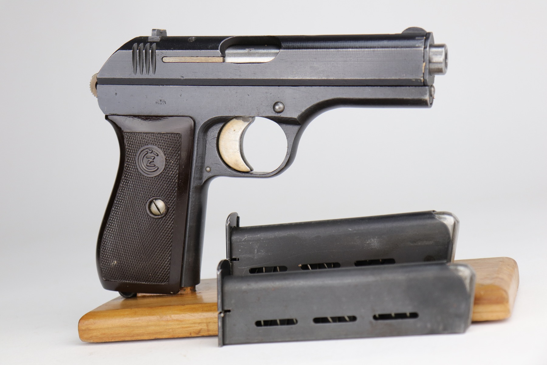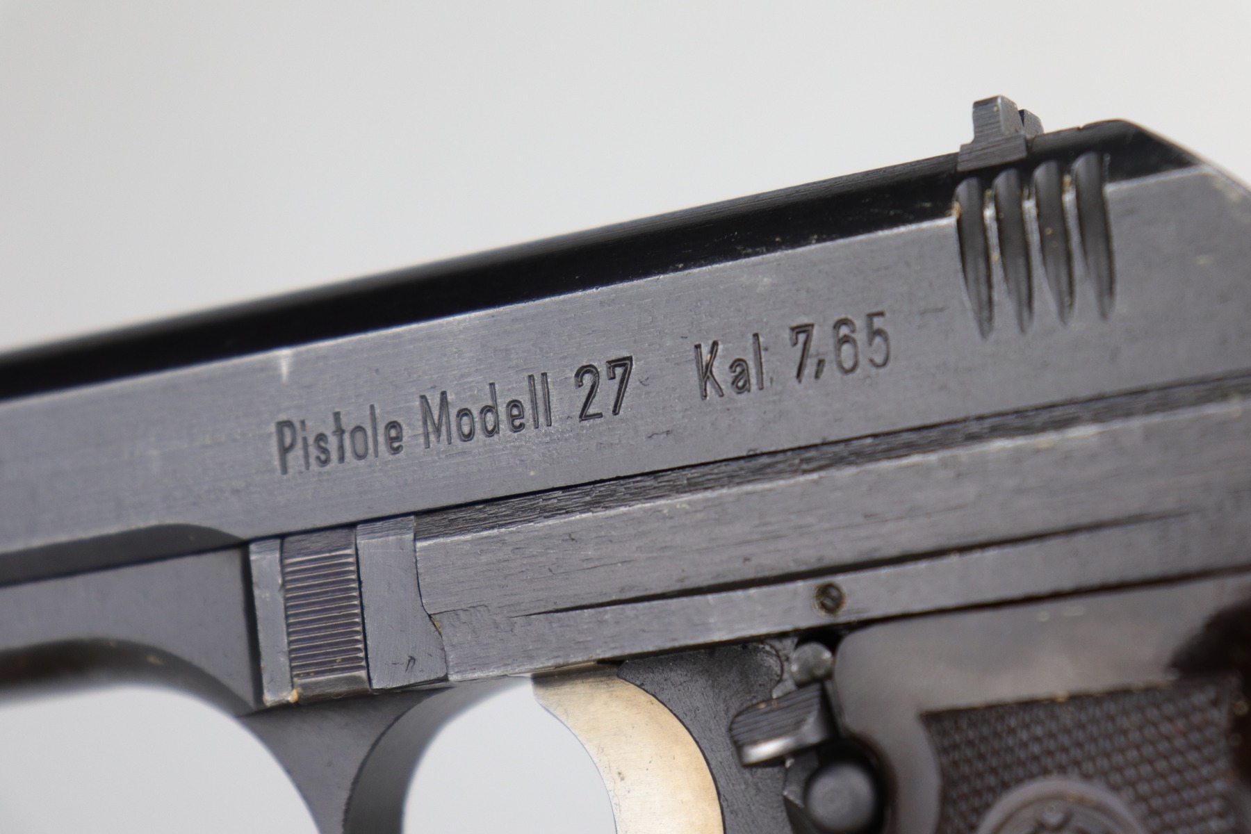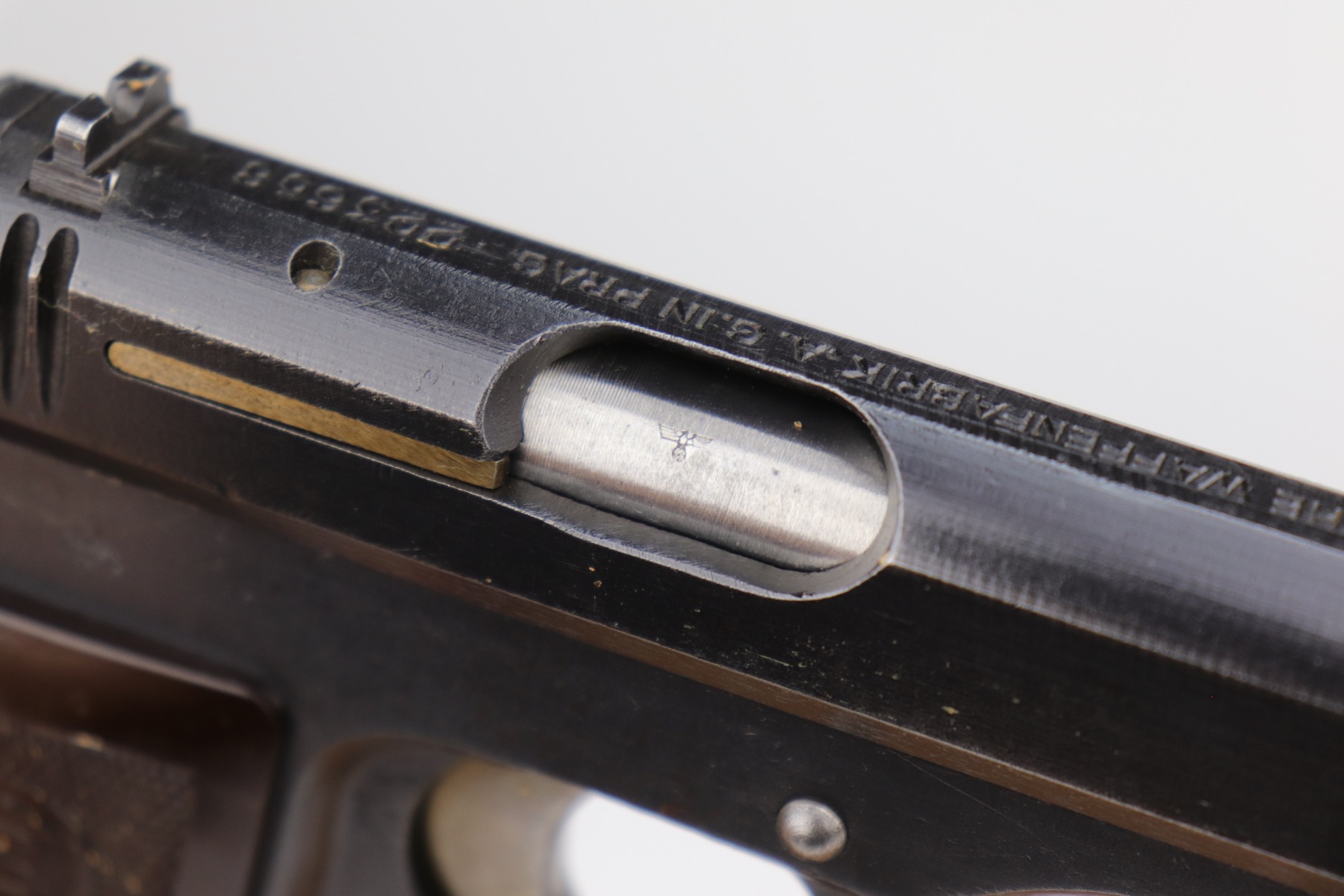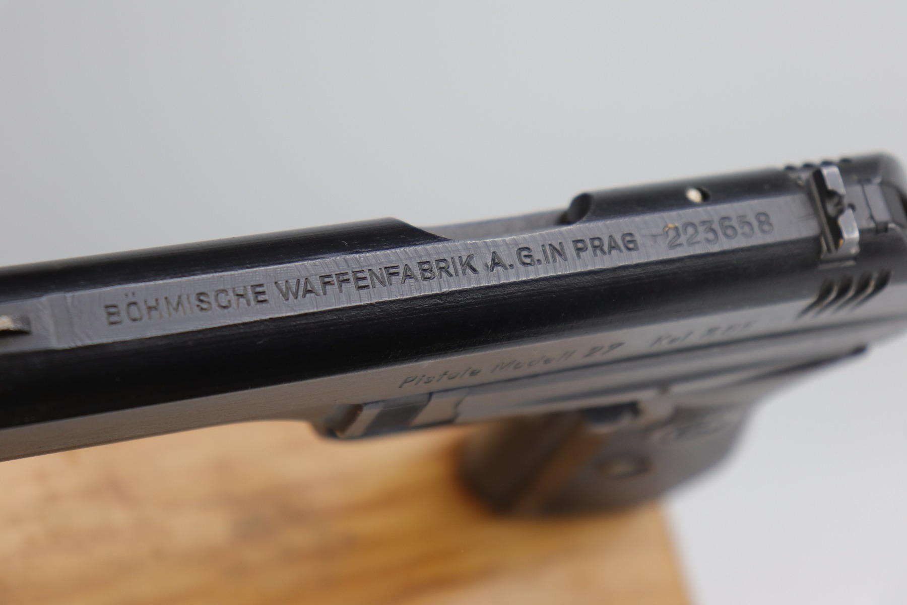 9/30/20 – This is a minty example of a CZ 27 rig issued to the Nazi military during WW2. The rig comes with a period-correct paper holster and two magazines. The gun has the proper “Waffen 76” Nazi military acceptance proof. It is in excellent condition, retaining about 98% of its original finish. There is just some very minor high edge wear on the slide, and a few very light handling marks here and there. One area of wear on the front strap. There are small dots of oxidation on the frame here and there. Excellent grips – no chips or cracks. There is just one very small surface mark on the right side. The bore is mint. The holster is in decent condition. It is unmarked, except for a name on the inside. The slide does not stay back with one of the magazines but works fine with the other.