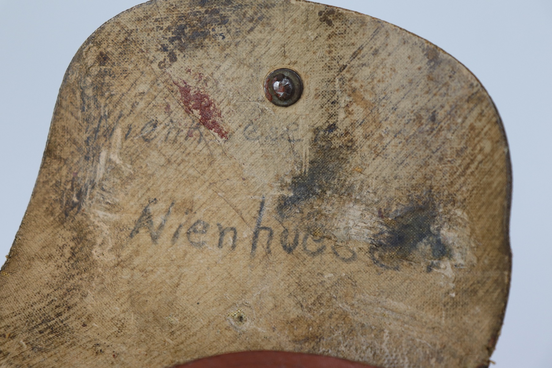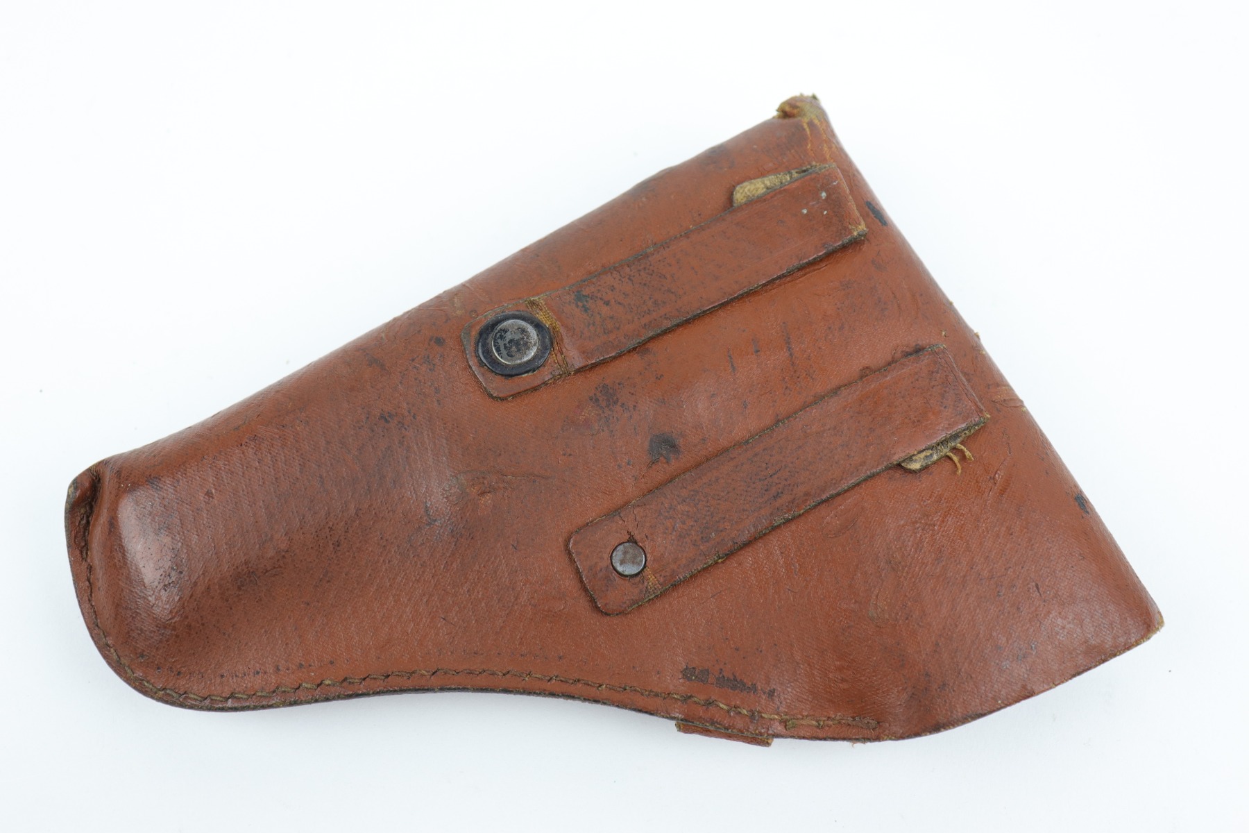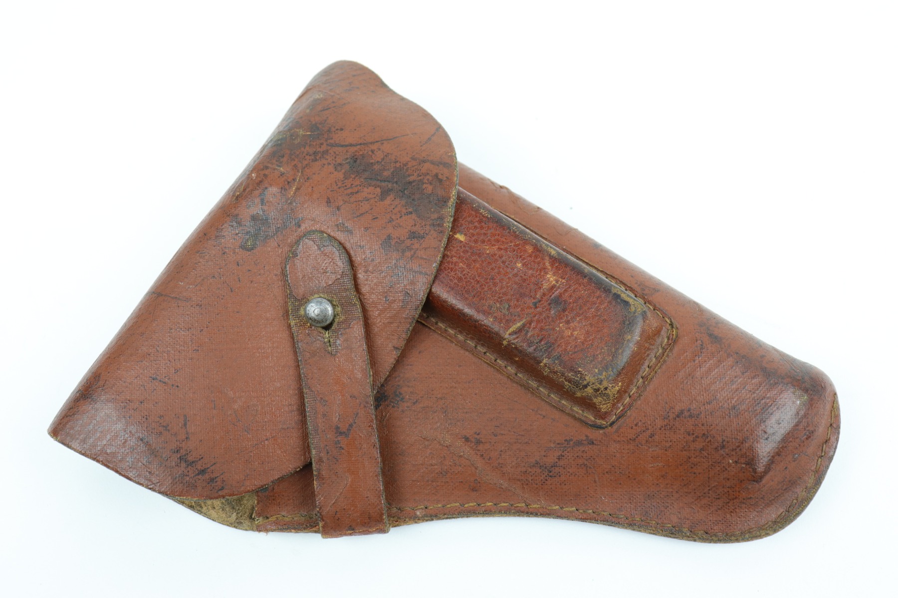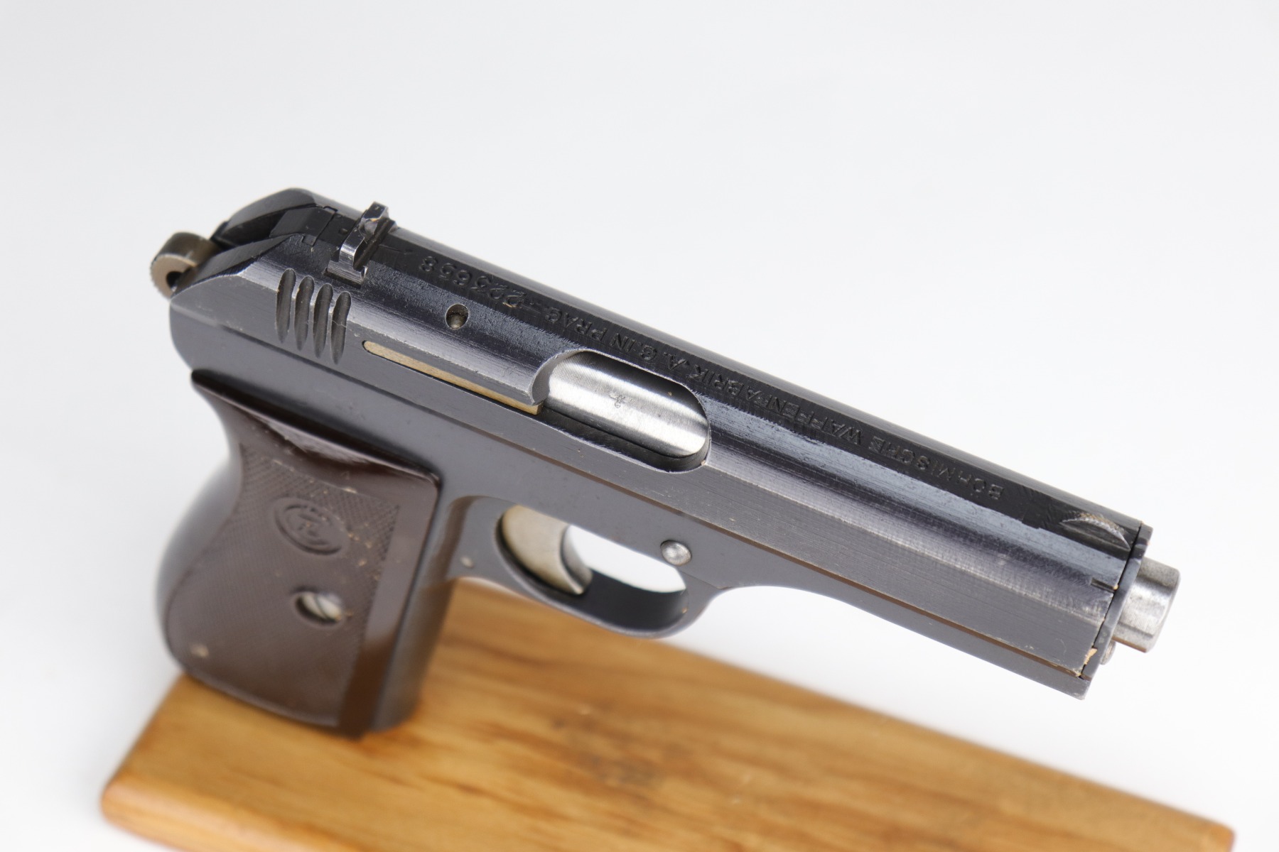 9/30/20 – This is a minty example of a CZ 27 rig issued to the Nazi military during WW2. The rig comes with a period-correct paper holster and two magazines. The gun has the proper “Waffen 76” Nazi military acceptance proof. It is in excellent condition, retaining about 98% of its original finish. There is just some very minor high edge wear on the slide, and a few very light handling marks here and there. One area of wear on the front strap. There are small dots of oxidation on the frame here and there. Excellent grips – no chips or cracks. There is just one very small surface mark on the right side. The bore is mint. The holster is in decent condition. It is unmarked, except for a name on the inside. The slide does not stay back with one of the magazines but works fine with the other.